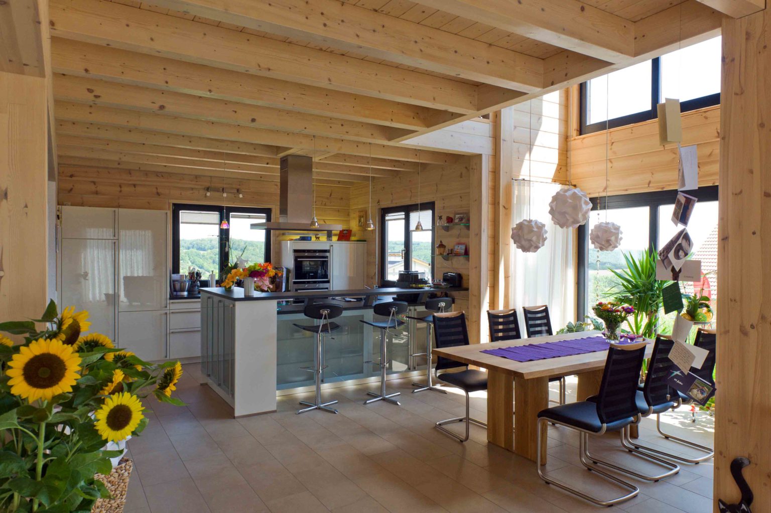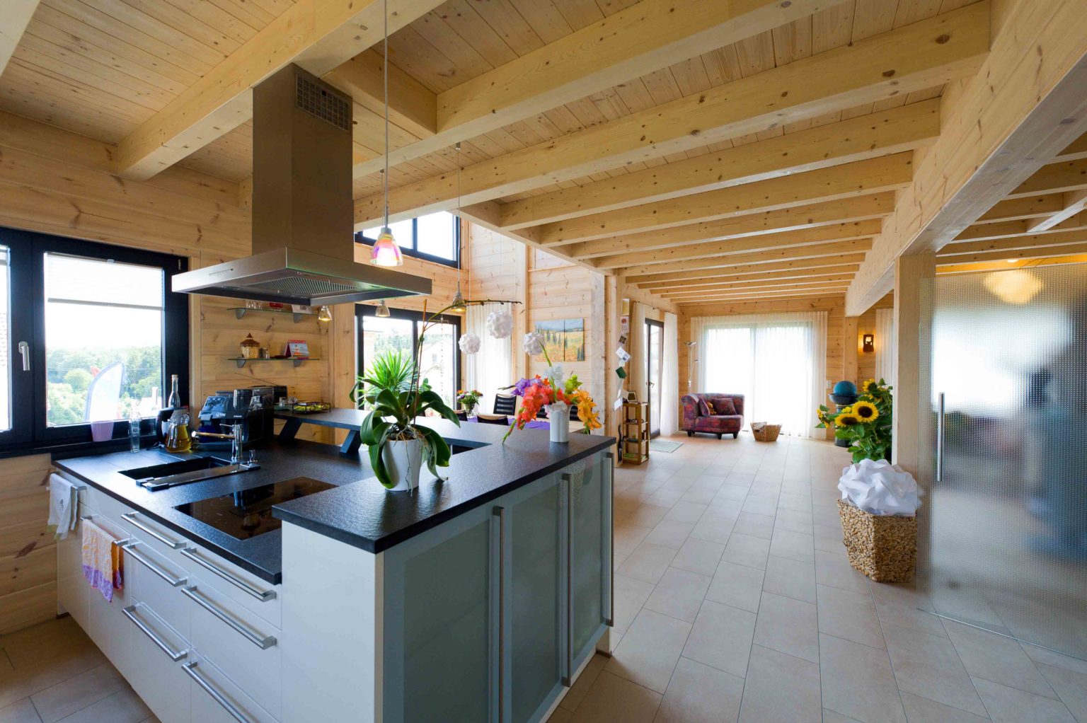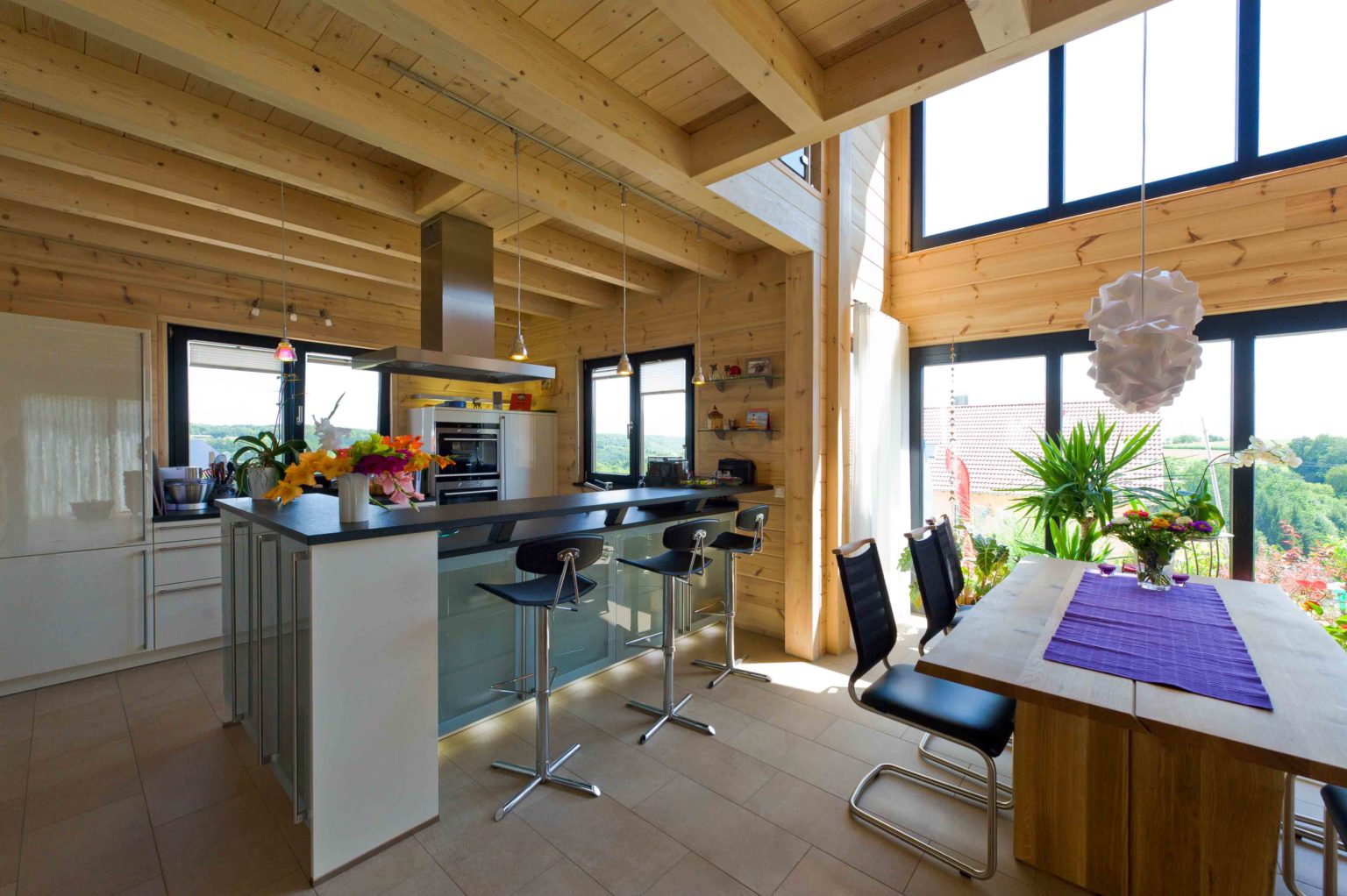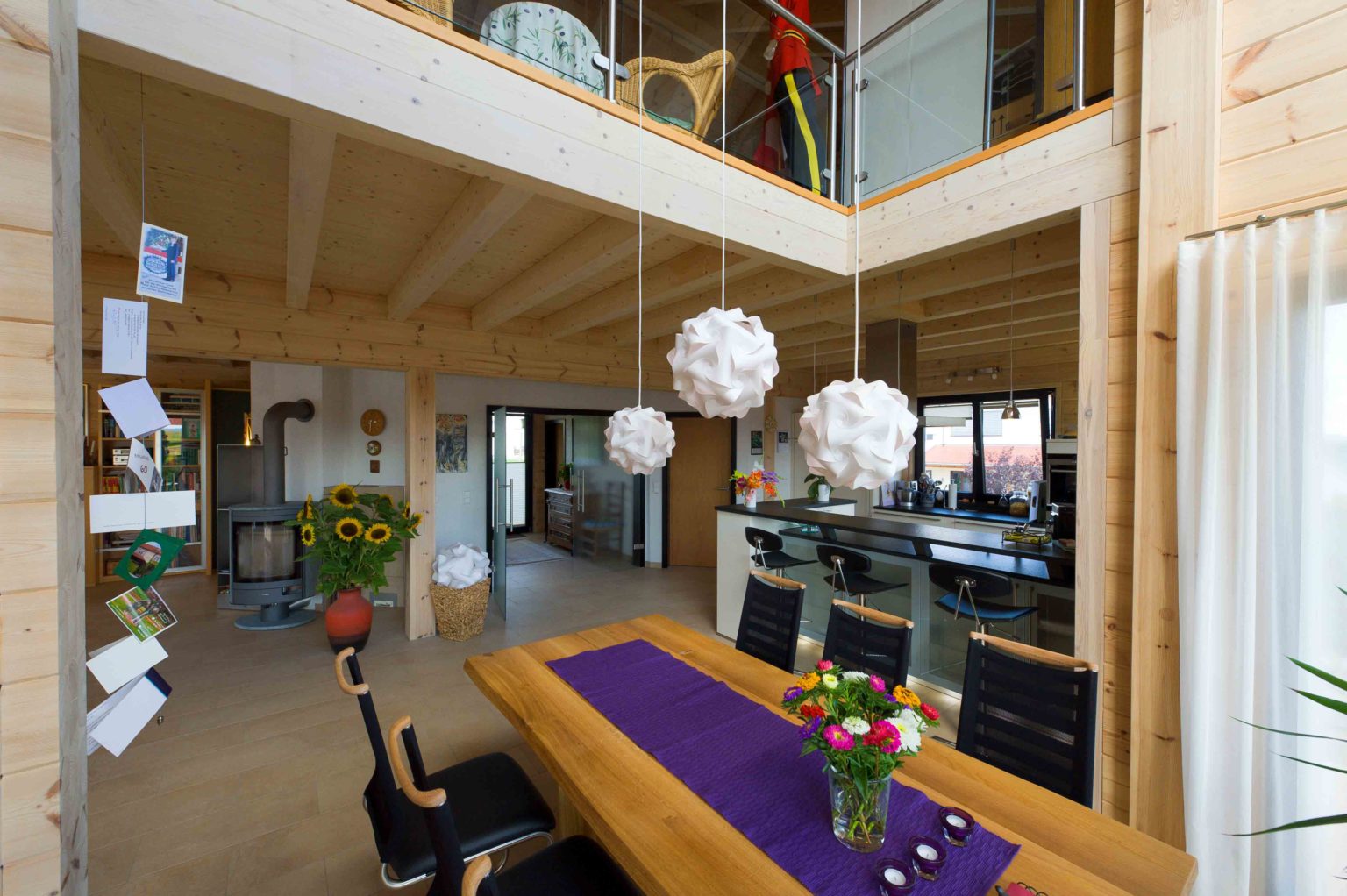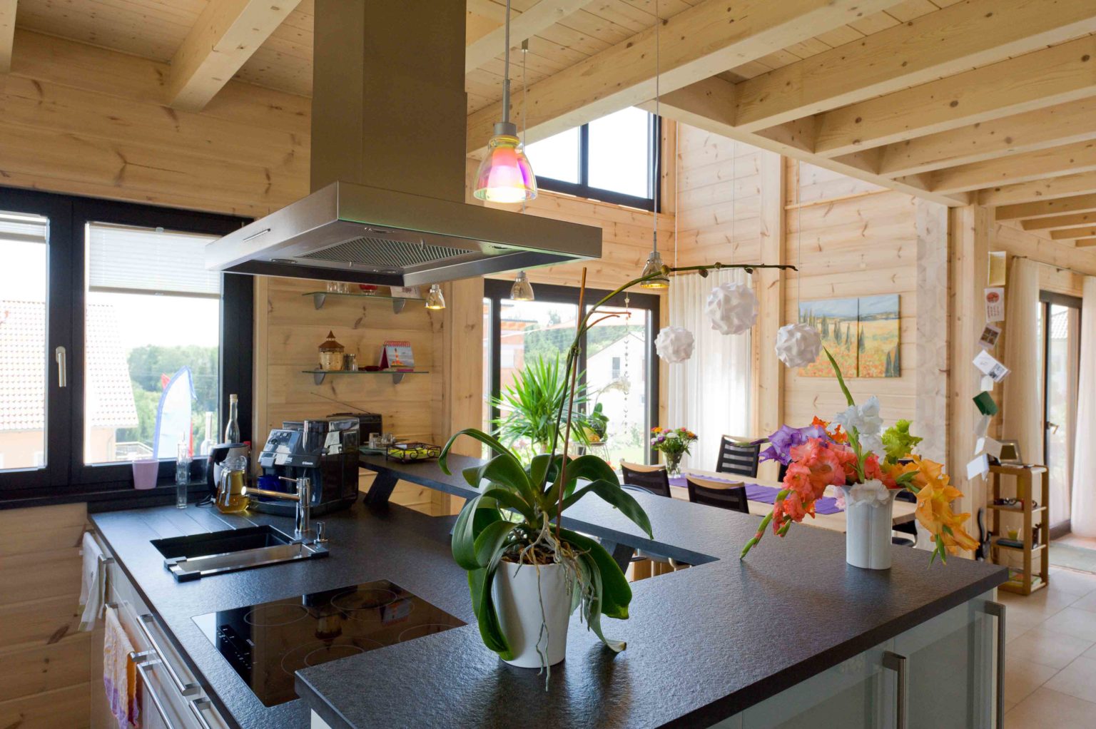 „Wir haben im Obergeschoss Estrich auf die durch Nut und Feder miteinander verbundenen Bodenbretter aufbringen lassen und darauf erst den Kork ausgelegt. So hören Sie hier keinen einzigen Schritt im Haus.“, freut sich der Hausherr. Die in den Hauswänden integrierte Staubsauger-Anlage, eine weitere der vielen Ideen des Hausherrn, erleichtert die Pflege der großen Bodenflächen sehr. Ebenfalls praktisch ist der an die offene Küche angeschlossene Vorratsraum, wo alles Notwendige dezent verschwindet. „Damals haben wir von Bekannten, die zwei Dörfer weiter gebaut hatten, den Tipp für unseren Haushersteller bekommen. Als wir dann dessen modernes, helles Musterhaus besichtigt hatten, ging uns dieses nicht mehr aus dem Kopf.“, erzählt die Dame des Hauses. Später legten sie und ihr Mann dem Holzhausspezialisten dann den selbst erstellten Entwurf ihres Traumhauses vor und nach gemeinsamer Planung mit den Profis konnte Holzhaus „Kocherblick“ verwirklicht werden. Jetzt wird das Vorzeigegebäude ganz vorbildlich Ressourcen schonend über die Fußbodenheizung mit erneuerbaren Energien beheizt (Luft-Wärme-Pumpe) und „grüner“ Solarstrom auf dem Hausdach erzeugt. Dank der winddichten, gut dämmenden Massivholzwände und dem erwiesenen psychologischen Effekt, sich in Holzwänden schon bei niedrigeren Temperaturen behaglich zu fühlen, bleibt auch der Heizenergiebedarf des Klima freundlich hergestellten und gebauten Wohnhauses „im grünen Bereich“. Im Obergeschoss erreicht man von der großflächigen Galerie die intimen Rückzugsräume des Ehepaares, nämlich das Schlafzimmer nebst Ankleide und daran angeschlossen das Wohnbad. Auch von der Galerie ist die Aussicht nach draußen, übers Land, so beeindruckend wie überall in der Blockhaus Villa – selbst beim Kochen muss man aufpassen, die Essenszubereitung nicht träumend beim Blick durchs große Küchenfenster zu vergessen. Und während der Hausherr noch die hervorragende Qualität des verbauten Holzes lobt, sagt seine Frau folgenden, hocherfreulichen Abschlusssatz: „Zufriedener kann man mit seinem Haus gar nicht sein!“