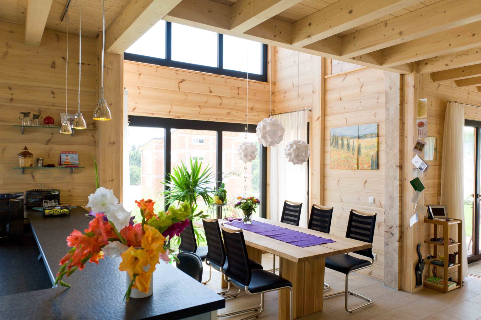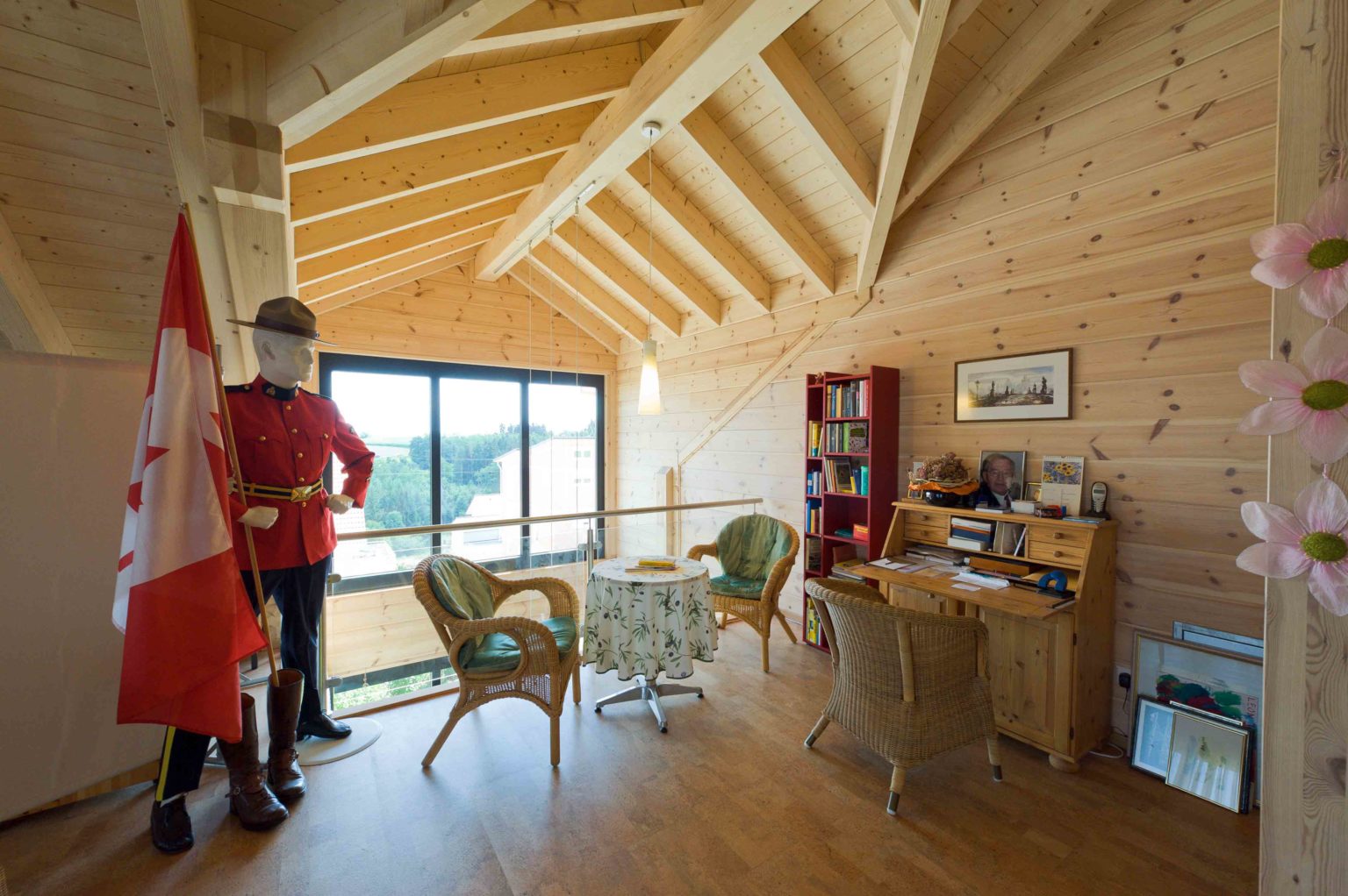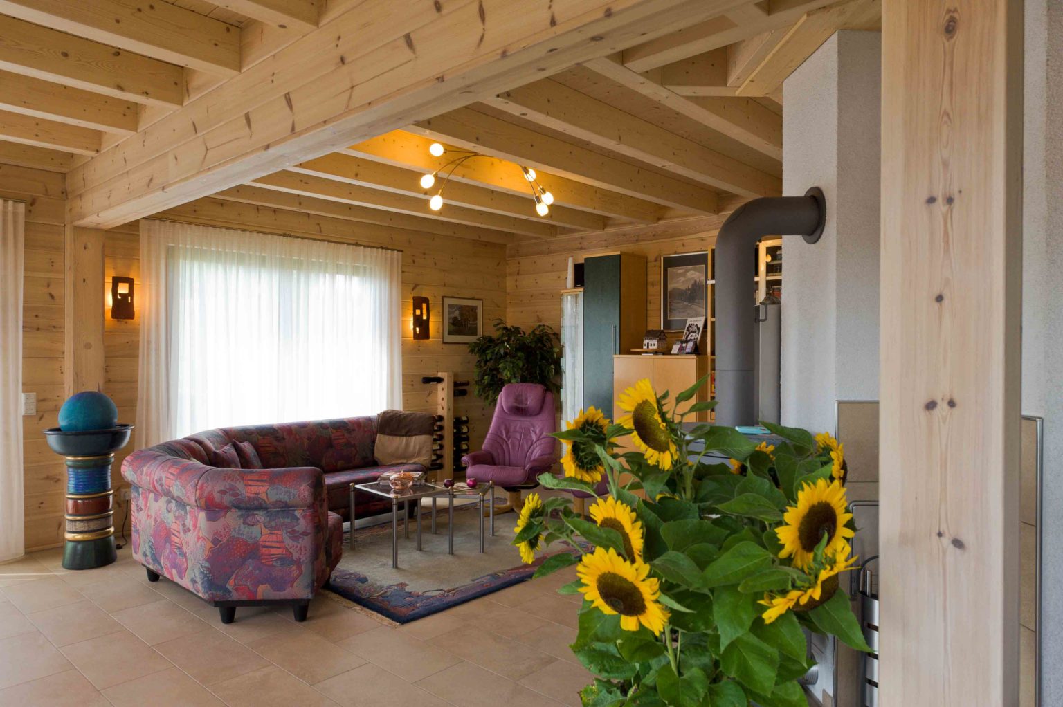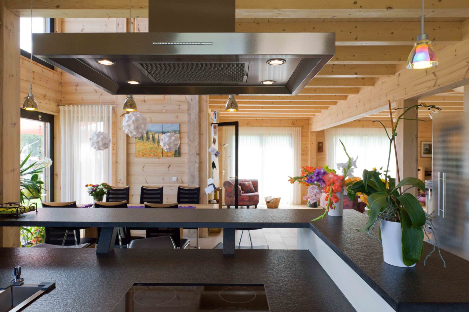„Wir haben im Obergeschoss Estrich auf die durch Nut und Feder miteinander verbundenen Bodenbretter aufbringen lassen und darauf erst den Kork ausgelegt. So hören Sie hier keinen einzigen Schritt im Haus.“, freut sich der Hausherr. Die in den Hauswänden integrierte Staubsauger-Anlage, eine weitere der vielen Ideen des Hausherrn, erleichtert die Pflege der großen Bodenflächen sehr. Ebenfalls praktisch ist der an die offene Küche angeschlossene Vorratsraum, wo alles Notwendige dezent verschwindet. „Damals haben wir von Bekannten, die zwei Dörfer weiter gebaut hatten, den Tipp für unseren Haushersteller bekommen. Als wir dann dessen modernes, helles Musterhaus besichtigt hatten, ging uns dieses nicht mehr aus dem Kopf.“, erzählt die Dame des Hauses. Später legten sie und ihr Mann dem Holzhausspezialisten dann den selbst erstellten Entwurf ihres Traumhauses vor und nach gemeinsamer Planung mit den Profis konnte Holzhaus „Kocherblick“ verwirklicht werden. Jetzt wird das Vorzeigegebäude ganz vorbildlich Ressourcen schonend über die Fußbodenheizung mit erneuerbaren Energien beheizt (Luft-Wärme-Pumpe) und „grüner“ Solarstrom auf dem Hausdach erzeugt. Dank der winddichten, gut dämmenden Massivholzwände und dem erwiesenen psychologischen Effekt, sich in Holzwänden schon bei niedrigeren Temperaturen behaglich zu fühlen, bleibt auch der Heizenergiebedarf des Klima freundlich hergestellten und gebauten Wohnhauses „im grünen Bereich“. Im Obergeschoss erreicht man von der großflächigen Galerie die intimen Rückzugsräume des Ehepaares, nämlich das Schlafzimmer nebst Ankleide und daran angeschlossen das Wohnbad. Auch von der Galerie ist die Aussicht nach draußen, übers Land, so beeindruckend wie überall in der Blockhaus Villa – selbst beim Kochen muss man aufpassen, die Essenszubereitung nicht träumend beim Blick durchs große Küchenfenster zu vergessen. Und während der Hausherr noch die hervorragende Qualität des verbauten Holzes lobt, sagt seine Frau folgenden, hocherfreulichen Abschlusssatz: „Zufriedener kann man mit seinem Haus gar nicht sein!“