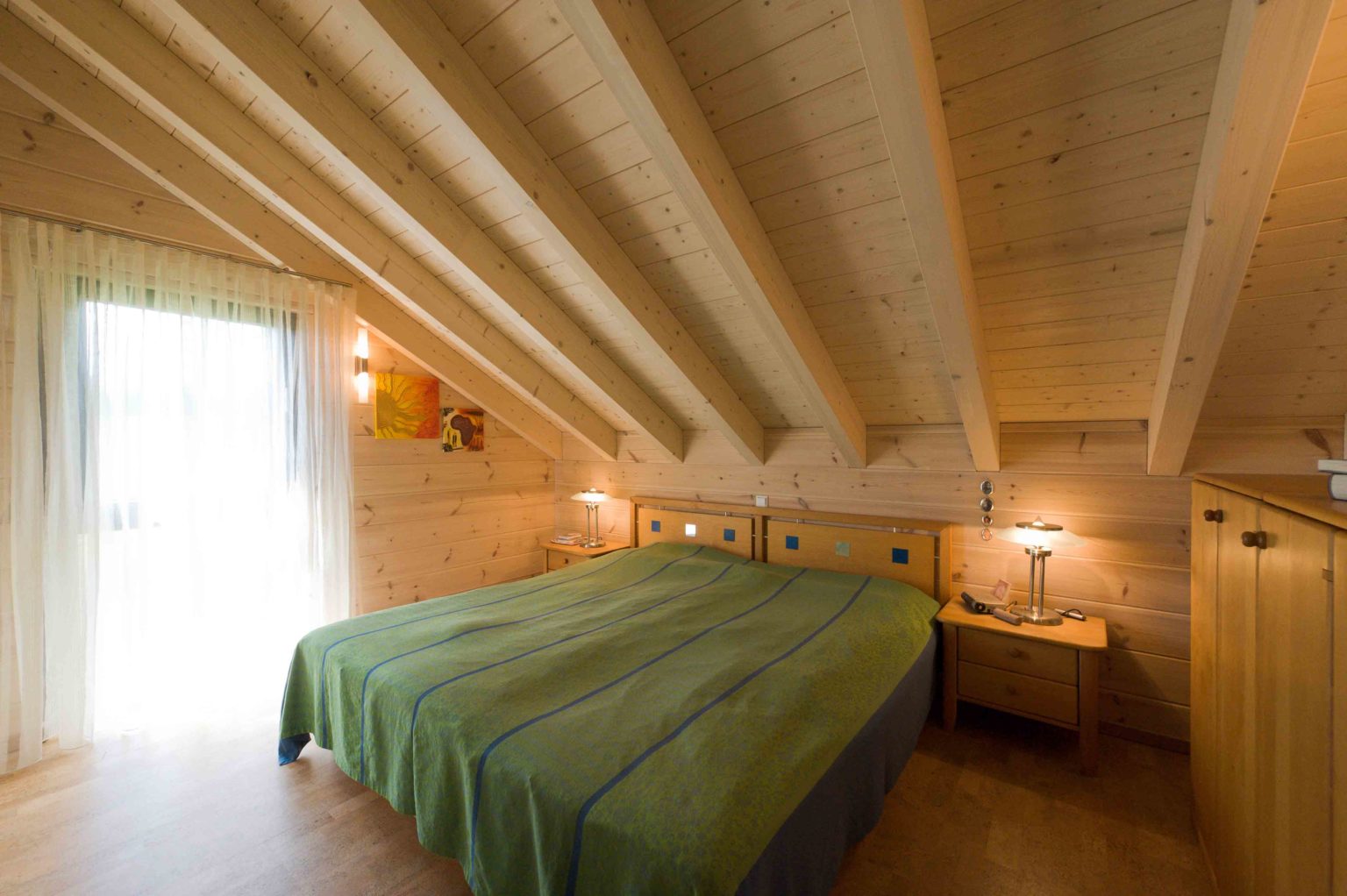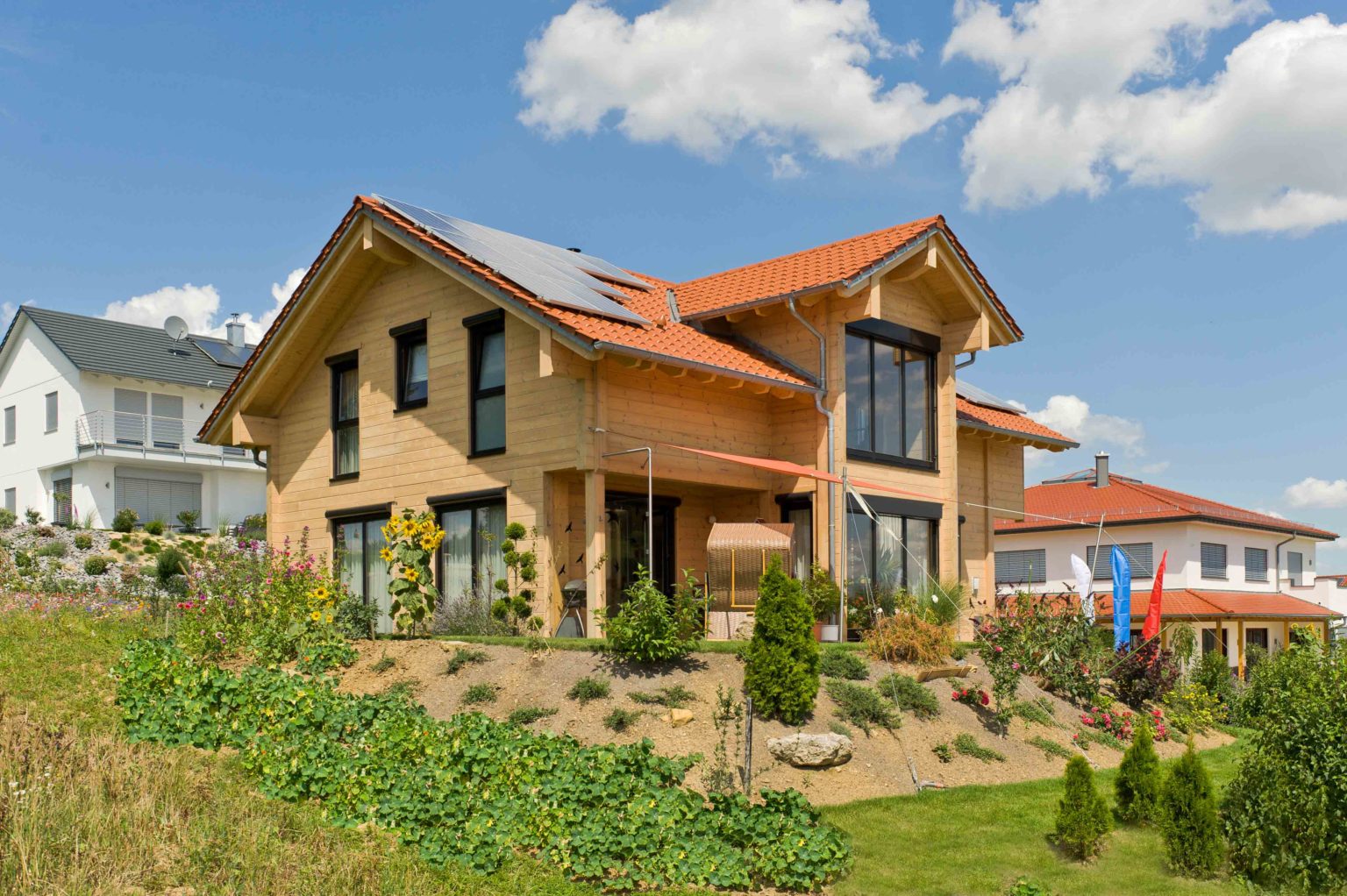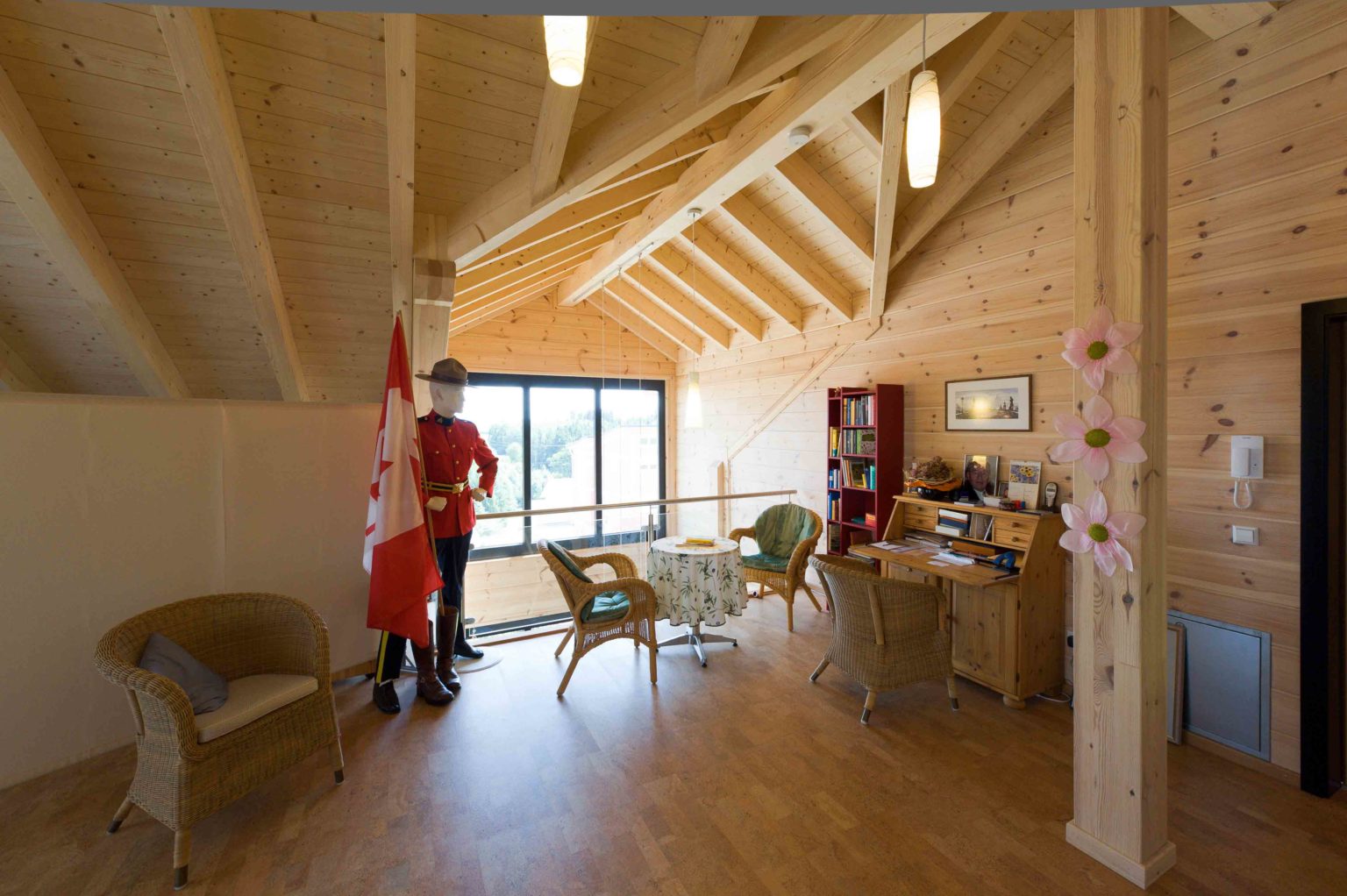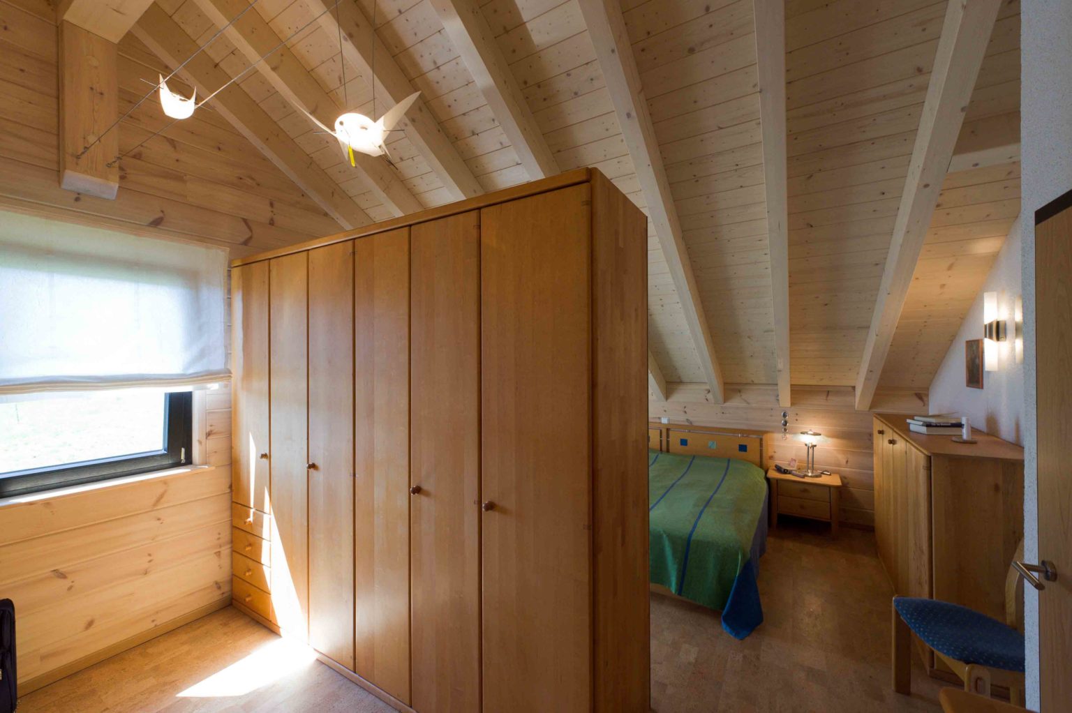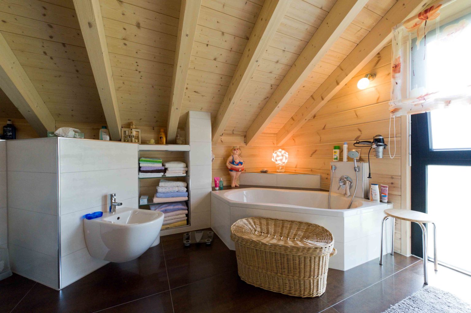 „Wir haben im Obergeschoss Estrich auf die durch Nut und Feder miteinander verbundenen Bodenbretter aufbringen lassen und darauf erst den Kork ausgelegt. So hören Sie hier keinen einzigen Schritt im Haus.“, freut sich der Hausherr. Die in den Hauswänden integrierte Staubsauger-Anlage, eine weitere der vielen Ideen des Hausherrn, erleichtert die Pflege der großen Bodenflächen sehr. Ebenfalls praktisch ist der an die offene Küche angeschlossene Vorratsraum, wo alles Notwendige dezent verschwindet. „Damals haben wir von Bekannten, die zwei Dörfer weiter gebaut hatten, den Tipp für unseren Haushersteller bekommen. Als wir dann dessen modernes, helles Musterhaus besichtigt hatten, ging uns dieses nicht mehr aus dem Kopf.“, erzählt die Dame des Hauses. Später legten sie und ihr Mann dem Holzhausspezialisten dann den selbst erstellten Entwurf ihres Traumhauses vor und nach gemeinsamer Planung mit den Profis konnte Holzhaus „Kocherblick“ verwirklicht werden. Jetzt wird das Vorzeigegebäude ganz vorbildlich Ressourcen schonend über die Fußbodenheizung mit erneuerbaren Energien beheizt (Luft-Wärme-Pumpe) und „grüner“ Solarstrom auf dem Hausdach erzeugt. Dank der winddichten, gut dämmenden Massivholzwände und dem erwiesenen psychologischen Effekt, sich in Holzwänden schon bei niedrigeren Temperaturen behaglich zu fühlen, bleibt auch der Heizenergiebedarf des Klima freundlich hergestellten und gebauten Wohnhauses „im grünen Bereich“. Im Obergeschoss erreicht man von der großflächigen Galerie die intimen Rückzugsräume des Ehepaares, nämlich das Schlafzimmer nebst Ankleide und daran angeschlossen das Wohnbad. Auch von der Galerie ist die Aussicht nach draußen, übers Land, so beeindruckend wie überall in der Blockhaus Villa – selbst beim Kochen muss man aufpassen, die Essenszubereitung nicht träumend beim Blick durchs große Küchenfenster zu vergessen. Und während der Hausherr noch die hervorragende Qualität des verbauten Holzes lobt, sagt seine Frau folgenden, hocherfreulichen Abschlusssatz: „Zufriedener kann man mit seinem Haus gar nicht sein!“