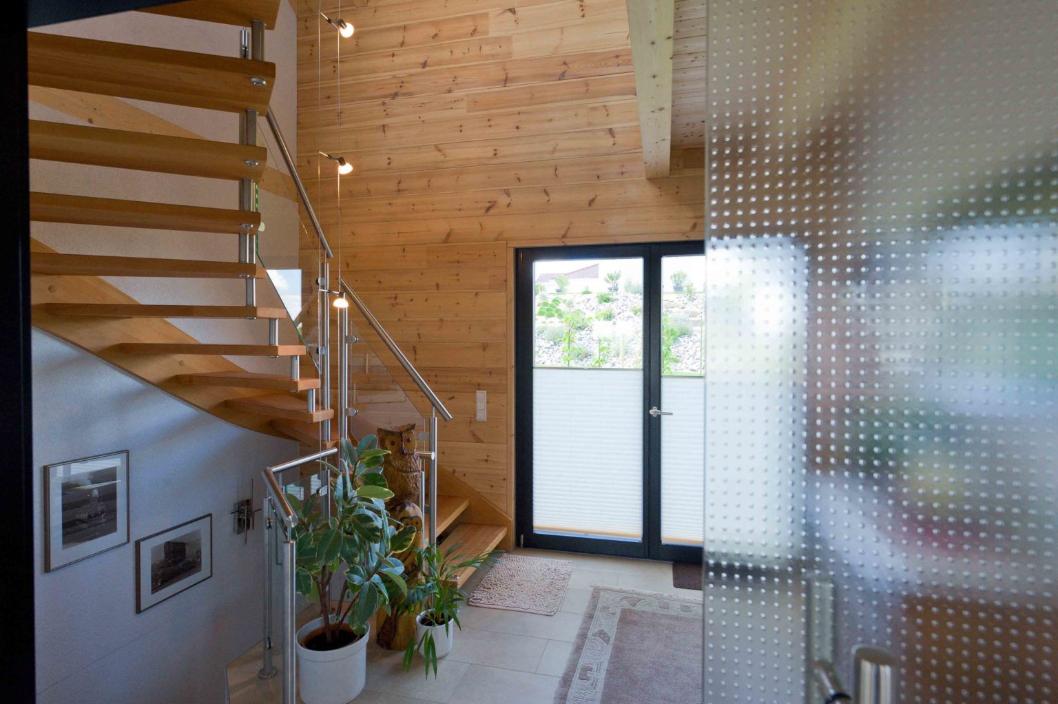 „Wir wünschten uns für den zweiten Lebensabschnitt ein großzügiges, ganz helles, modernes und unbedingt freistehendes Holzhaus. Deshalb zogen wir vom Rande der Großstadt aufs Land.“, erzählt die Dame des Hauses. „Jetzt muss ich zwar noch eine Zeit lang zwischen städtischem Arbeitsplatz und ländlichem Zuhause pendeln, aber die Ruhe und herrliche Aussicht hier machen das allemal wett.“, fährt sie fort. Damit das helle Kiefernholz nicht nachdunkelt, hat der Hausherr es innen wie außen eigenhändig nicht nur mit UV-Schutz behandelt, sondern sogar mit einer Lasur aufgehellt, die wenige weiße Pigmente enthält. Die Rahmen der Fenster wurden in Schwarz gewählt und die Balkonbrüstung aus Glas und Stahl gefertigt, um die Modernität des Gebäudes zu unterstreichen; das Dach wurde mit Terrakotta farbigen Tonziegeln gedeckt, die traditionell in die örtliche Hügellandschaft gehören. Auf die Dachziegel wiederum wurde der Anstrich des gemauerten Kellergeschosses farblich abgestimmt, so dass ein harmonisches Äußeres entstand, zu dem auch die symmetrische Fensteranordnung beiträgt. Die Hanglage des Grundstückes in der exklusiven Neubausiedlung erforderte das Untergeschoss, auf dessen Mauern die setzungsfreien Massivholzwände problemlos gesetzt werden konnten. Hier, an der Ostseite des Hauses, befinden sich Hauseingang und Garageneinfahrt.