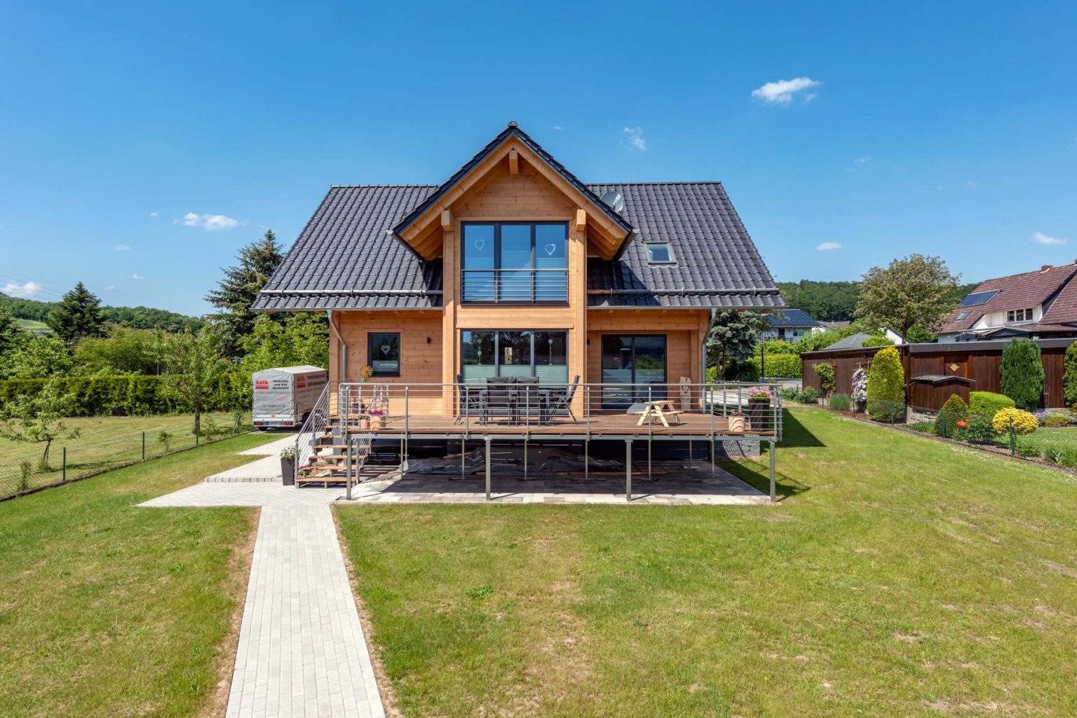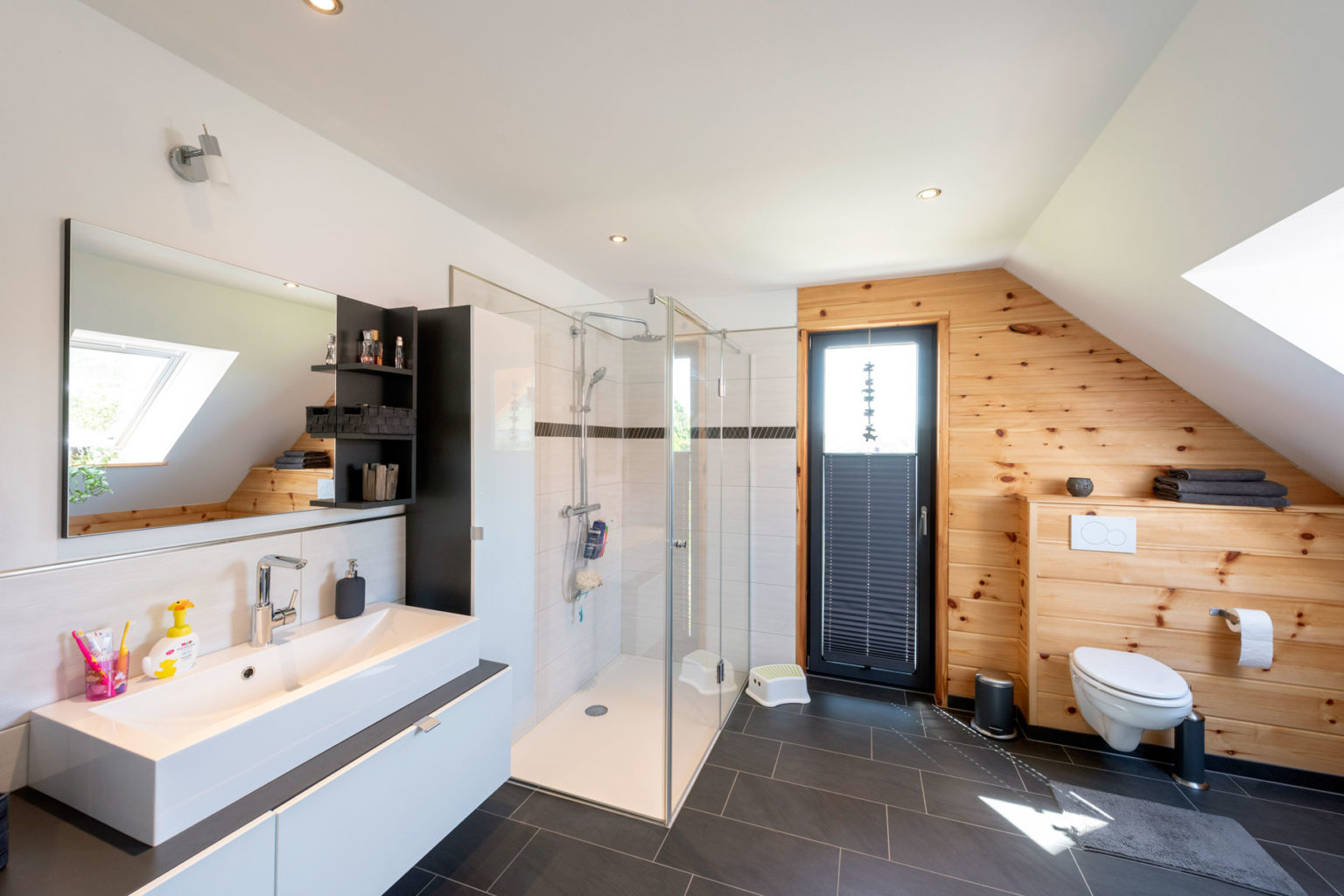 Das Dachgeschoss ist ganz den Hausbewohnern vorbehalten. Dort befinden sich zwei große, helle Kinderzimmer, ein geräumiges Familienbad sowie das gemütliche Schlafzimmer im Zwerchhaus mit angeschlossener Ankleide. Die Räume sind jeweils vom Flur aus zugänglich, wobei man das Schlafzimmer nur durch die Ankleide erreicht. Schlichte weiße Zimmertüren, anthrazite Fensterrahmen und anthrazite Tondachziegel ergänzen den dezenten Stil von Holzhaus „Köterbergblick“. Da das Gebäude unterkellert ist, gibt es genug Stauraum für die Familie, darüber hinaus gibt es einen Dachboden, wo einiges aufbewahrt werden kann. „Besonders schätzen wir das Raumklima in unserem Holzhaus. Es fühlt sich immer sehr angenehm an und ist auch gesund.“, betont Sabrina Schlüter. Die „atmenden“ Holzwände besitzen niemals eine kalte Haptik und sorgen außerdem dafür, dass die gefühlte Raumtemperatur 2-3 Grad höher ist, so dass weniger geheizt werden muss. Eine moderne Luftwärmepumpe sorgt für warmes Brauchwasser (Fußbodenheizung). Aber was wäre ein echtes Holzhaus ohne gemütlichen Kaminofen? Ob nun in Skandinavien oder anderswo: Auch er gehört natürlich zum Holzhaustraum und verwöhnt ganz real den Wohnbereich mit kuscheliger Strahlungswärme und meditativem Flammenspiel – und kann noch mehr: da er wasserführend ist, erwärmt er gleich das Brauchwasser mit.