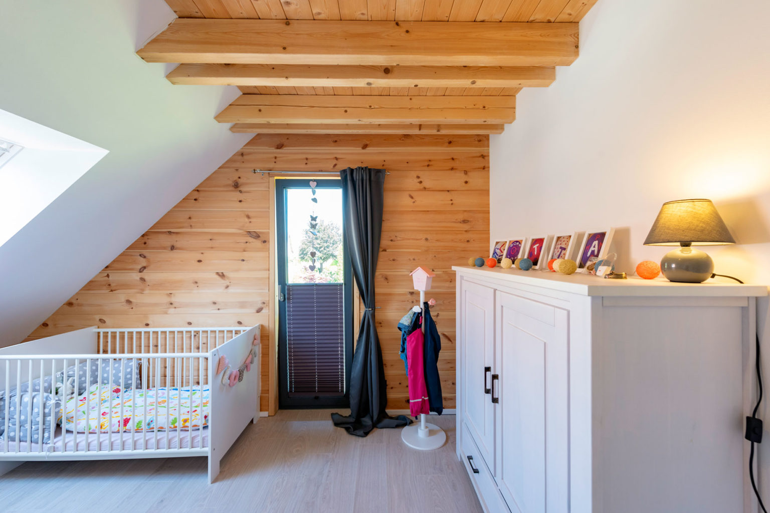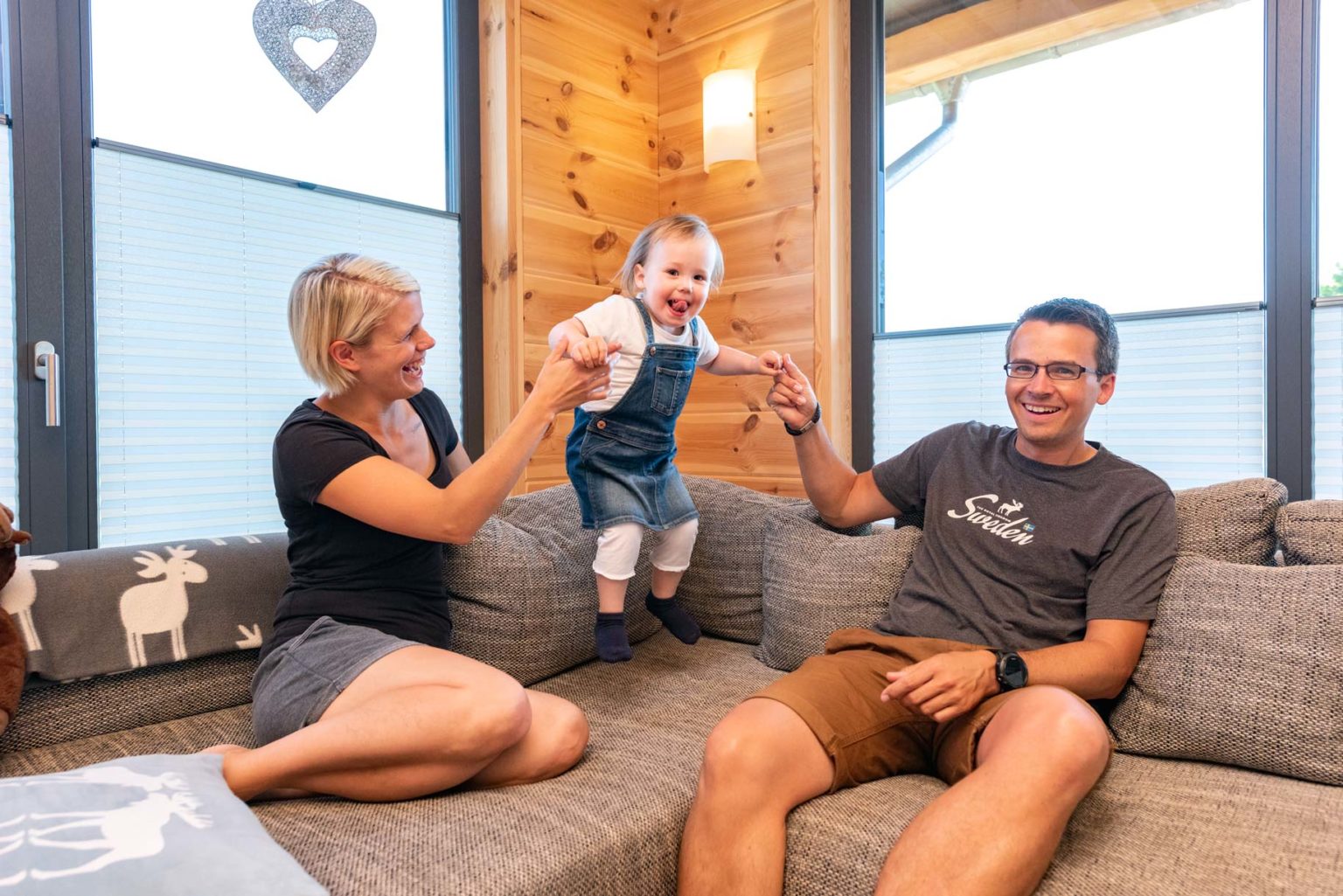 „Zwar wollten wir ein Holzhaus, aber trotzdem nicht ausschließlich Holzwände. Deshalb haben wir uns für weiß verputzte Trennwände entschieden und viele große Glasflächen nach außen eingebaut.“, erklärt die Hausherrin. So ist es drinnen sehr behaglich sowie auch schön hell. Durch die Fenster dringt reichlich natürliches Licht ein, das naturhelle Kiefernholz der Sichtbalkendecken verstrahlt optische Wärme und die Fußböden sind überall – außer in den Bädern – mit aufgehellten Eichendielen verkleidet. „Unser Boden ist immer fußwarm, auch wenn die Fußbodenheizung aus ist, und so hell, wie wir es mögen.“, freut sich der Hausherr. Angenehm ist das auch für die beiden Töchter Lotta & Lille, die mittlerweile das Leben der Schlüters bereichern: wenn sie spielend auf dem Boden sitzen, umherkrabbeln und durch die Räume tapsen kommt keine Kälte von unten. Die klassische aber schnörkellose Architektur von Holzhaus „Köterbergblick“, seine glatten, schlichten Holzwände, die moderne Einrichtung mit viel hellem Holz, viel weiß und etwas grau und schwarz ergeben ein stimmiges und leichtes Bild, ohne Einengung oder Druck, dafür umso mehr Behaglichkeit.