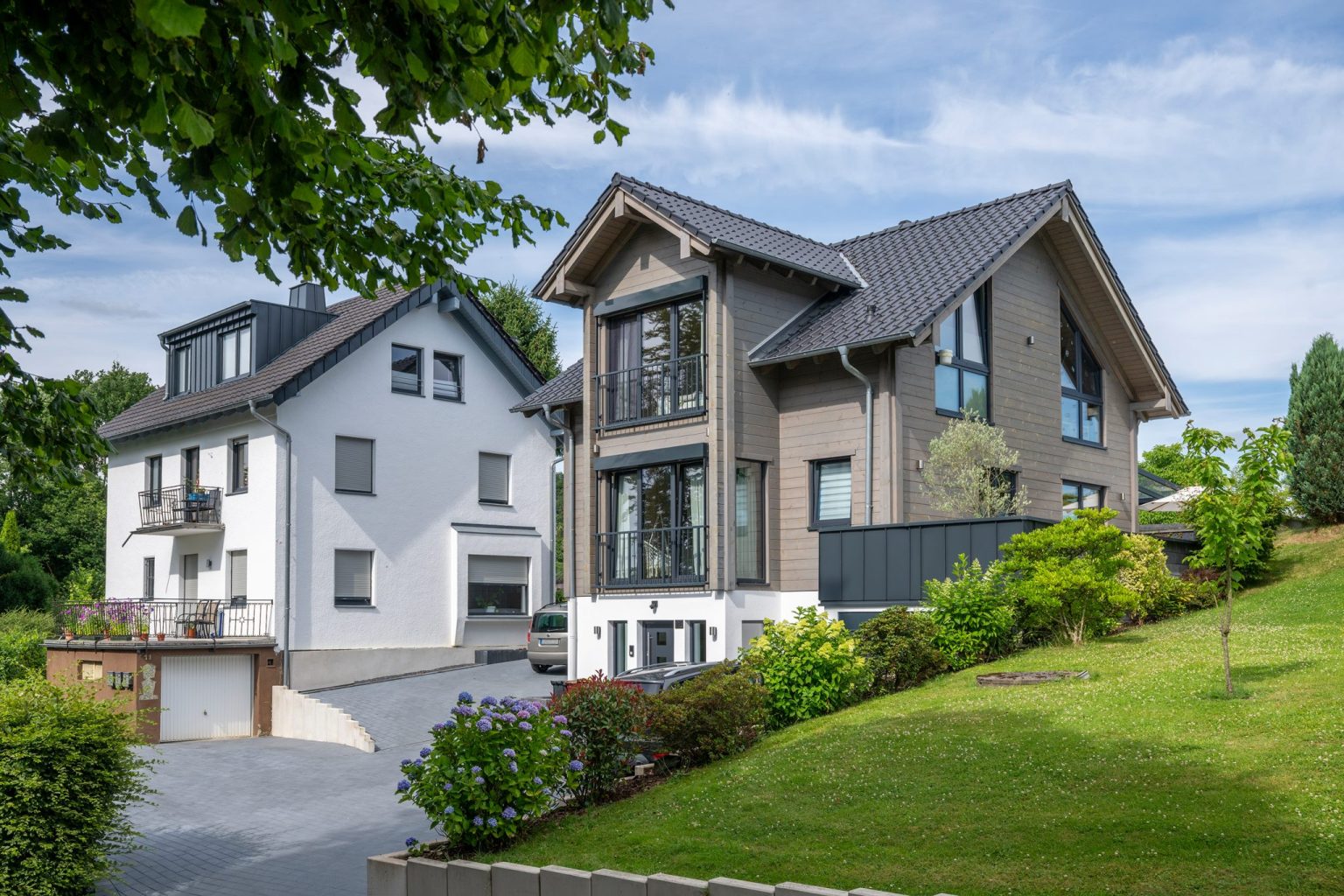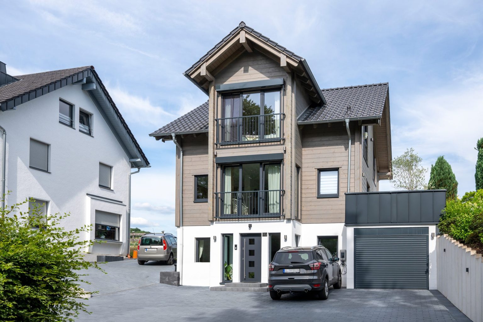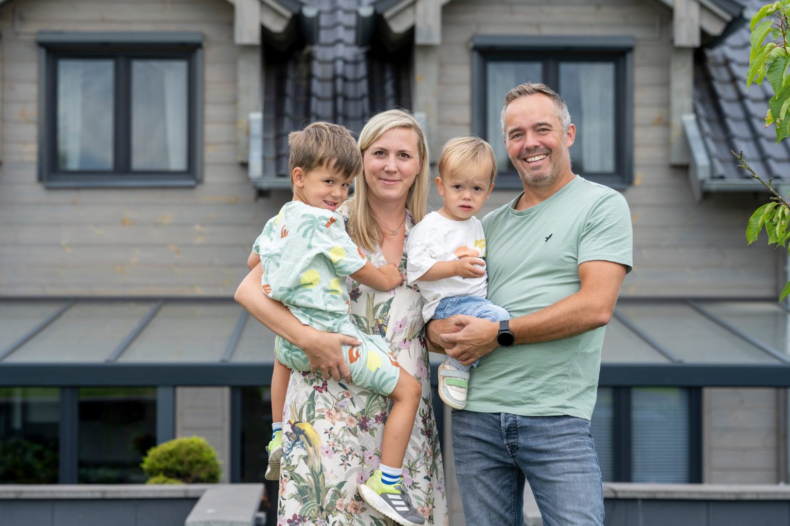 Simon und Christina Marks waren sich einig, dass sie mit ihren Kindern in einem wohngesunden und energieeffizienten Haus leben wollten. Modern sollte ihr Traumhaus aussehen und weiße, glatte Wände und Decken im Innenbereich haben. Es kam also ausschließlich ein Hausbau in Frage, zumal bereits ein Baugrundstück in Familienbesitz war, und hier war der Anspruch an eine nachhaltige Bauweise maßgebend. „An ein massives Holzhaus hatten wir nicht unbedingt gedacht, es aber auch nicht ausgeschlossen.“, sagt Christina Marks. Also sah sie sich zusammen mit ihrem Mann regionale Haushersteller an und blieb bei Fullwood hängen. „Die Beratung war sehr gut und man versuchte nicht, uns irgendetwas aufzudrängen oder auszureden. Wir haben klar geäußert, dass wir innen weder Holzwände noch Holzdecken wollen, uns die Fertigbauweise und die glatte Holzoptik der vertikalen Blockbohlen außen aber sehr gefällt.“, berichtet Simon Marks. Eine Ausnahme machten er und seine Frau dann aber doch bei den Gauben und dem Zwerchhaus (Erker mit 3. Giebel), die aus einschaligen Blockwänden gebaut wurden, während das restliche Holzhaus mit der Kombiblockwand des Holzhaus-Spezialisten montiert wurde. „Da wir in Hanglage mit Kellergeschoss bauen mussten, überzeugte uns vor allem auch die Setzungsfreiheit der Fullwood-Wände. Die konnten einfach auf das gemauerte Untergeschoss gestellt werden.“, fährt der Hausherr fort.