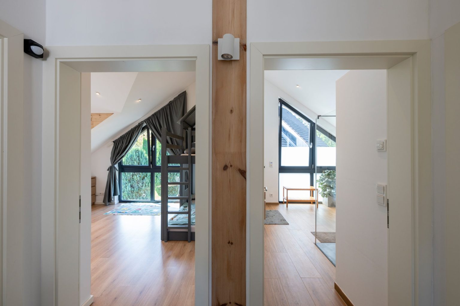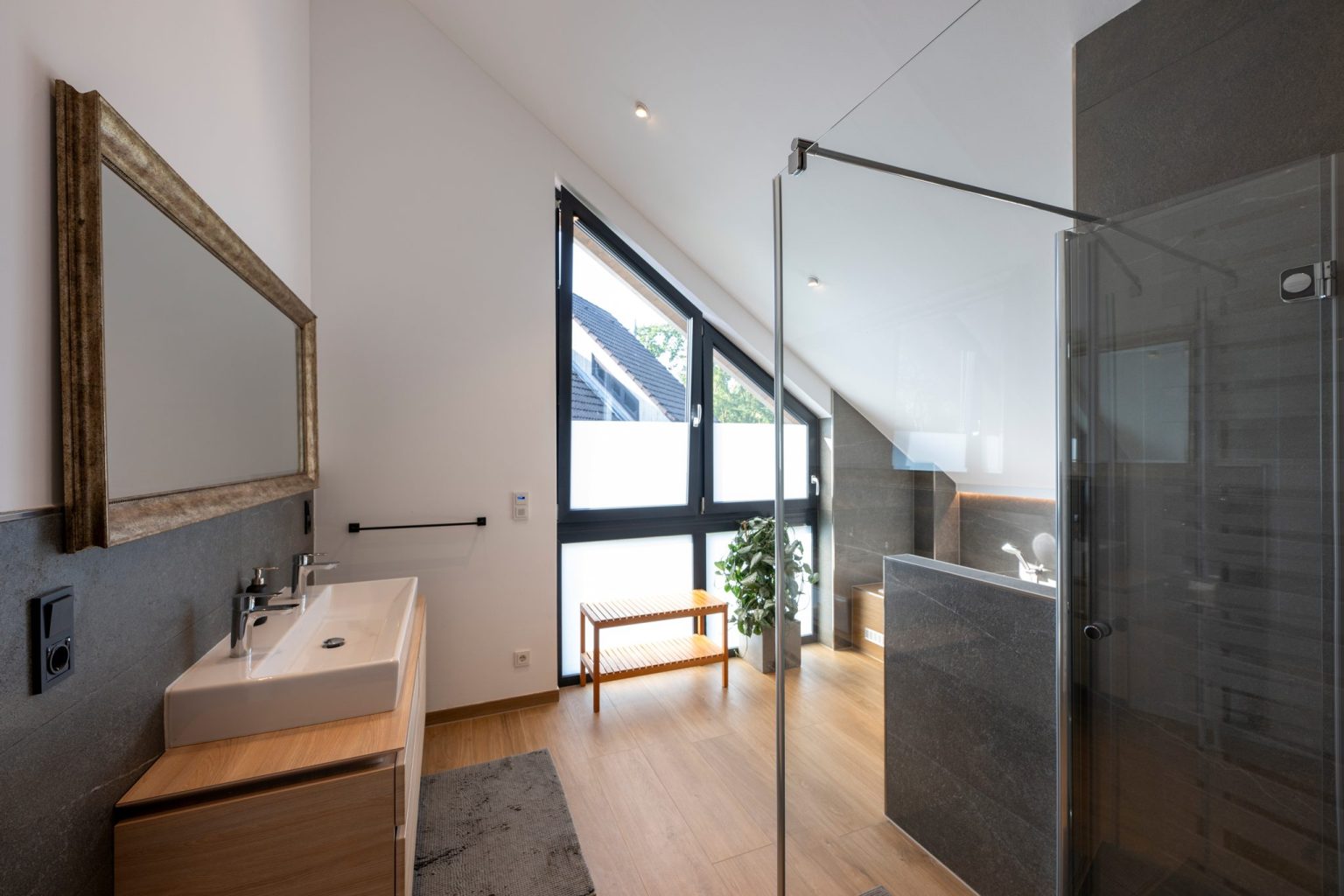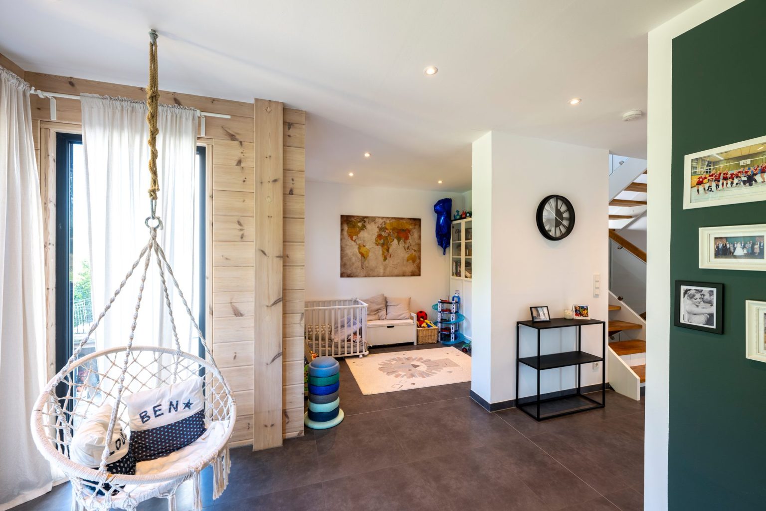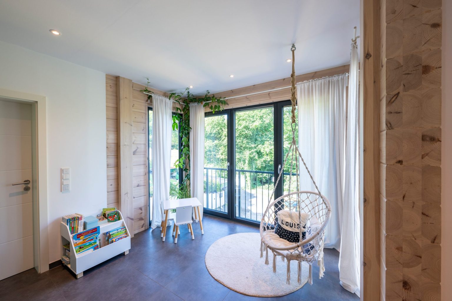 Wie gesagt wurde Holzhaus „Kreuzblick“ ganz individuell nach den Wünschen des Bauherrenpaares und nach der Grundstückssituation sowie der ortsgebundenen Bauvorschrift geplant. Dabei wurde die recht kleine Grundfläche optimal genutzt und der eineinhalbgeschossige Baukörper mit einem zweigeschossigen Zwerchhaus (Erker) sowie zwei Dachgauben ergänzt. Das schafft viel Platz und Stellfläche im Obergeschoss und ist dank der symmetrischen Anordnung optisch sehr ansprechend. Der Hauseingang befindet sich im Untergeschoss, welches nur teilweise im Hang verschwindet und zum Arbeiten aber auch Wohnen genutzt werden kann. Dort befinden sich vom Flur ausgehend ein Büro, ein Fitnessraum und ein Abstellraum/HWR. Über eine transparente Holz-Glas-Treppe geht es hinauf ins Erdgeschoss, wo man vom Flur aus links in die zum Ess- und Wohnzimmer hin offene Küche gelangt oder rechts zu einem offenen Spiel- und Lesebereich im und am Erker. Ein Gäste-WC komplettiert das Raumprogramm im Erdgeschoss, wobei die mit Glas überdachte und mit einer niedrigen Mauer umgebene Terrasse auch noch als Raum bezeichnet werden könnte. Sie schließt sich wie ein offener Wintergarten dem L-förmigen Wohn-/Ess-/Kochbereich über die gesamte Hausbreite an. Von dort geht es dann über ein paar Stufen hinauf in den Garten. Die Holztreppe im Haus endet freilich nicht im Erdgeschoss, sondern führt weiter hinauf ins Obergeschoss. Dort mündet sie auf einem kleinen Flur, von dem man zu zwei Kinderzimmern, zum Schlafzimmer der Eltern mit angeschlossener Ankleide und zum Familienbad gelangt. Besonders heimelig ist das Schlafzimmer, welches sich im firstoffenen, bodentief verglasten Erker befindet, aber auch die Kinderzimmer mit je einer Gaube und bodentiefem Giebelfenster sind sehr behaglich und hell. Dank des bis zum First offenen Luftraums mit sichtbarer Firstpfette und ansonsten weiß gestrichenen Dachschrägen und Wänden wirkt das Dachgeschoss sehr luftig und die Wohnfläche größer, als sie tatsächlich ist. Besonders profitiert Holzhaus „Kreuzblick“ von den vielen, wo es ging bodentiefen Fenstern, die reichlich natürliches Licht in das gesamte Gebäude einlassen, sogar entlang der Treppe. Das Tageslicht wird von den weißen Wänden reflektiert, vervielfacht und ungehindert in die offenen Bereiche geleitet, sodass drinnen alles in Helligkeit erstrahlt. Dazu kontrastierend wählten Simon und Christina Marks Fenster in anthrazit, die farblich identisch mit der Dacheindeckung, der Haustüre und dem Garagentor sind. Die Zimmertüren hingegen sind weiß und verschwinden optisch in den Wänden. Die Außenlasur in einem mittleren Grauton unterstreicht das sachliche und elegant-zurückhaltende Erscheinungsbild des Holzhauses auf dem weiß getünchten Kellergeschoss. Konsequent und perfekt passend dominieren drinnen weiße, graue und anthrazitfarbene Einrichtungs- und Deko-Elemente – kombiniert mit wenig hellem Holz ergeben sie ein cleanes Gesamtbild. Die einzige farbige Ausnahme bildet eine dunkelgrün gestrichene Wand, die sich direkt vis-à-vis des bodentiefen Fensters am Lese- und Spiel-Erker befindet. Die hohen Laubbäume draußen korrespondieren farblich mit dieser Wand und in Kombination mit der hellen Kiefernwand des Erkers wähnt man sich in einer behaglichen Ruhe-Oase, in der es sich wunderbar entspannen lässt.