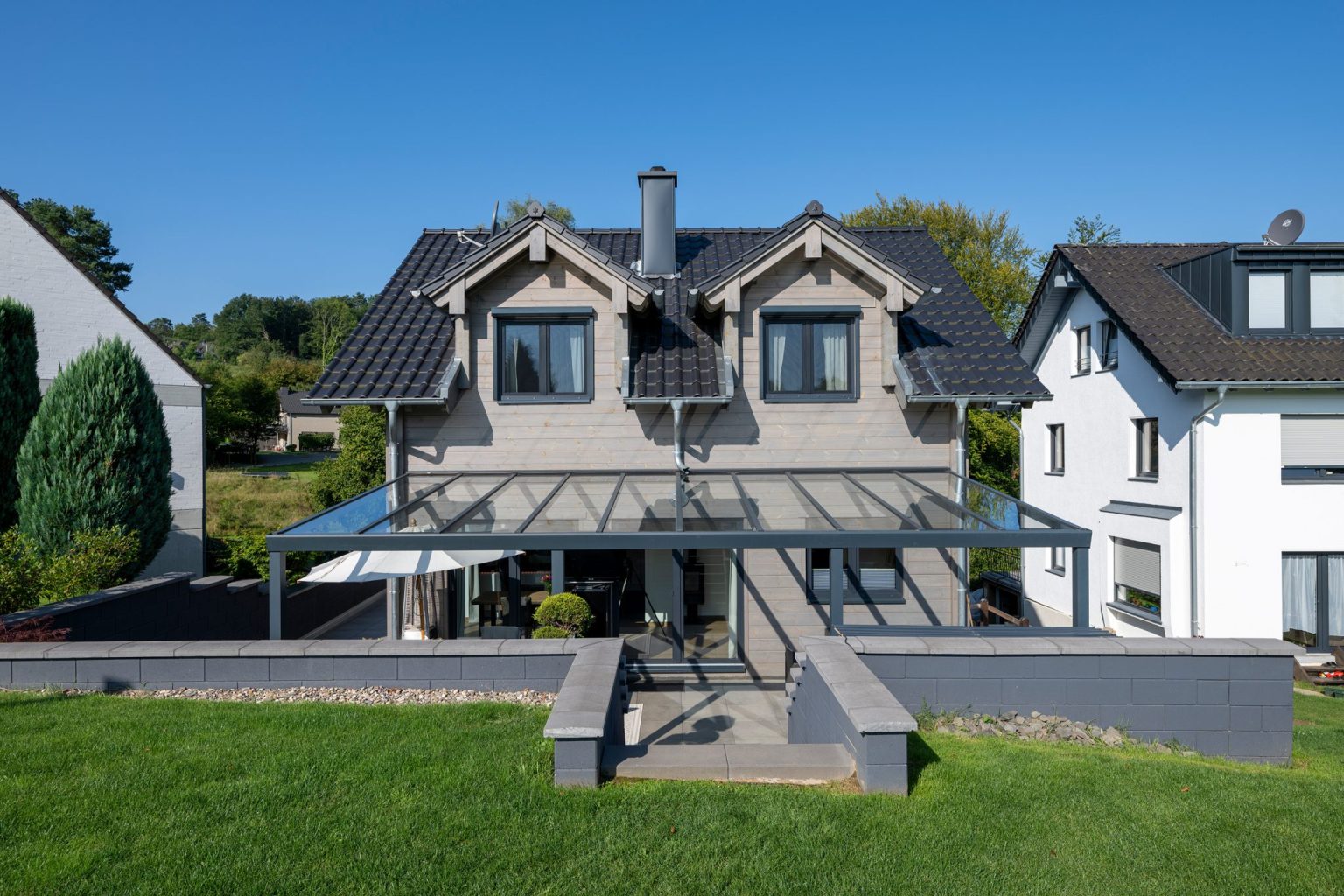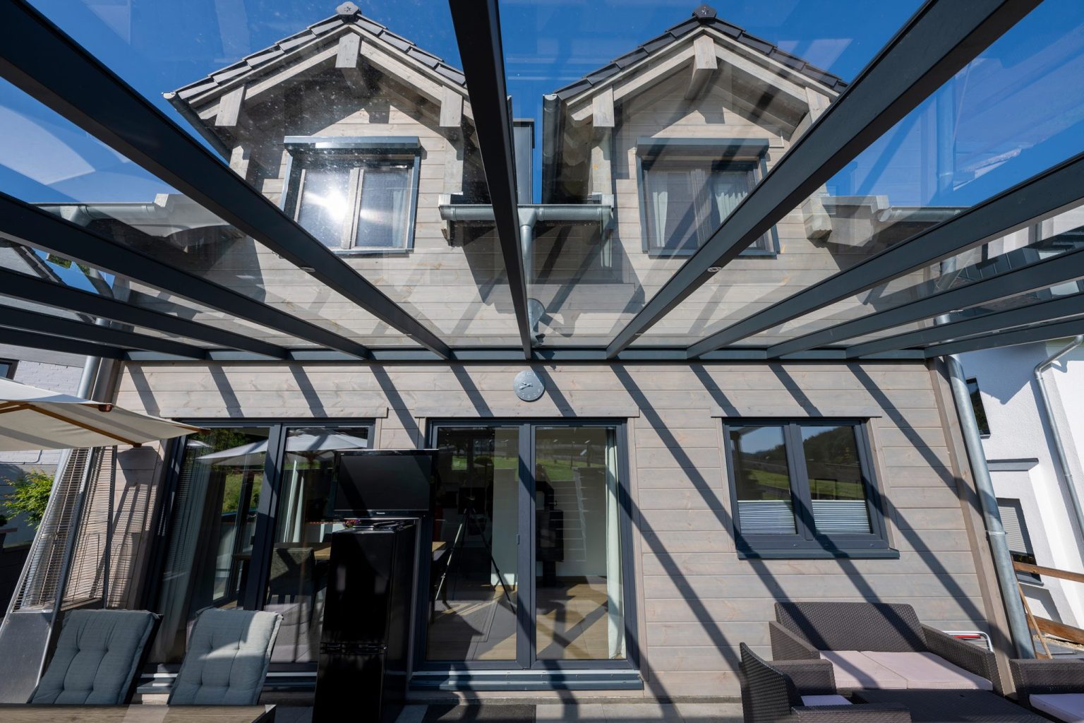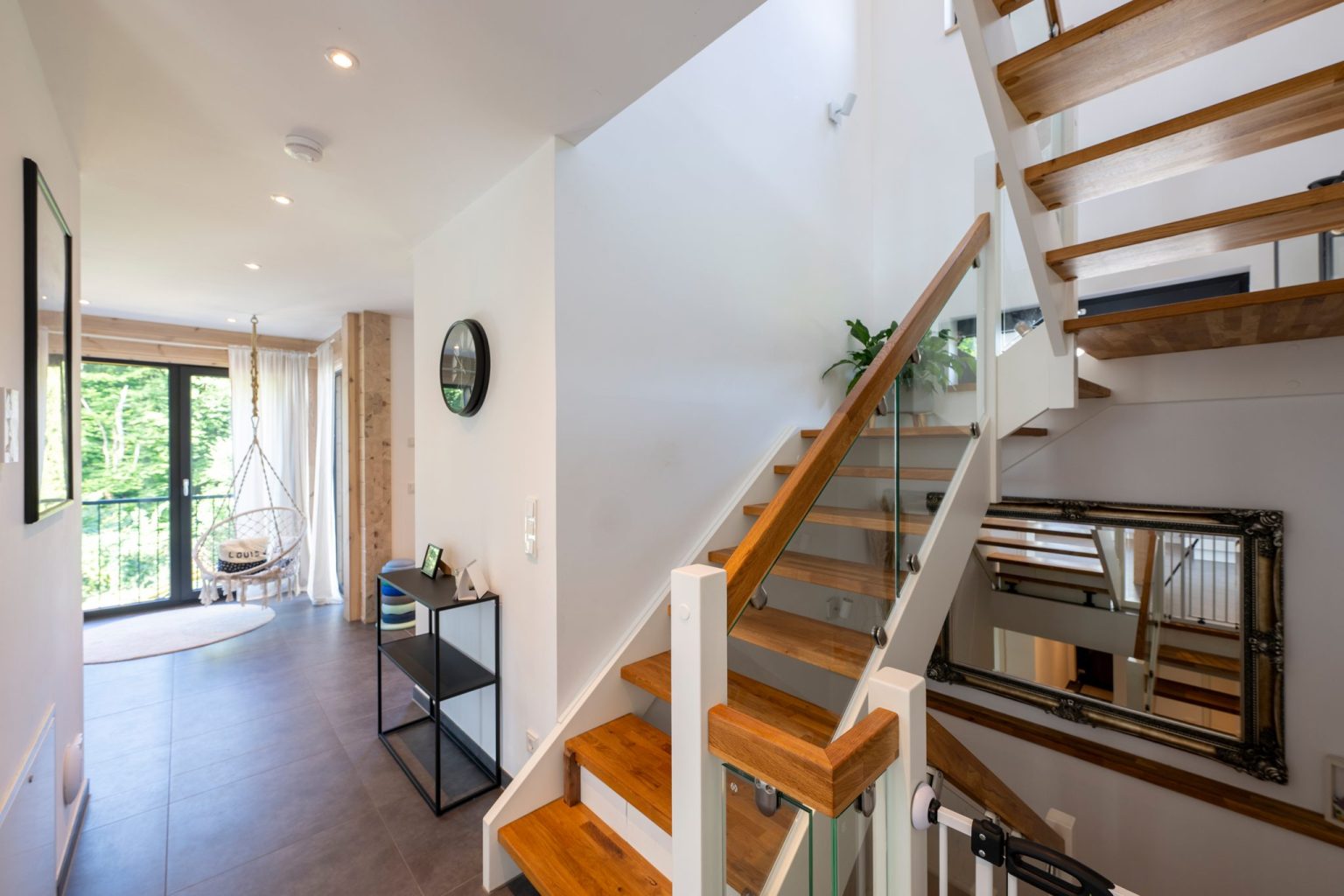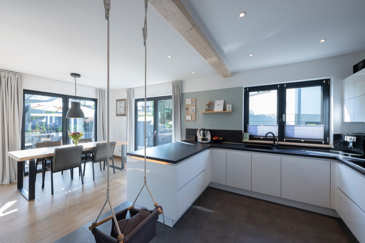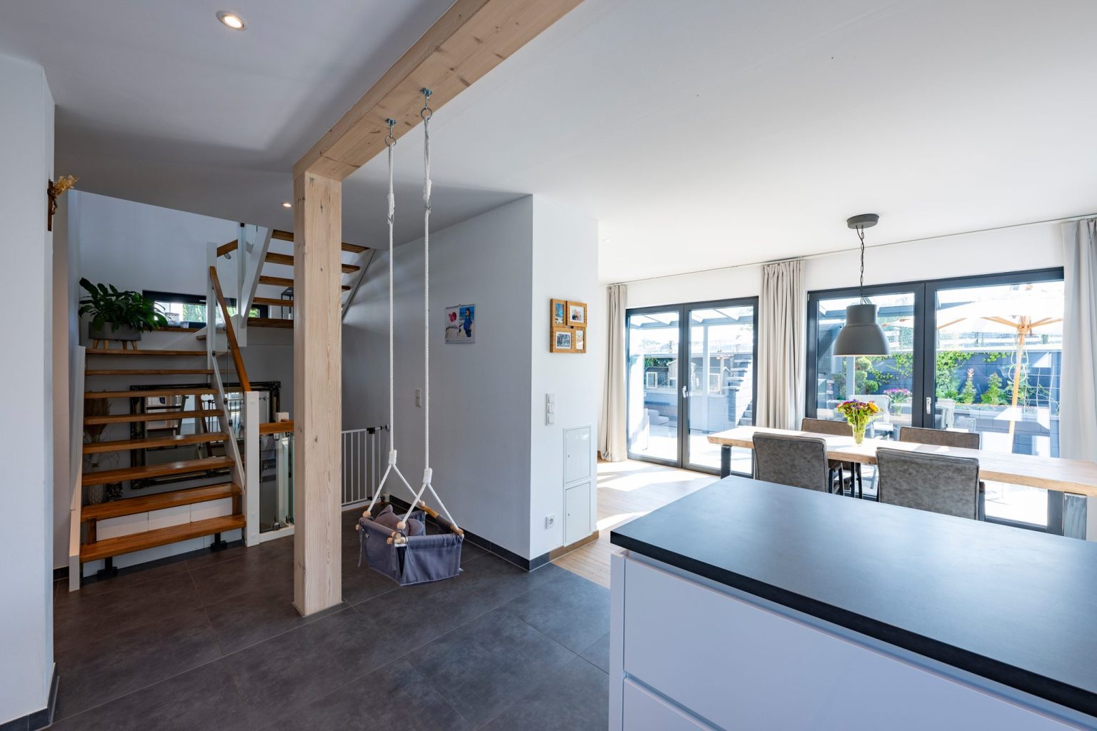 Wie gesagt wurde Holzhaus „Kreuzblick“ ganz individuell nach den Wünschen des Bauherrenpaares und nach der Grundstückssituation sowie der ortsgebundenen Bauvorschrift geplant. Dabei wurde die recht kleine Grundfläche optimal genutzt und der eineinhalbgeschossige Baukörper mit einem zweigeschossigen Zwerchhaus (Erker) sowie zwei Dachgauben ergänzt. Das schafft viel Platz und Stellfläche im Obergeschoss und ist dank der symmetrischen Anordnung optisch sehr ansprechend. Der Hauseingang befindet sich im Untergeschoss, welches nur teilweise im Hang verschwindet und zum Arbeiten aber auch Wohnen genutzt werden kann. Dort befinden sich vom Flur ausgehend ein Büro, ein Fitnessraum und ein Abstellraum/HWR. Über eine transparente Holz-Glas-Treppe geht es hinauf ins Erdgeschoss, wo man vom Flur aus links in die zum Ess- und Wohnzimmer hin offene Küche gelangt oder rechts zu einem offenen Spiel- und Lesebereich im und am Erker. Ein Gäste-WC komplettiert das Raumprogramm im Erdgeschoss, wobei die mit Glas überdachte und mit einer niedrigen Mauer umgebene Terrasse auch noch als Raum bezeichnet werden könnte. Sie schließt sich wie ein offener Wintergarten dem L-förmigen Wohn-/Ess-/Kochbereich über die gesamte Hausbreite an. Von dort geht es dann über ein paar Stufen hinauf in den Garten. Die Holztreppe im Haus endet freilich nicht im Erdgeschoss, sondern führt weiter hinauf ins Obergeschoss. Dort mündet sie auf einem kleinen Flur, von dem man zu zwei Kinderzimmern, zum Schlafzimmer der Eltern mit angeschlossener Ankleide und zum Familienbad gelangt. Besonders heimelig ist das Schlafzimmer, welches sich im firstoffenen, bodentief verglasten Erker befindet, aber auch die Kinderzimmer mit je einer Gaube und bodentiefem Giebelfenster sind sehr behaglich und hell. Dank des bis zum First offenen Luftraums mit sichtbarer Firstpfette und ansonsten weiß gestrichenen Dachschrägen und Wänden wirkt das Dachgeschoss sehr luftig und die Wohnfläche größer, als sie tatsächlich ist. Besonders profitiert Holzhaus „Kreuzblick“ von den vielen, wo es ging bodentiefen Fenstern, die reichlich natürliches Licht in das gesamte Gebäude einlassen, sogar entlang der Treppe. Das Tageslicht wird von den weißen Wänden reflektiert, vervielfacht und ungehindert in die offenen Bereiche geleitet, sodass drinnen alles in Helligkeit erstrahlt. Dazu kontrastierend wählten Simon und Christina Marks Fenster in anthrazit, die farblich identisch mit der Dacheindeckung, der Haustüre und dem Garagentor sind. Die Zimmertüren hingegen sind weiß und verschwinden optisch in den Wänden. Die Außenlasur in einem mittleren Grauton unterstreicht das sachliche und elegant-zurückhaltende Erscheinungsbild des Holzhauses auf dem weiß getünchten Kellergeschoss. Konsequent und perfekt passend dominieren drinnen weiße, graue und anthrazitfarbene Einrichtungs- und Deko-Elemente – kombiniert mit wenig hellem Holz ergeben sie ein cleanes Gesamtbild. Die einzige farbige Ausnahme bildet eine dunkelgrün gestrichene Wand, die sich direkt vis-à-vis des bodentiefen Fensters am Lese- und Spiel-Erker befindet. Die hohen Laubbäume draußen korrespondieren farblich mit dieser Wand und in Kombination mit der hellen Kiefernwand des Erkers wähnt man sich in einer behaglichen Ruhe-Oase, in der es sich wunderbar entspannen lässt.