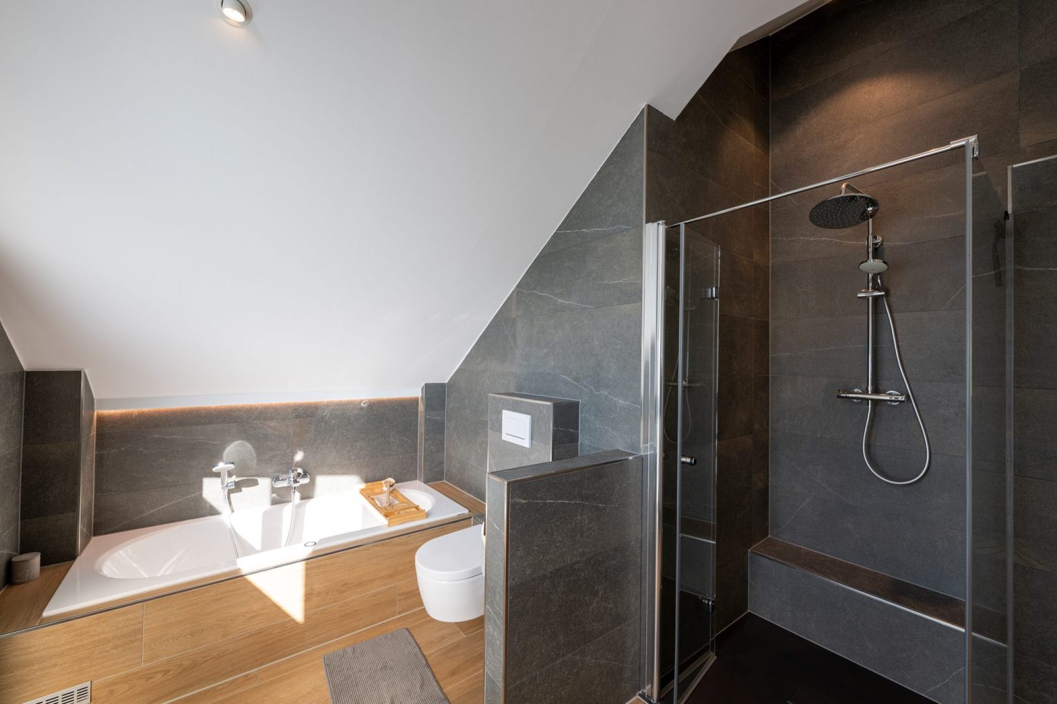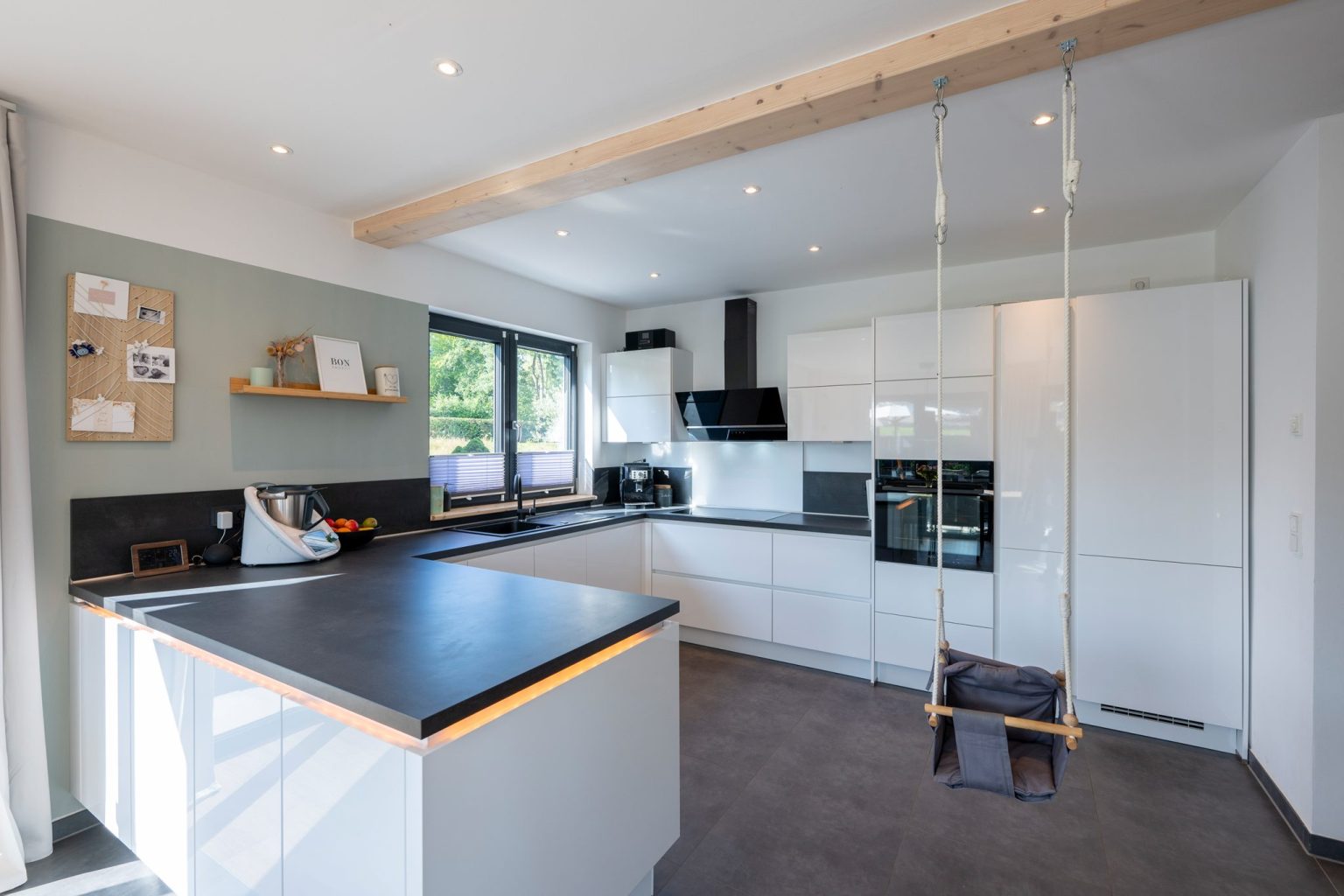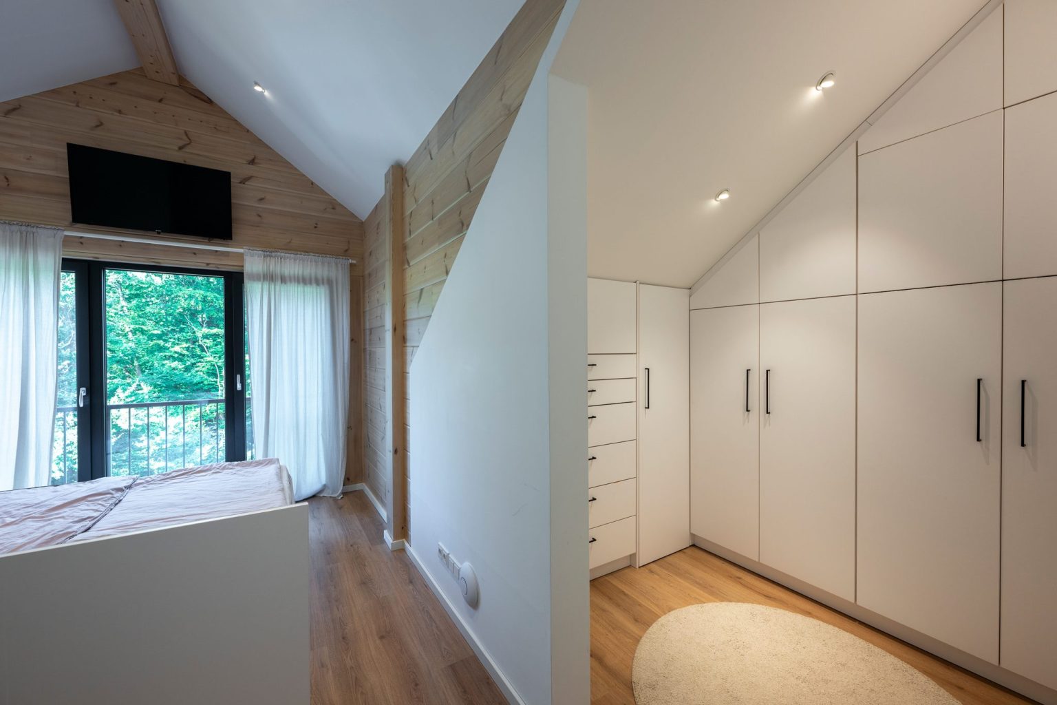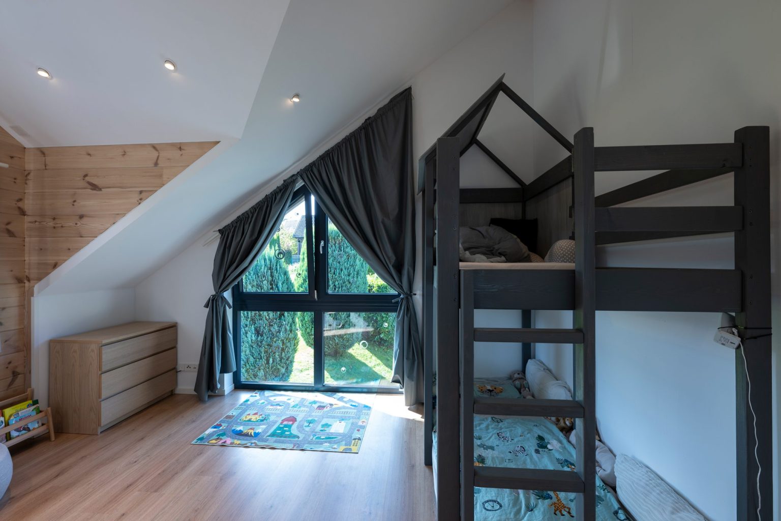 Wie gesagt wurde Holzhaus „Kreuzblick“ ganz individuell nach den Wünschen des Bauherrenpaares und nach der Grundstückssituation sowie der ortsgebundenen Bauvorschrift geplant. Dabei wurde die recht kleine Grundfläche optimal genutzt und der eineinhalbgeschossige Baukörper mit einem zweigeschossigen Zwerchhaus (Erker) sowie zwei Dachgauben ergänzt. Das schafft viel Platz und Stellfläche im Obergeschoss und ist dank der symmetrischen Anordnung optisch sehr ansprechend. Der Hauseingang befindet sich im Untergeschoss, welches nur teilweise im Hang verschwindet und zum Arbeiten aber auch Wohnen genutzt werden kann. Dort befinden sich vom Flur ausgehend ein Büro, ein Fitnessraum und ein Abstellraum/HWR. Über eine transparente Holz-Glas-Treppe geht es hinauf ins Erdgeschoss, wo man vom Flur aus links in die zum Ess- und Wohnzimmer hin offene Küche gelangt oder rechts zu einem offenen Spiel- und Lesebereich im und am Erker. Ein Gäste-WC komplettiert das Raumprogramm im Erdgeschoss, wobei die mit Glas überdachte und mit einer niedrigen Mauer umgebene Terrasse auch noch als Raum bezeichnet werden könnte. Sie schließt sich wie ein offener Wintergarten dem L-förmigen Wohn-/Ess-/Kochbereich über die gesamte Hausbreite an. Von dort geht es dann über ein paar Stufen hinauf in den Garten. Die Holztreppe im Haus endet freilich nicht im Erdgeschoss, sondern führt weiter hinauf ins Obergeschoss. Dort mündet sie auf einem kleinen Flur, von dem man zu zwei Kinderzimmern, zum Schlafzimmer der Eltern mit angeschlossener Ankleide und zum Familienbad gelangt. Besonders heimelig ist das Schlafzimmer, welches sich im firstoffenen, bodentief verglasten Erker befindet, aber auch die Kinderzimmer mit je einer Gaube und bodentiefem Giebelfenster sind sehr behaglich und hell. Dank des bis zum First offenen Luftraums mit sichtbarer Firstpfette und ansonsten weiß gestrichenen Dachschrägen und Wänden wirkt das Dachgeschoss sehr luftig und die Wohnfläche größer, als sie tatsächlich ist. Besonders profitiert Holzhaus „Kreuzblick“ von den vielen, wo es ging bodentiefen Fenstern, die reichlich natürliches Licht in das gesamte Gebäude einlassen, sogar entlang der Treppe. Das Tageslicht wird von den weißen Wänden reflektiert, vervielfacht und ungehindert in die offenen Bereiche geleitet, sodass drinnen alles in Helligkeit erstrahlt. Dazu kontrastierend wählten Simon und Christina Marks Fenster in anthrazit, die farblich identisch mit der Dacheindeckung, der Haustüre und dem Garagentor sind. Die Zimmertüren hingegen sind weiß und verschwinden optisch in den Wänden. Die Außenlasur in einem mittleren Grauton unterstreicht das sachliche und elegant-zurückhaltende Erscheinungsbild des Holzhauses auf dem weiß getünchten Kellergeschoss. Konsequent und perfekt passend dominieren drinnen weiße, graue und anthrazitfarbene Einrichtungs- und Deko-Elemente – kombiniert mit wenig hellem Holz ergeben sie ein cleanes Gesamtbild. Die einzige farbige Ausnahme bildet eine dunkelgrün gestrichene Wand, die sich direkt vis-à-vis des bodentiefen Fensters am Lese- und Spiel-Erker befindet. Die hohen Laubbäume draußen korrespondieren farblich mit dieser Wand und in Kombination mit der hellen Kiefernwand des Erkers wähnt man sich in einer behaglichen Ruhe-Oase, in der es sich wunderbar entspannen lässt.