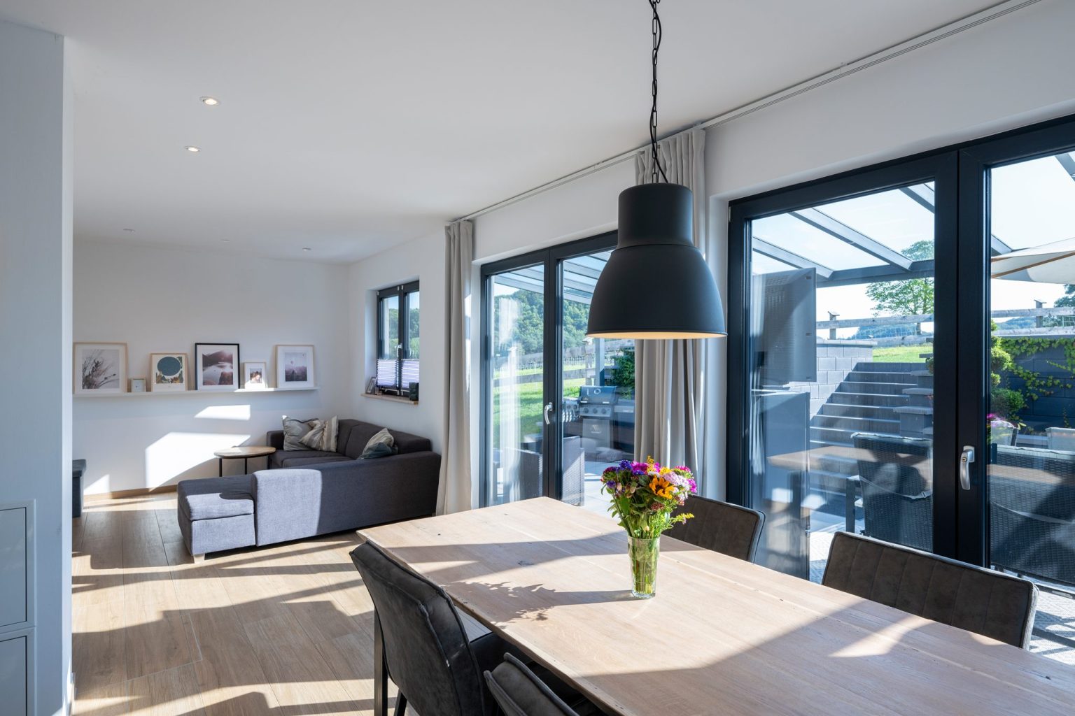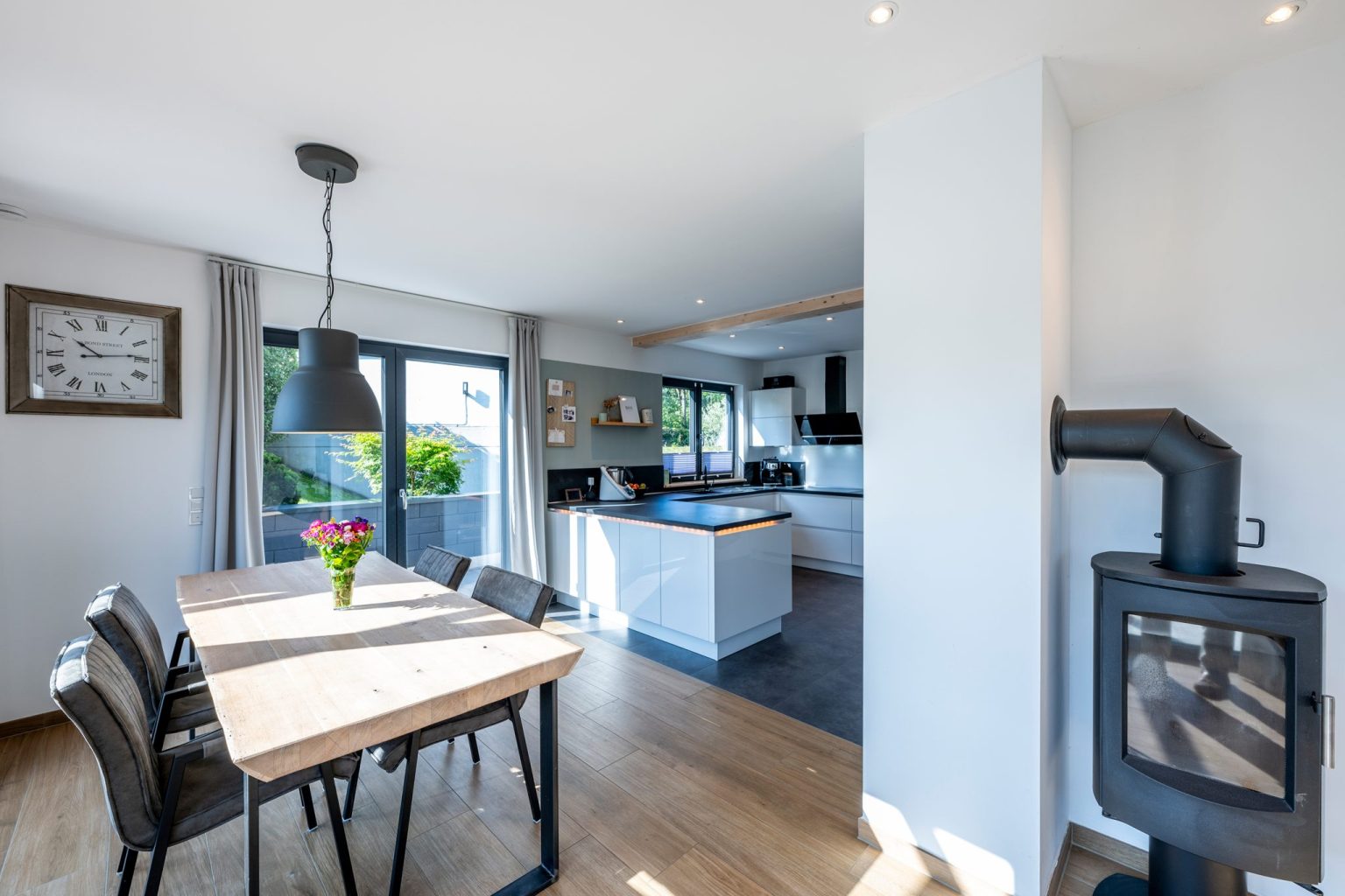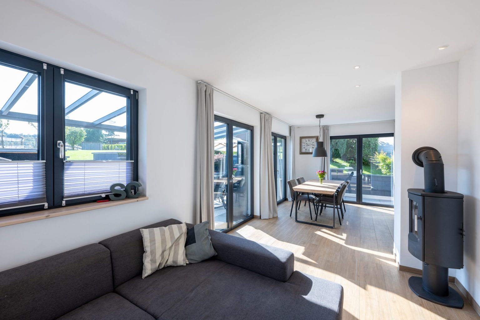 Beheizt wird Holzhaus „Kreuzblick“ mittels Fußbodenheizung mit regenerativer Energie aus einer Luft/Wasser-Wärmepumpe. Ergänzend spendet im offenen Wohnzimmer ein Kaminofen mit Sichtfenster gemütliche Strahlungswärme, die sich dank der offenen Innenarchitektur in beiden Geschossen verteilt.