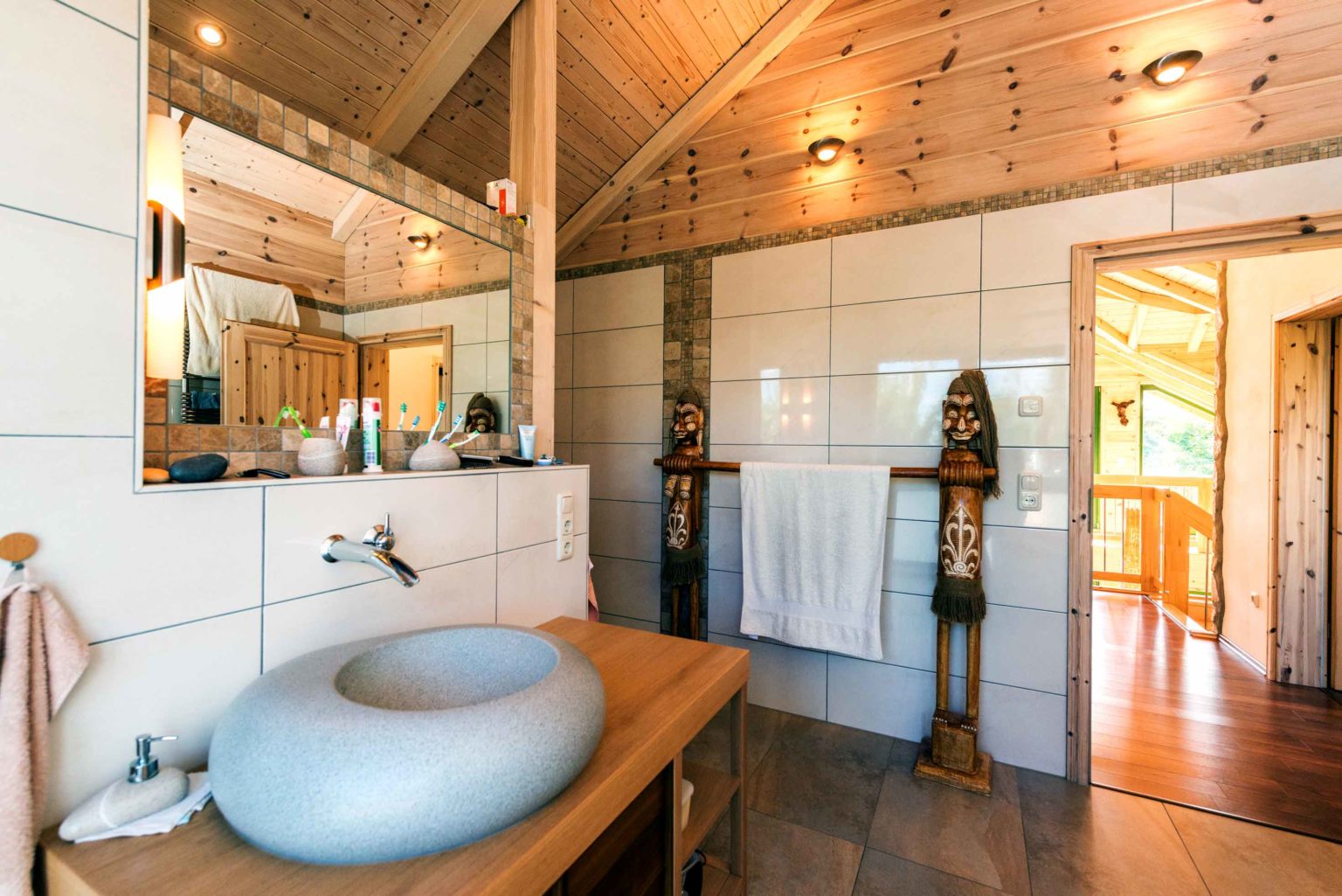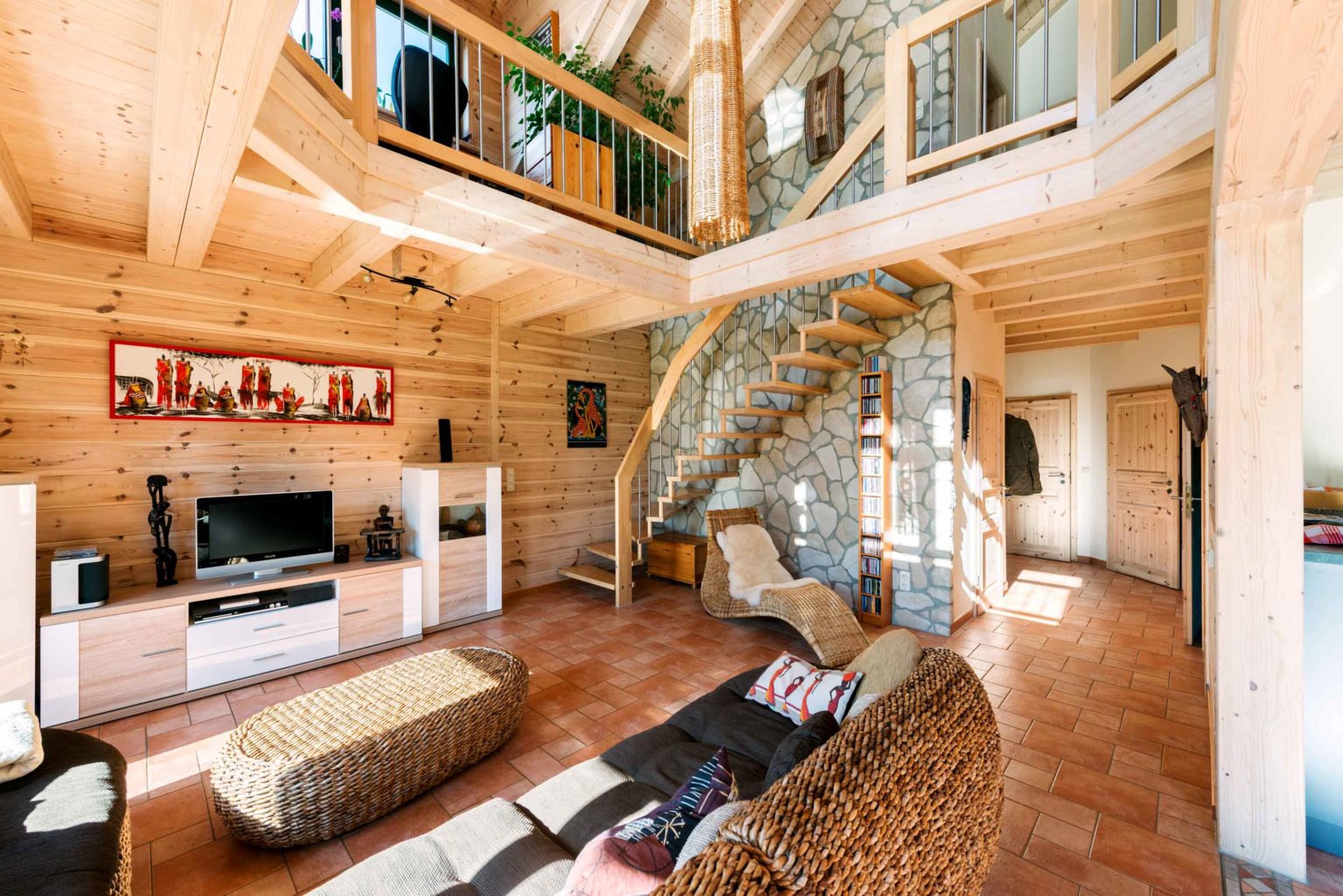 Mitten in Sachsen hat sich Arztfamilie Abel* ihren Traum von Afrika erfüllt. Ihr Holzhaus aus Massivholz ist mit vielen Erinnerungen und Mitbringseln aus Afrika bestückt. „Als unser Sohn Timon noch nicht geboren war, sind wir mit unserer Tochter Sylvie sogar ein ganzes Jahr durch Afrika gereist“, erzählt Christina Abel. "Da war sie noch im Kleinkindalter, und wir dadurch frei", ergänzt ihr Mann Torsten. Als die Familie sich dann niederließ, wollte sie eigentlich ein fertiges Haus kaufen – aber dann kam doch alles ganz anders: "Das Raumklima in einem chemisch unbehandelten Holzhaus ist sehr wohltuend", versichert Kardiologe Torsten. Aber nicht nur die Gesundheit und das Wohlbefinden profitieren vom Baustoff Holz, sondern auch der Heizenergieverbrauch: Die "gefühlte" Temperatur ist in einem Holzhaus um etwa 2-3 Grad höher, so dass man sich dementsprechend bereits bei etwas niedrigeren Raumtemperaturen behaglich fühlt. Eine schöne Weise Energie und damit auch Geld zu sparen, findet Ehepaar Abel.
