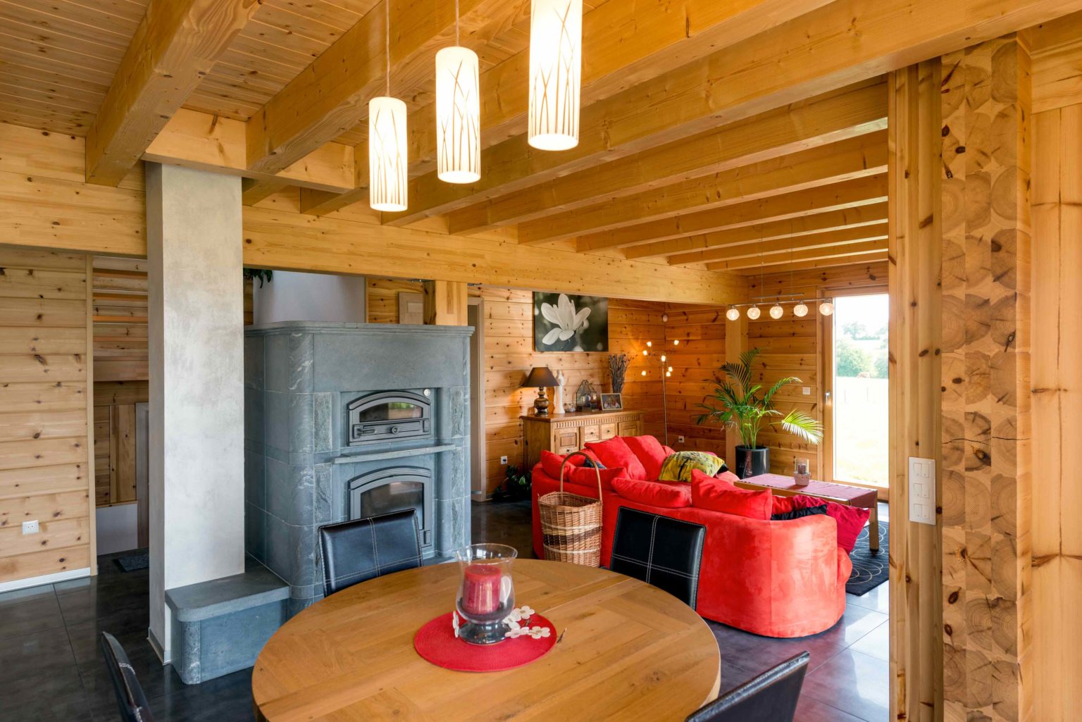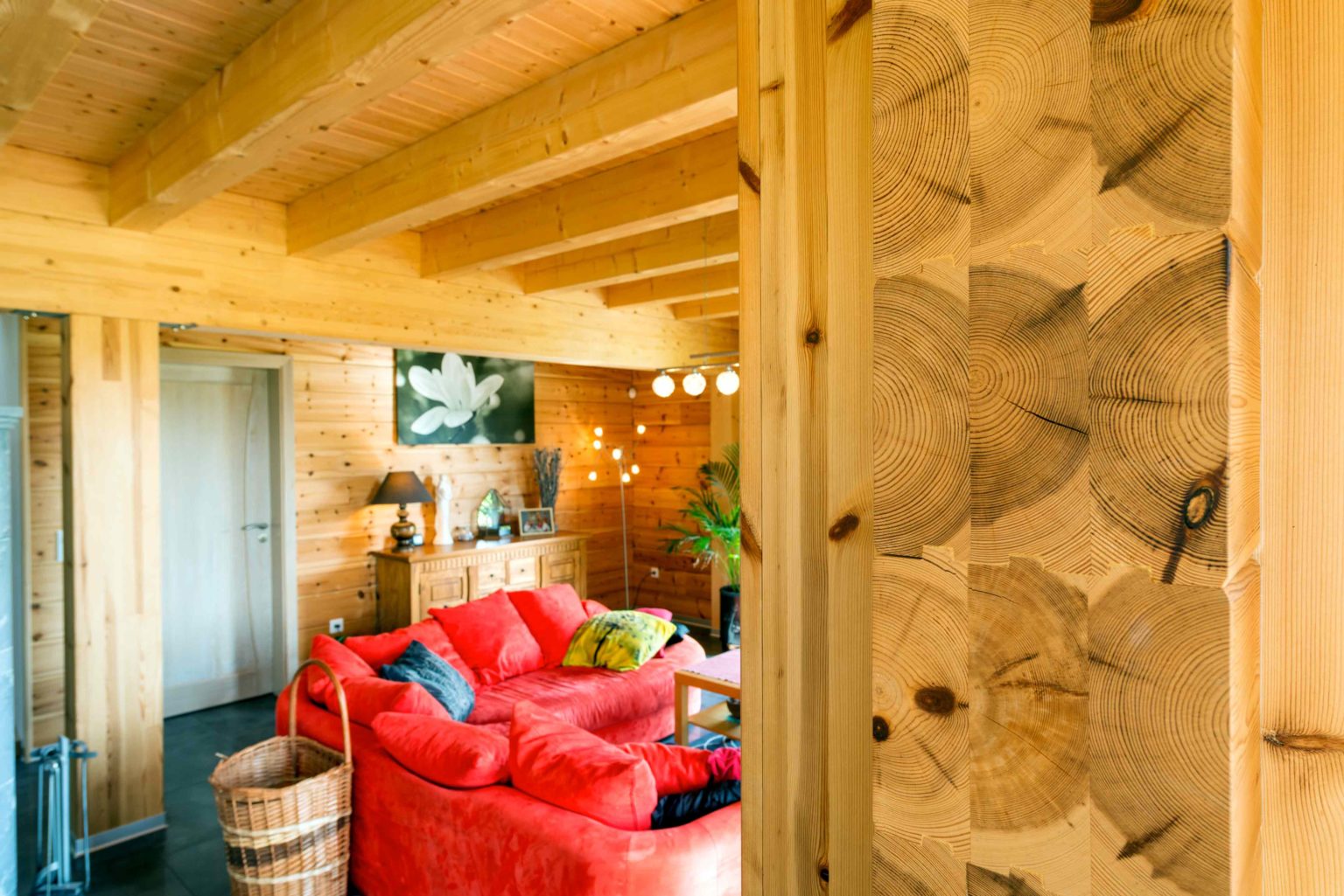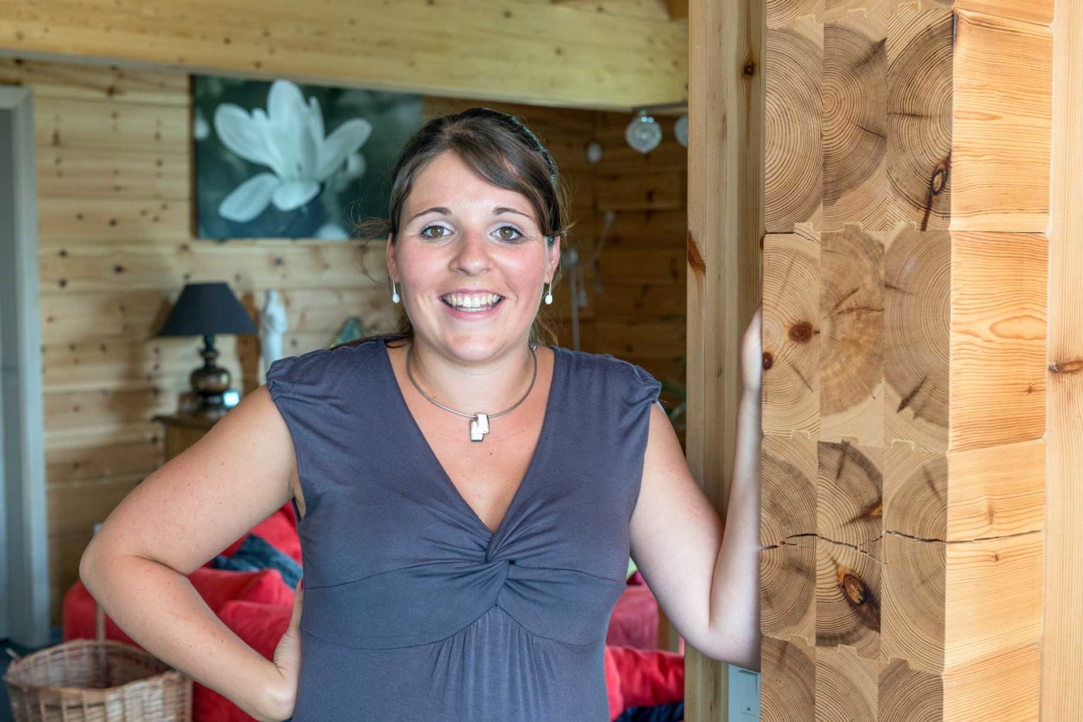 Die junge Hauseigentümerin war froh, dass Fullwood ihr verschiedene Ausbaustufen anbot. Sie entschied sich für eine „Richtmeistermontage“, bei der Bauherren viel Geld sparen können, indem sie selbst mitarbeiten. In ihrem Fall war der Richtmeister (Zimmermann von Fullwood) vier Tage vor Ort und leitete ihren Vater, ihre Onkel und ihren Lebensgefährten bei der Hausmontage an. Dank des kompetenten, sehr geduldigen und netten Richtmeisters machte die anstrengende Arbeit auch den Helfern Spaß. Zum Dank kochte die Hausherrin abends für alle vorzügliche, französische Speisen, die nicht nur den Richtmeister zu Höchstleistungen antrieben. Da die Wandelemente und Dachstuhlbalken maßgenau in der Werkstatt vorgefertigt worden waren, passte alles perfekt in- und zueinander. Die Trennwände (Ständerbau) errichtete und verkleidete das Familienteam ebenfalls selbst. Alle Installationen für Wasser und Abwasser und die Elektroinstallationen erledigte ein Onkel, der selbst Elektriker ist. Dafür wurden im Vorfeld schon im Werk sämtliche Kanäle für die Kabel in die Vollholzwände gebohrt, was eine genaue Planung voraussetzt. Die restlichen Arbeiten übernahmen örtliche Fachfirmen. Das durch die Eigenleistung gesparte Geld, investierte die Hausherrin lieber in das qualitativ hochwertige, setzungsfreie und winddichte Vollholzwand-System von Fullwood Wohnblockhaus und in langlebige Ausbaumaterialien.