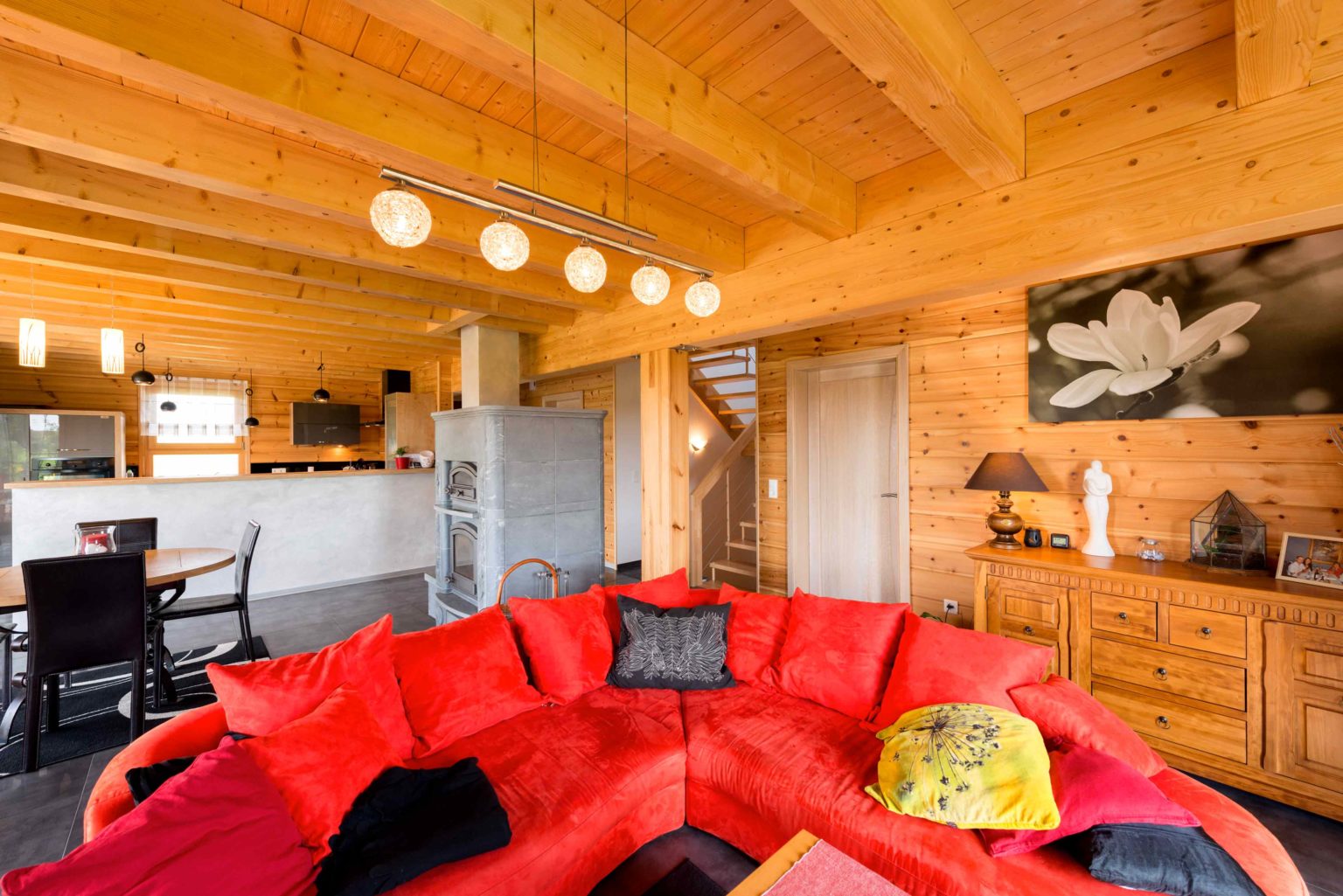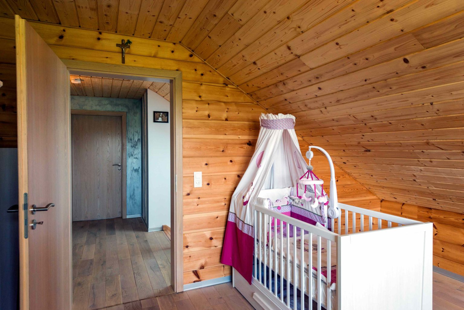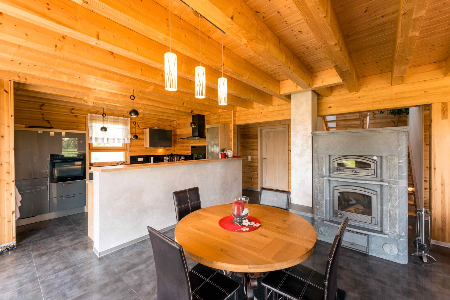 Die Holzhaus Eigentümerin zieht den gemütlichen Landhausstil ihres sinnlichen Heims eindeutig den klaren und sachlichen Linien moderner Architektur vor – die wirkt ihr zu hart und zu kalt. In ihrem wohngesunden Holzhaus hingegen fühlt sie sich geborgen und erholt. Auch den Effekt, dass die „gefühlte Temperatur“ in Massivholzhäusern etwa 2 Grad Celsius höher ausfällt als in Stein- oder Betonhäusern, weiß die junge Frau zu schätzen – und dass nicht nur, weil der Heizenergieverbrauch dadurch gesenkt wird. Beheizt wird Holzhaus „Lothringen“ mit einem voluminösen, mannshohen Specksteinofen, der in der Hausmitte, genauer gesagt im offenen Wohnbereich des Erdgeschosses, thront. Das Dachgeschoss wird von der durchs Treppenhaus aufsteigenden Wärme und dem Kaminabzug (Badezimmer) erwärmt. Gedämmte Böden zwischen Erdgeschoss und Keller, sowie zwischen Erdgeschoss und Dachgeschoss isolieren zusätzlich. Die Böden oben wurden – außer im Bad - mit fußwarmem Eichenparkett verkleidet, da gibt`s nie kalte Füße, und die 26 cm dicke Aufdachdämmung leistet ebenfalls einen großen Beitrag zur Wärmeisolierung. Die Geschossdecke zwischen Erd- und Dachgeschoss bekam außerdem eine Trittschalldämmung, damit noch Ruhe herrscht, wenn der Nachwuchs vom Krabbelalter ins Tobe-Alter wechselt. Ihr Wasser erwärmt die Hausherrin elektrisch mit grünem Strom. Um die so gering wie möglich zu halten, wird nur erwärmt, was auch gebraucht wird.