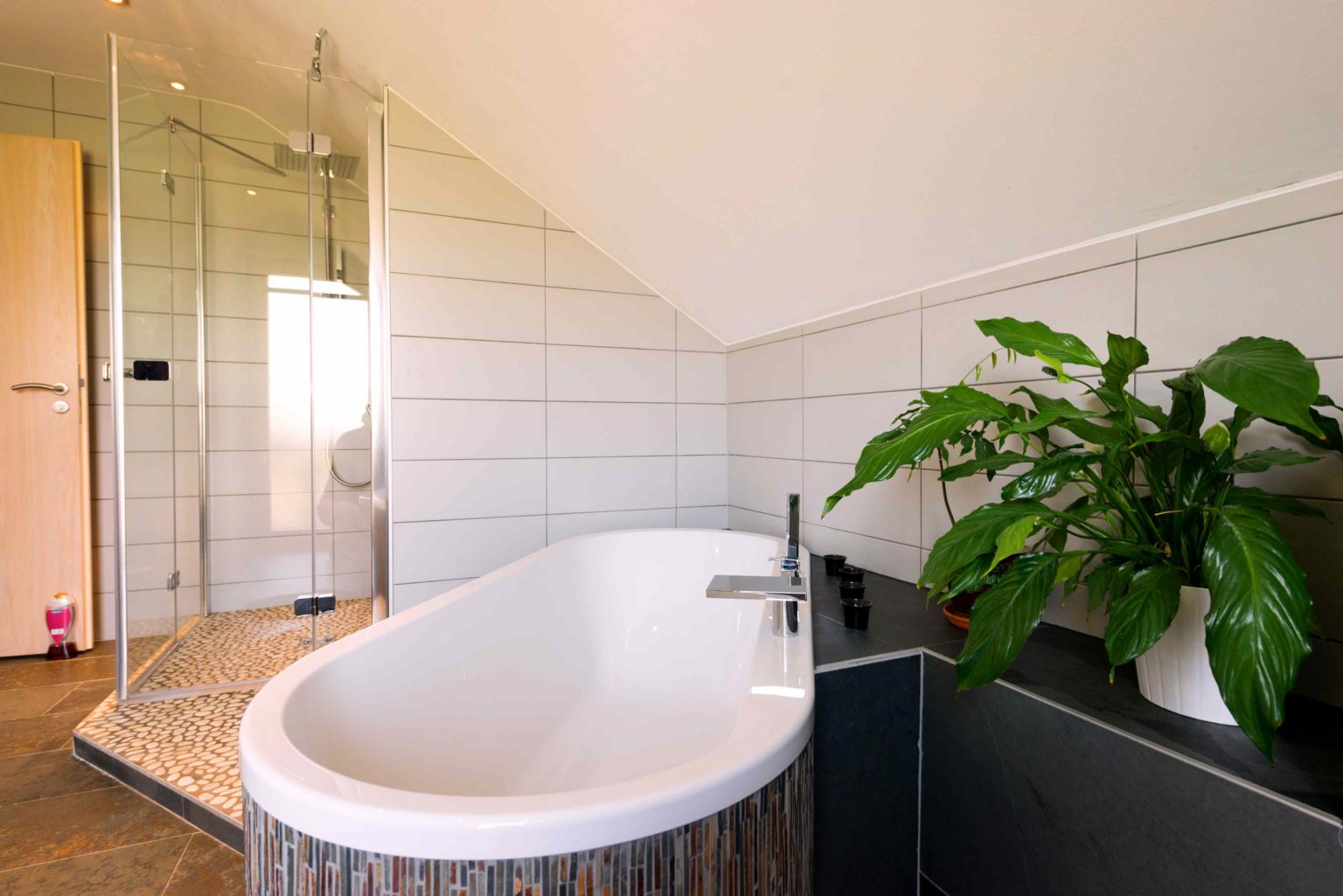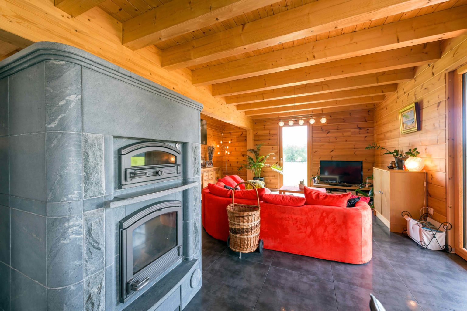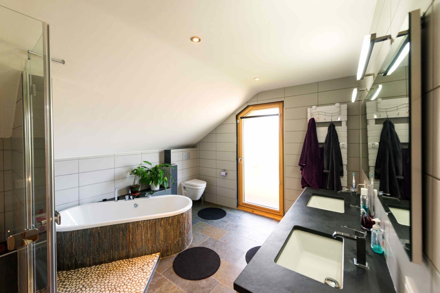 Die Holzhaus Eigentümerin zieht den gemütlichen Landhausstil ihres sinnlichen Heims eindeutig den klaren und sachlichen Linien moderner Architektur vor – die wirkt ihr zu hart und zu kalt. In ihrem wohngesunden Holzhaus hingegen fühlt sie sich geborgen und erholt. Auch den Effekt, dass die „gefühlte Temperatur“ in Massivholzhäusern etwa 2 Grad Celsius höher ausfällt als in Stein- oder Betonhäusern, weiß die junge Frau zu schätzen – und dass nicht nur, weil der Heizenergieverbrauch dadurch gesenkt wird. Beheizt wird Holzhaus „Lothringen“ mit einem voluminösen, mannshohen Specksteinofen, der in der Hausmitte, genauer gesagt im offenen Wohnbereich des Erdgeschosses, thront. Das Dachgeschoss wird von der durchs Treppenhaus aufsteigenden Wärme und dem Kaminabzug (Badezimmer) erwärmt. Gedämmte Böden zwischen Erdgeschoss und Keller, sowie zwischen Erdgeschoss und Dachgeschoss isolieren zusätzlich. Die Böden oben wurden – außer im Bad - mit fußwarmem Eichenparkett verkleidet, da gibt`s nie kalte Füße, und die 26 cm dicke Aufdachdämmung leistet ebenfalls einen großen Beitrag zur Wärmeisolierung. Die Geschossdecke zwischen Erd- und Dachgeschoss bekam außerdem eine Trittschalldämmung, damit noch Ruhe herrscht, wenn der Nachwuchs vom Krabbelalter ins Tobe-Alter wechselt. Ihr Wasser erwärmt die Hausherrin elektrisch mit grünem Strom. Um die so gering wie möglich zu halten, wird nur erwärmt, was auch gebraucht wird.