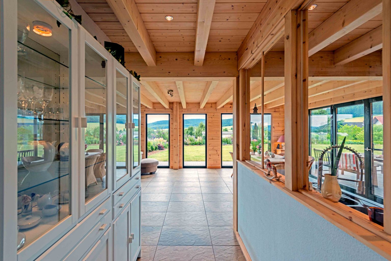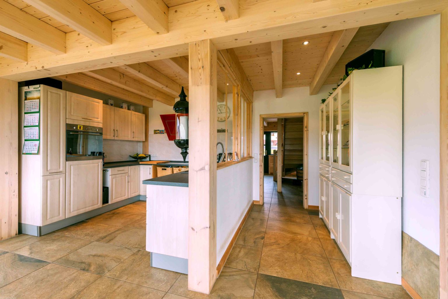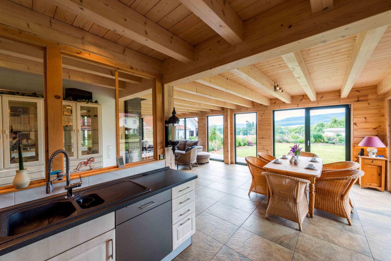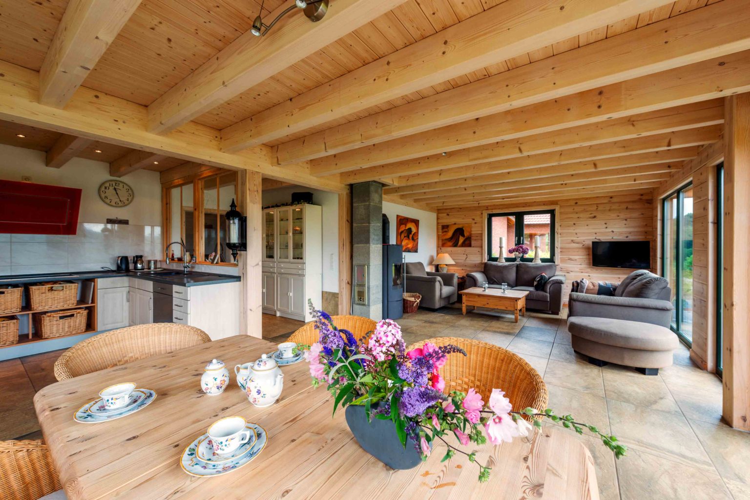 „Bei aller Holzliebe wollten wir doch ein helles und schnörkelloses Holzhaus, nichts Rustikales, das nach Jagdhütte schreit.“, erklärt die Hauseigentümerin weiter. In aller Ruhe suchte die Familie den passenden Holzhaushersteller und entschied sich für Fullwood. „Wir haben lieber etwas mehr Geld in die Hand genommen und dafür beste Qualität bekommen, ohne Baumängel oder Stress, wie man das manchmal im Fernsehen sieht.“, sagt die Hausherrin. Zusammen mit Fullwood entwarf man ein großzügiges, anderthalb geschossiges Holzhaus mit barrierefreiem Erdgeschoss. Durch die großen bodentiefen Fensterfronten fällt reichlich Tageslicht in die nach Süden ausgerichteten Räume - besonders in den großen offenen Wohnbereich -, aber auch die Zimmer an West- und Ostseite des Hauses erhalten viel Tageslicht. Die glatten Hauswände aus hellem Kiefernholz (20 cm dicke Bohlen) wurden mit einem Spezialanstrich versehen, der die natürliche Holzfarbe erhält und vor Vergrauung schützt. Drinnen wurde ein UV-Schutz aufgetragen, damit das Holz nicht nachdunkelt. Vereinzelte Trennwände (Ständerbau) wurden weiß verputzt und ein heller Fliesenboden durchgängig im gesamten Erdgeschoss verlegt. Für Helligkeit ist also innen wie außen gesorgt. Als kleine Reminiszenz an den Beruf des Hausherrn, wählte das Eigentümerpaar Fensterrahmen und Haustüre in Tannengrün, die Innentüren sind aber wiederum alle aus massivem Kiefernholz.