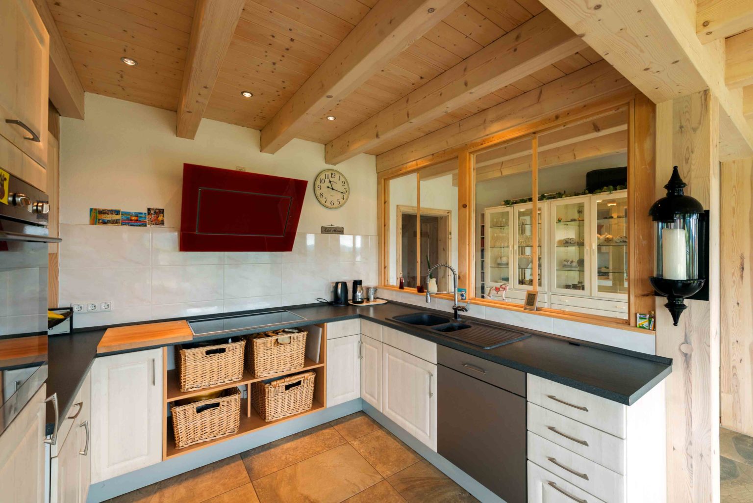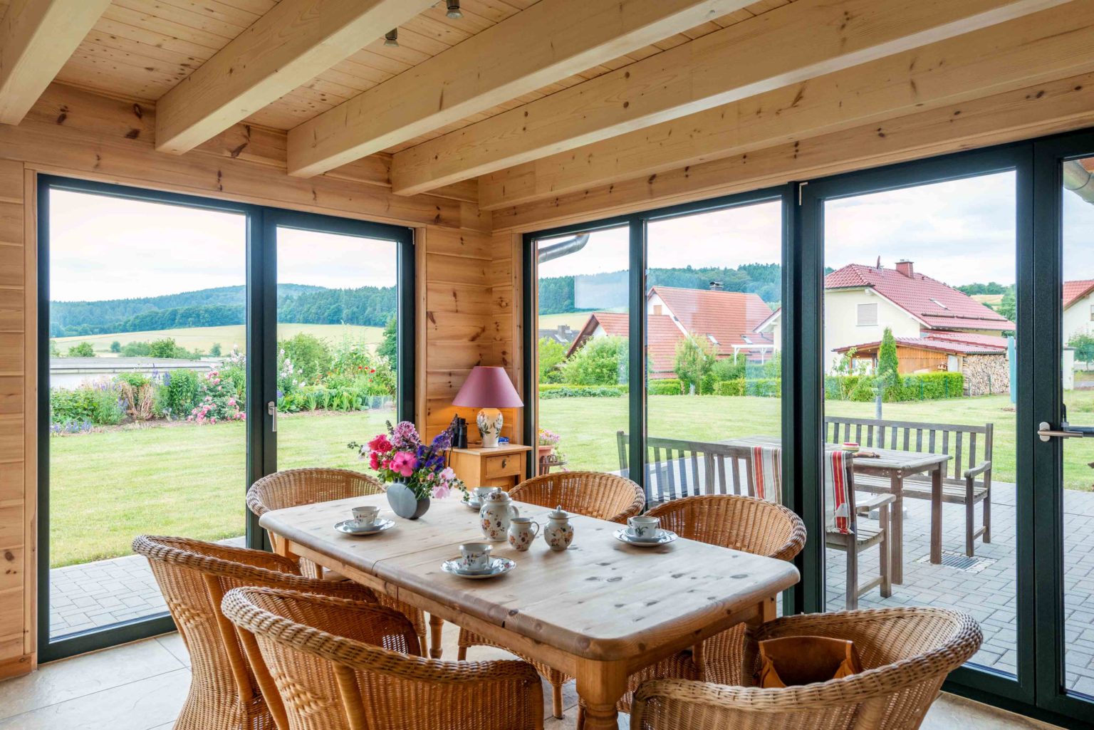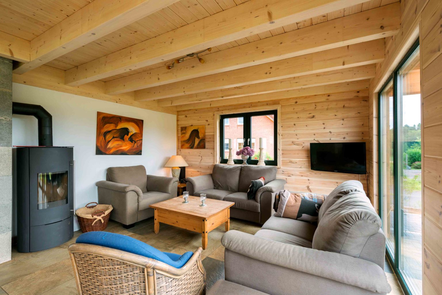 „Außer Brötchen schmieren und Materialien schleppen haben wir in der gesamten Bauphase fast nichts selber gemacht.“, sagt die Hausherrin, die sich generell lieber auf Profis verlässt. „Unser Holzhaus wurde komplett von den Monteuren des Herstellers aufgebaut, was nur wenige Tage gedauert hat, da die Wandelemente fertig angeliefert wurden. Da hat alles genau gepasst, und die Männer haben die Baustelle abends immer aufgeräumt und sauber hinterlassen.“ Bis auf das Verkleiden der Innenwände mit OSB und Rigipsplatten sowie Kiefernhalbbohlen vergab das Eigentümerpaar die Arbeiten im Innenausbau (Heizung, Sanitär, Fliesen, etc.) an Fachbetriebe vor Ort, die schnell greifbar sind, wenn`s drauf ankommt. „Schon fünf Monate nach Hausanlieferung konnten wir in unser fertiges Holzhaus einziehen! Die Gartenanlage braucht natürlich länger, auch weil ich das alles selbst mache.“, fährt die gebürtige Holländerin fort. Die meisten kreativen Ideen im Haus sind ihr zu verdanken, wie beispielsweise die ab Hüfthöhe verglaste Trennwand zwischen dem Durchgang zum Wohn-Ess-Bereich und der Küche – so etwas gibt es in den Niederlanden häufiger. Beheizt wird Holzhaus „Meißnerblick" mit einem wasserführenden Kaminofen (der Holzverbrauch beträgt fünf Raummeter pro Jahr) sowie einer Luft-Wärmepumpe, natürlich liegt überall Fußbodenheizung. Am liebsten beobachten die Hauseigentümer von ihrem Wohnraum, oder der Terrasse aus die eigenen Pferde und das Rotwild der Umgebung. Sogar einen Luchs hat der Hausherr schon von seinem „Jagdrevier im Dachgeschoss“ mit dem Fernglas ausmachen können. Im Wald hat er bisher nur die Spuren der Raubkatze entdecken können.