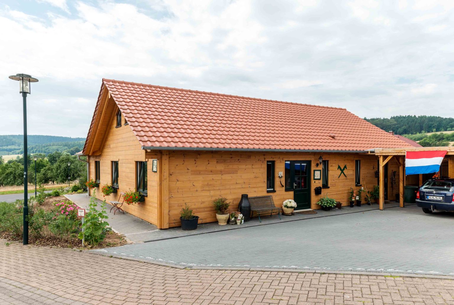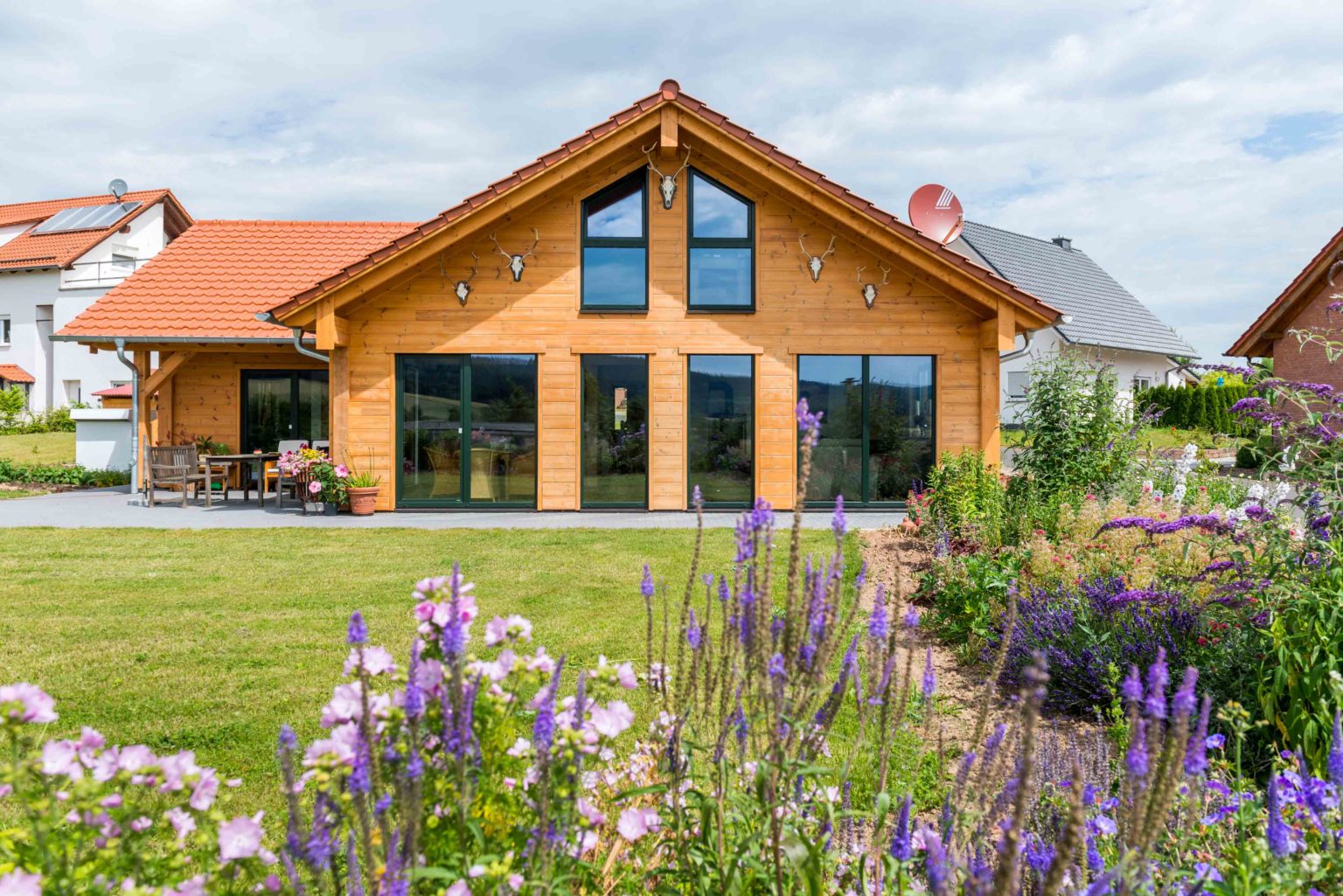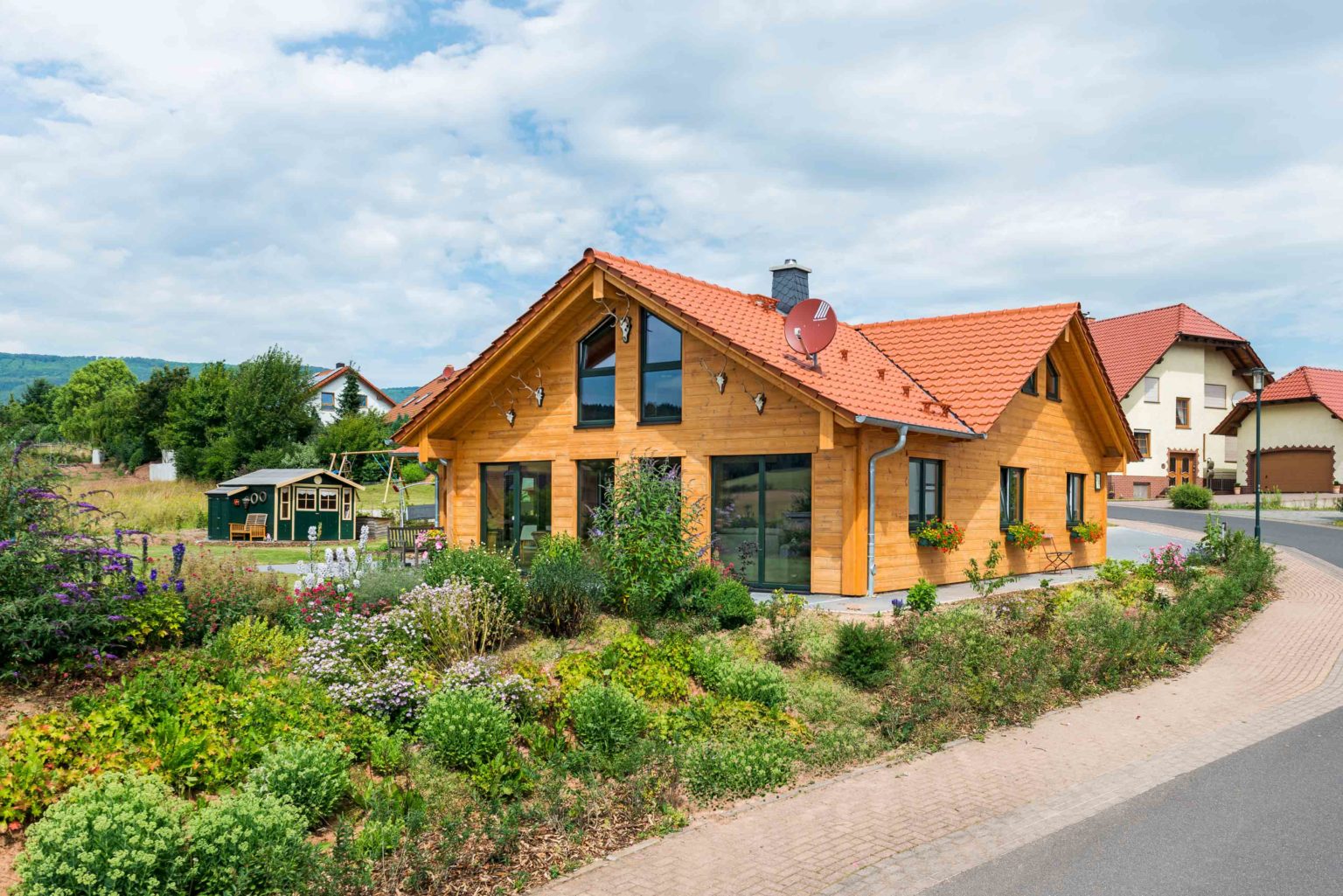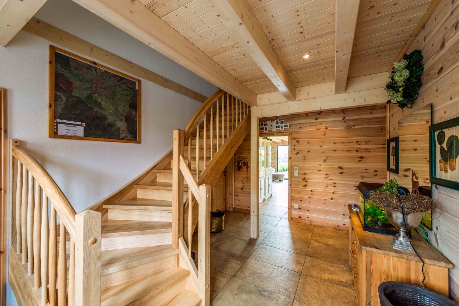Der Grundriss des Gebäudes ist winkelförmig, wodurch sich eine windgeschützte Terrasse nach Süd-Westen ergibt sowie ein dritter Hausgiebel an der Südseite. Meistens verfügen winkelförmige Häuser nur über ein einziges Geschoss, was den Eigentümern von Holzhaus „Meißnerblick“ aber nicht genügte. Deshalb ließen sie das Dachgeschoss komplett ausbauen, so dass der Hausherr heute über ein eigenes Geschoss für sich und seine Passion – Wald, Wild und Jagd – verfügt. Bevor es mit dem Bauen losgehen konnte, ließen die Bauherren zuerst ihr leicht abschüssiges Grundstück aufschütten und begradigen, damit auch der Garten barrierefrei ist. „Als Krankenschwester ist mir persönlich barrierefreies Wohnen für später sehr wichtig. Ich möchte hier schließlich für immer wohnen bleiben können. Dementsprechend musste auch der Garten im Notfall mit Rollator oder Rollstuhl begehbar sein.“, erklärt die Hausherrin. Außerdem wichtig war dem Ehepaar ein direkter Zugang vom Holzhaus zum Carport (Nordseite), um immer trockenen Fußes ins Auto zu gelangen. Als Verbindungsschleuse dient der Hauswirtschaftsraum. An der Nordseite befindet sich auch die Eingangstüre, durch die man in eine große Diele gelangt, von wo eine massive Holztreppe ins Dachgeschoss führt. Geradeaus geht es in den großzügigen Wohn-Ess-Kochbereich, während sich nach rechts ein schmaler, langgezogener Flur erstreckt, von dem der Abstellraum, das Bad, der Hauswirtschaftsraum und ein Kinderzimmer zu erreichen sind. Direkt rechts neben dem Eingang befindet sich ein Gäste-WC und links vor dem Treppenaufgang ein weiteres Kinderzimmer. Hinter dem Treppenaufgang geht es linker Hand noch in das Elternschlafzimmer.