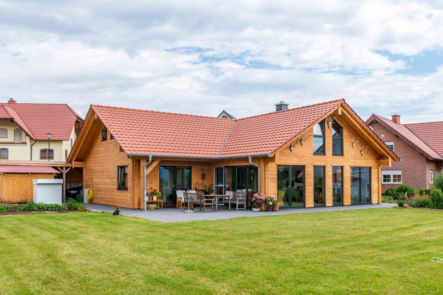 Ein professioneller Jäger und seine Pferde begeisterte Frau ließen für ihre große Patchworkfamilie ein massives Holzhaus errichten. Beide lebten schon vor ihrer Ehe in Holzhäusern und als nun der gemeinsame Hausbau bevorstand, kam für beide wieder nur Massivholz als Baustoff in Frage. „Wir schätzen das gemütliche Ambiente, das nur Holz verbreitet. Holz fühlt sich einfach gut an; es hat eine höhere Oberflächentemperatur als andere Stoffe.“, führt die begeisterte Holzfreundin fort. Auch der Naturverbundenheit der Patchworkfamilie kommt Holz als natürliches, organisches Material sehr entgegen.