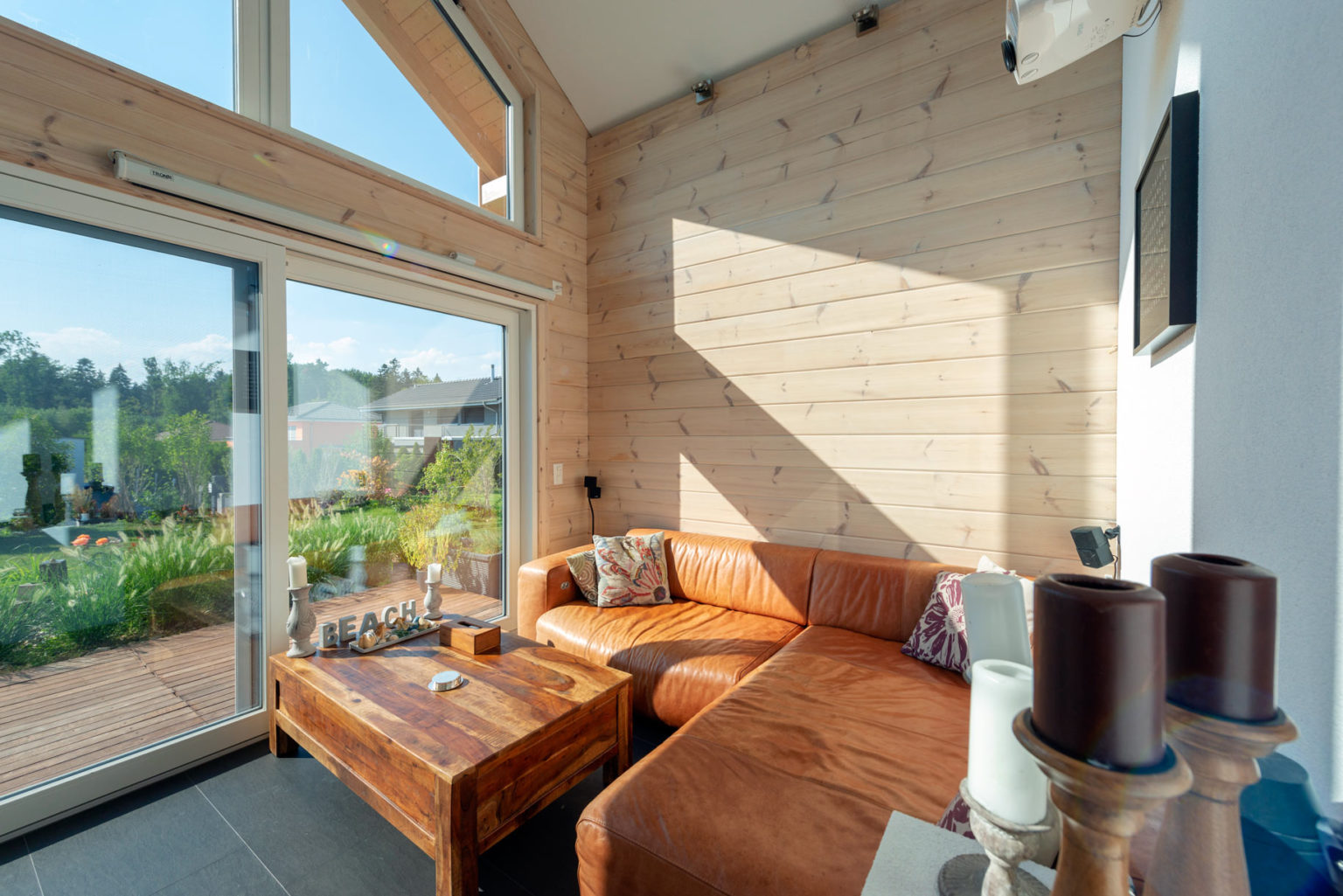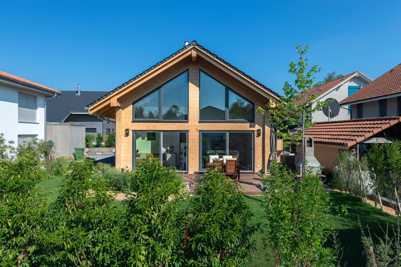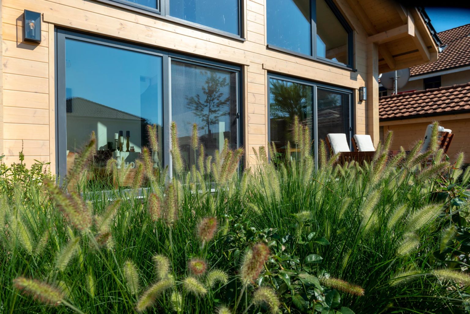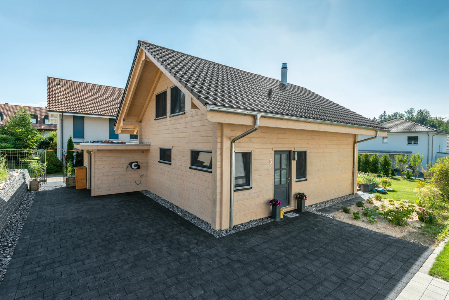 Obwohl das einziges Haus aus Massivholz in der Siedlung, fällt Holzhaus „Mittelland“ dank seiner dezenten, geradlinigen und klassisch-modernen Architektur nicht auf. Die sehr hellen Holzwände mit ihrer schlichten („ruhigen“), glatten Struktur, der verglaste Westgiebel, die außen anthrazitfarbenen Fensterrahmen und Tondachziegel in gleicher Farbe und die moderne Gartengestaltung (selbst angelegt!) fügen sich wunderbar zwischen die Mainstream-Häuser der Nachbarschaft. Unauffällig aber sehr besonderes und mit hoher Qualität – das nennt man Understatement!
