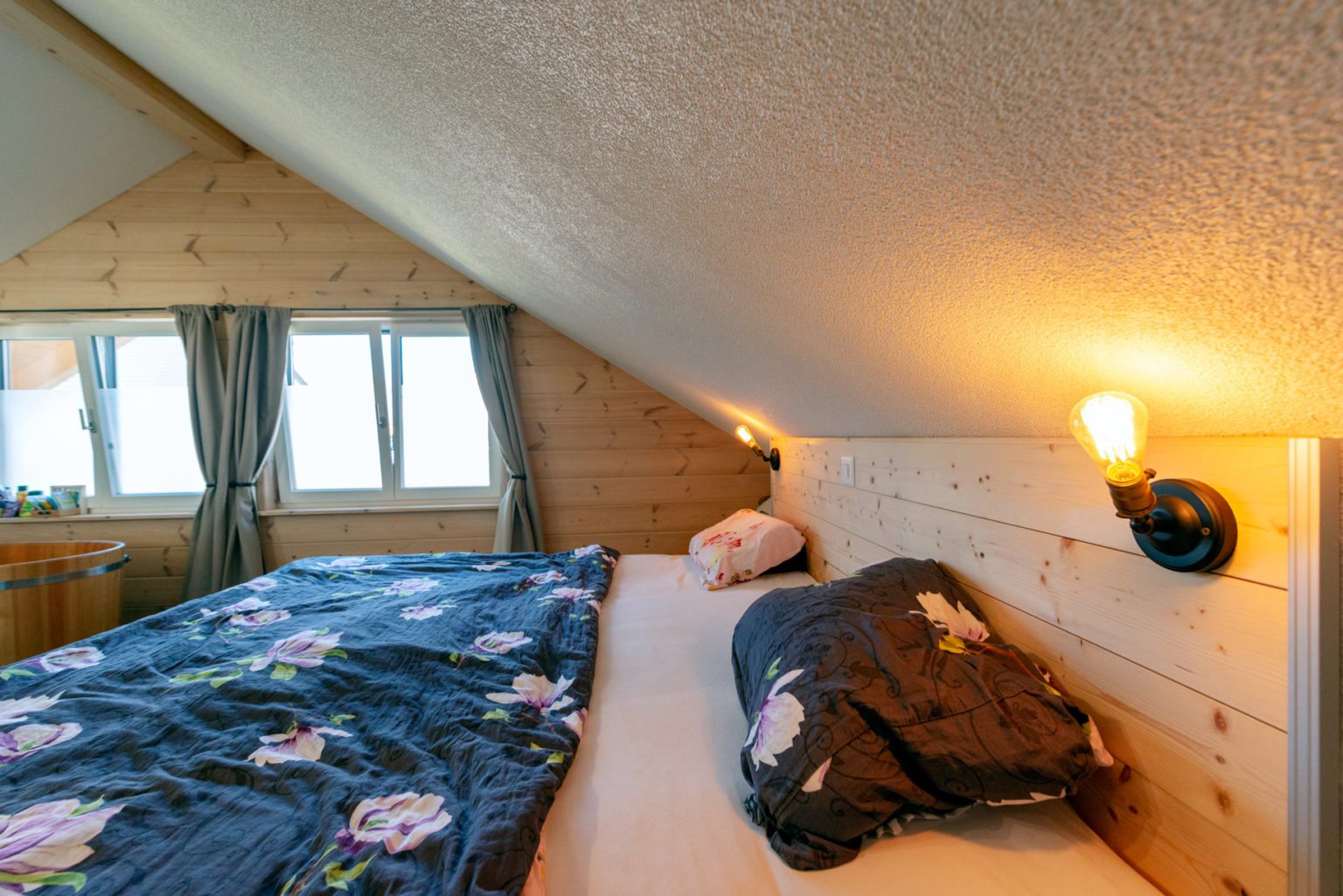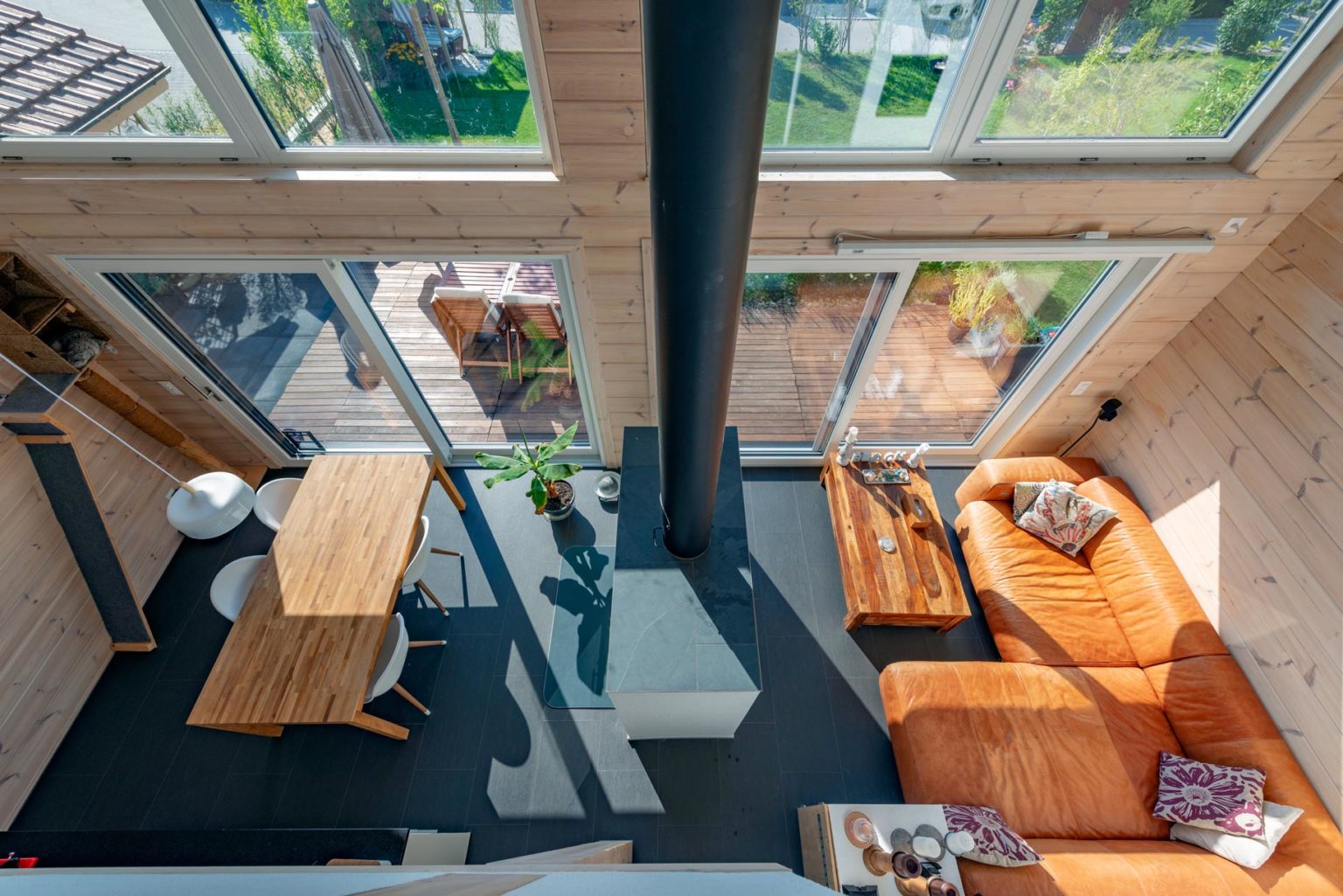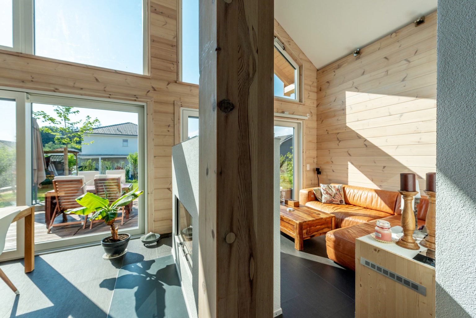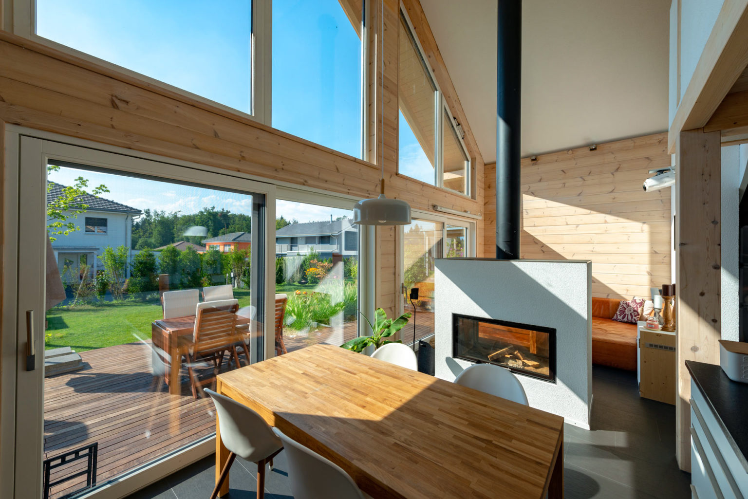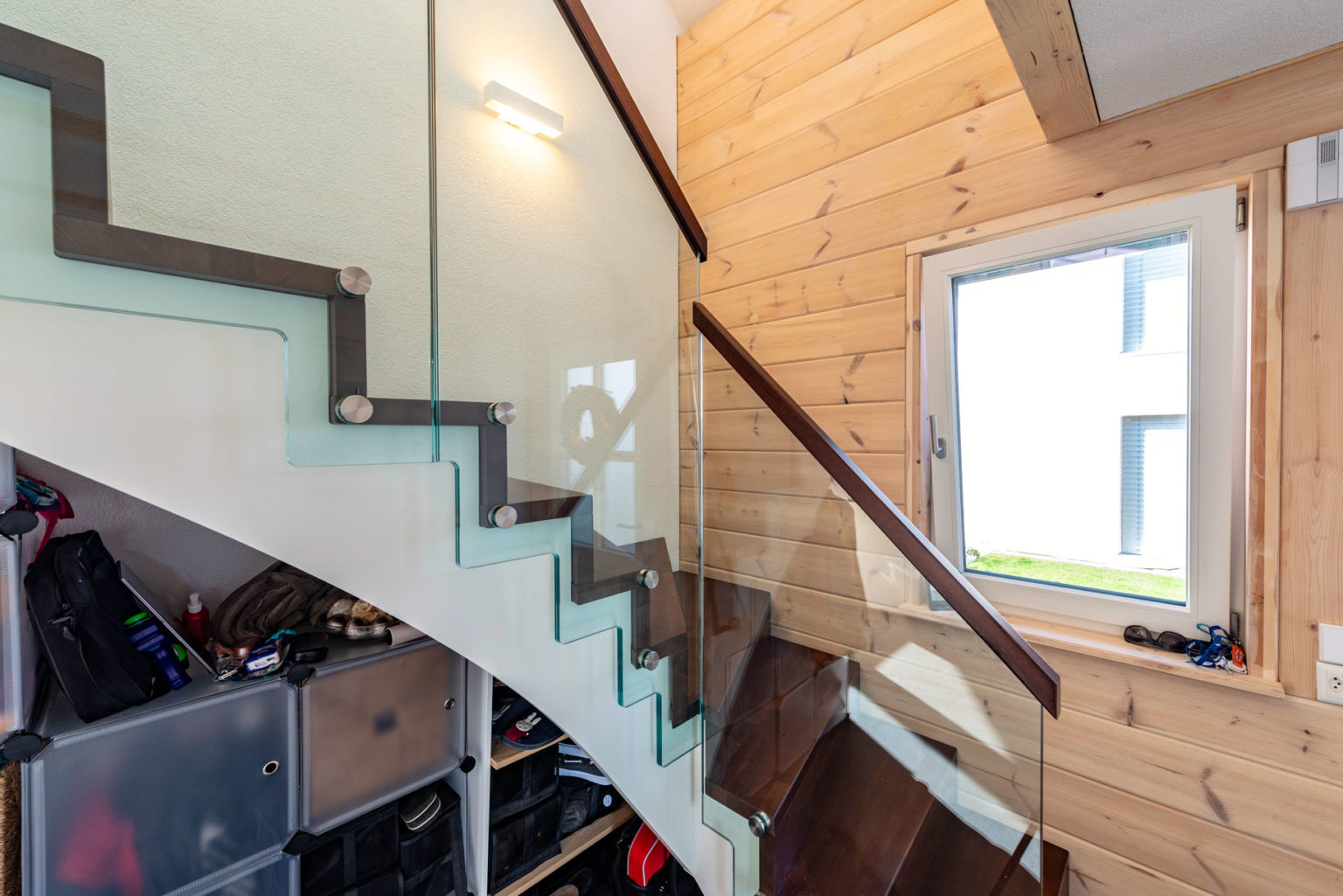 Das junge Paar hat sich sein Holzhaus von Fullwood liefern und aufbauen lassen. Nachdem der Rohbau stand, organisierten und koordinierten sie ortsansässige Fachhandwerker für den Innenausbau, auch um als Lokalpatrioten die schweizer Wirtschaft zu stärken. „Unser Holzhaus haben wir zwar vom deutschen Holzhausspezialisten gekauft - der hat uns qualitativ und optisch einfach überzeugt – aber die Gewerke des Innenausbaus vergaben wir an unsere Landsleute im Berner Mittelland.“, so der Hauseigentümer. Er selbst hat sogar eigenhändig die Elektroinstallationen vorgenommen, nachdem er im Vorfeld die Elektro- und Wasserplanung gemacht hatte. Beheizt wird Holzhaus „Mittelland“ mittels einer Luftwärmepumpe und Fußbodenheizung, der Kamin ist hauptsächlich für die Übergangszeit da und für die Gemütlichkeit. „Unsere verglaste Giebelwand bringt neben viel Helligkeit auch Sonnenwärme ins Haus. Im Winter ist das toll, aber im Sommer, der ja auch hierzulande immer sonniger wird, wird es trotz Wärmeschutzglas zu heiß. Wir schaffen uns deshalb noch Sonnenschutz für die Westseite an.“, argumentiert die Hausherrin. Neben den großen Fensterflächen bestückten die Künzlers die Galerie und die Treppe mit Glasplatten als Brüstung. Oben auf den frei stehenden Glasplatten sind handwarme Eichenholz-Handläufe, die identisch mit den Eichenholztritten der Geschosstreppe sind.
