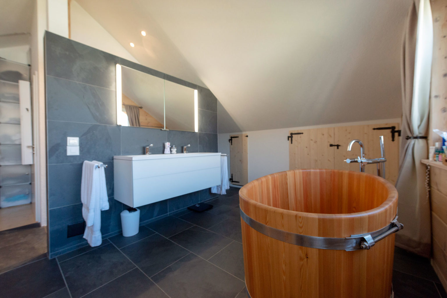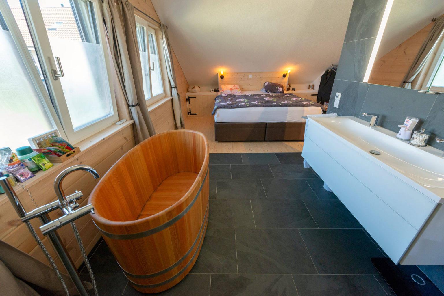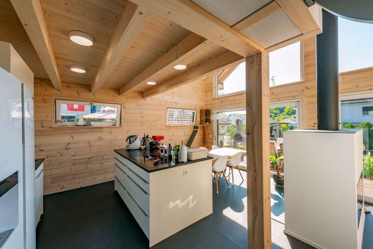 Dort schwingt Thomas das Zepter – besser gesagt den Kochlöffel - und Kim darf sich aufs Genießen konzentrieren. Nicht nur das Haus selbst, sondern auch die Küche ist eine einmalige Maßanfertigung: „Die Kochinsel ist mit 1 Meter höher als üblich, das macht es mir bequemer.“, so der Hausherr. Selbstverständlich ist der Backofen in praktischer Augenhöhe und Raffinessen wie ein durch Berührung bedienbarer Wasserhahn und ein Mülleimer, der durch Tritt aufs Pedal herausgefahren wird sowie der Muldenlüfter in Herd-Nähe erleichtern die täglichen Kochfreuden. Auch die Fußbodenbeläge sind besonders in Holzhaus „Mittelland“. „Holzdielen im Holzhaus wären uns rein optisch zu viel Holz gewesen, deshalb haben wir eine andere Lösung gefunden: Unsere anthrazitfarbenen Bodenfliesen sehen zwar wie Steinfliesen aus, bestehen aber aus Holzschichten. Der Boden ist sehr hart und wasserdicht, hat aber den Vorteil, dass er fußwarm wie Holzdielen ist.“, freut sich Thomas Künzler. „In den Nassräumen haben wir aber Schieferfliesen für Böden und teilweise auch für die Wände gewählt, und im Schlafbereich laufen wir über Kieferndielen von Fullwood.“, ergänzt Kim Künzler. Eine weitere, maßangefertigte Besonderheit stellt auch das schwarze Kaminrohr dar: Es ist mit seinen 20cm Durchmesser eine Sonderanfertigung, und thront wie eine Säule auf dem Kaminofen inmitten des offenen Wohnzimmers. Farblich passend dazu ist die schwarze Granitplatte auf der Kochinsel.