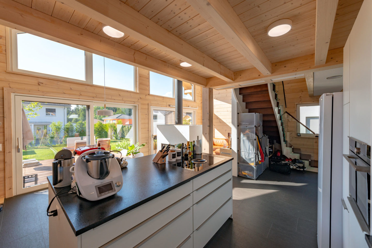 Die nach Westen ausgerichtete Giebelseite (Gartenseite) von Holzhaus „Mittelland“ ist über die gesamte Geschosshöhe verglast. Reichlich natürliches Licht dringt in den gesamten Wohnbereich ein, und durch den hohen, offenen Luftraum ist auch die Galerie lichtdurchflutet. „Viel natürliches Licht und helle Räume sind uns ein großes Anliegen in unseren vier Wänden.“, betont Thomas Künzler. Deshalb haben der Hobbykoch (Mitglied der „Berner und Schweizer Hobbyköche“) und seine Frau die 27cm dicken Blockwände innen wie außen mit weißen Pigmenten (Lasur) etwas aufgehellt und mit UV-Schutz gegen natürliches Nachdunkeln behandelt. So bleibt das Kiefernholz dauerhaft schön hell. Zudem kombinierten die Künzlers weiß tapezierte Trennwände (leichter Ständerbau) im Hausinnern zu den Massivholzwänden und wählten Holzfensterrahmen in weißer Farbe. Auch die Dachschrägen wurden weiß tapeziert. Perfekt dazu passend sind die weißen Zimmertüren und die weiße, moderne Hochglanzküche.