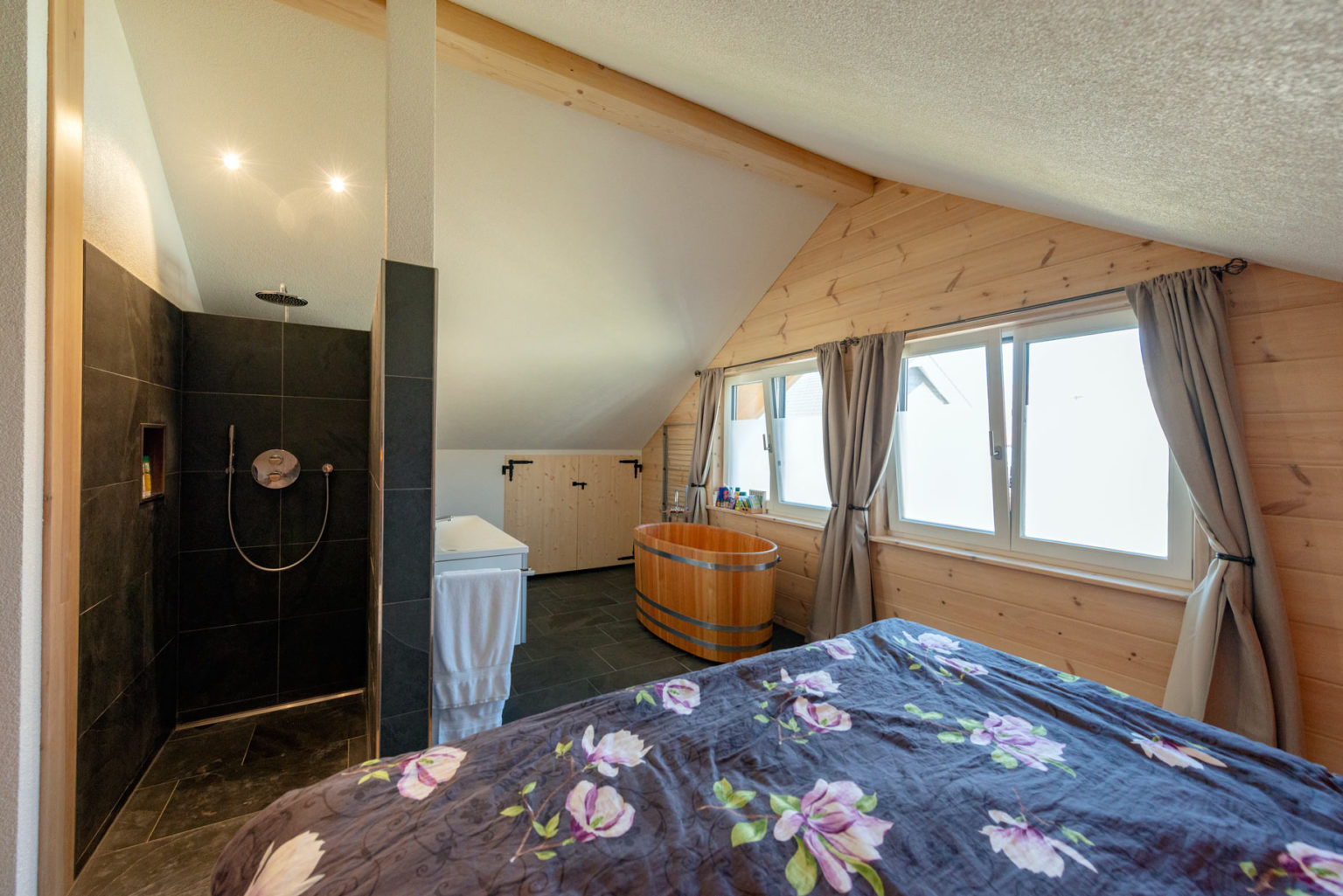 Der rechteckige Grundriss von Holzhaus „Mittelland“ umfasst im Erdgeschoss einen sehr geräumigen, offenen Wohnbereich, der Entree, Küche, Esszimmer und Wohnzimmer beinhaltet. Als optische Trennung zwischen Wohnen und Essen/Kochen fungiert ein moderner, weiß verputzter Kaminofen-Kubus, der sowohl zur Sofaecke als auch zum Esstisch hin je ein Sichtfenster besitzt. Der Küche angeschlossen sind ein großer Vorratsraum und ein Technikraum, außerdem gibt es noch eine Gäste-Dusche/WC, die vom Entree erreichbar ist. Über dem Wohn- und Essbereich ist der Luftraum offen bis zur Firstpfette, wodurch ein sehr freies und großzügiges Wohngefühl entsteht. Über den anderen Bereichen des Erdgeschosses befindet sich eine eindrucksvolle Sichtbalkendecke, die gleichzeitig als optische Bereichstrennung zwischen Küche und Wohnen/Essen dient. Vom Entree geht es hinauf ins Dachgeschoss. Dort gelangt man von einer Galerie in das Schlafzimmer von Thomas und Kim Künzler. Der Clou: in den großen, firsthohen Raum ist auch das Wellness-Bad mit Holzbadewanne, modernem Komfort-Doppelwaschbecken und großer schwellenloser Dusche integriert. Da dieser Bereich ausschließlich dem Ehepaar zur Verfügung steht, ist auch die Intimsphäre gewährt und insgesamt hat man ein großzügigeres Wohngefühl.