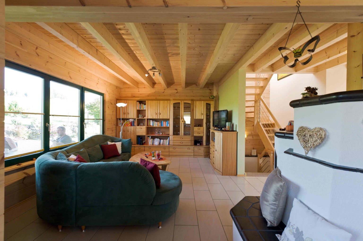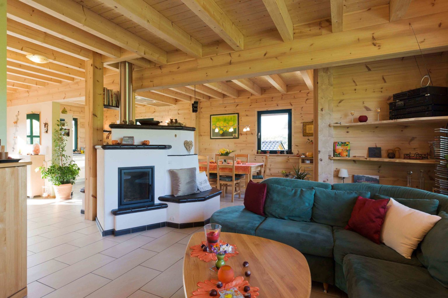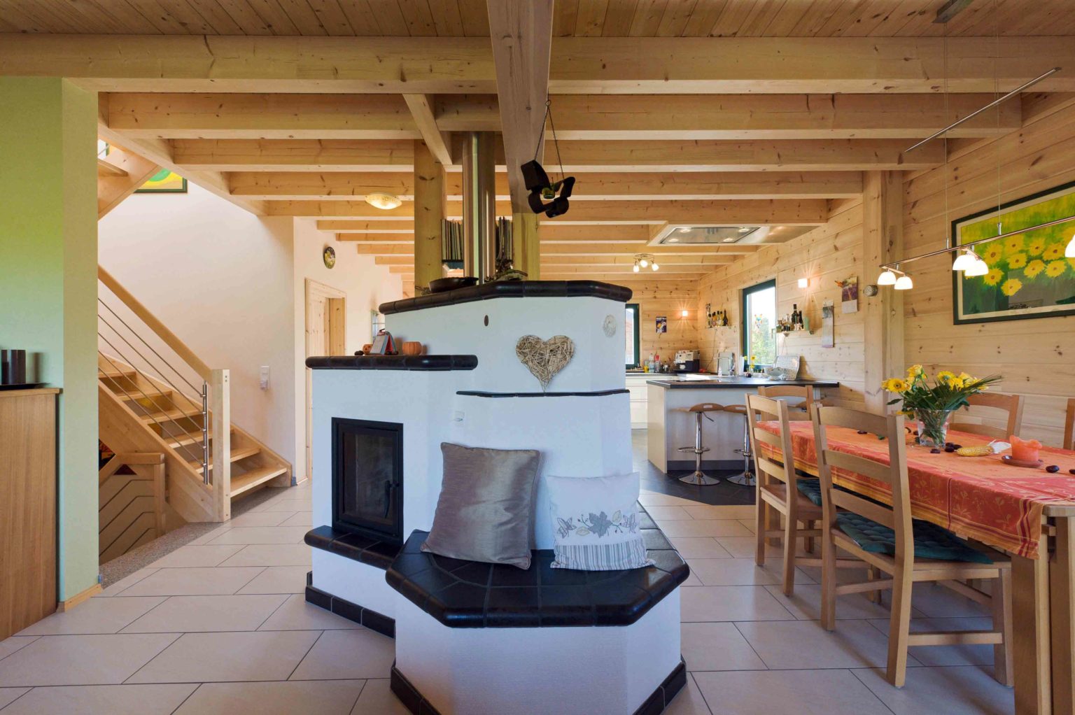 "Im Winter haben wir noch nie gefroren und im Sommer heizt sich das Holzhaus nicht auf.“, stellt der Hausherr fest. Dabei wird hauptsächlich mit dem großen Kaminofen im Wohnbereich geheizt, dessen Strahlungswärme sich im gesamten Wohnbereich verbreitet. Lediglich Bad, Kinderzimmer und Keller haben eine Fußbodenheizung, die von einer Gastherme versorgt werden kann. „Im Winter befeuern wir den Ofen nur einmal täglich, meist am frühen Abend. Das reicht, um das Haus 24 Stunden warm zu halten.“, fährt Frank Tomitz fort.