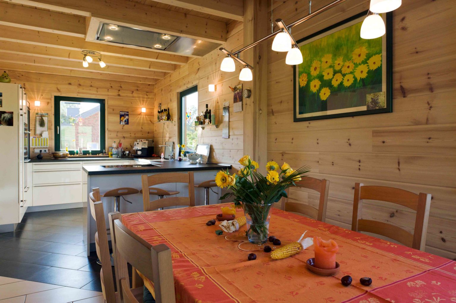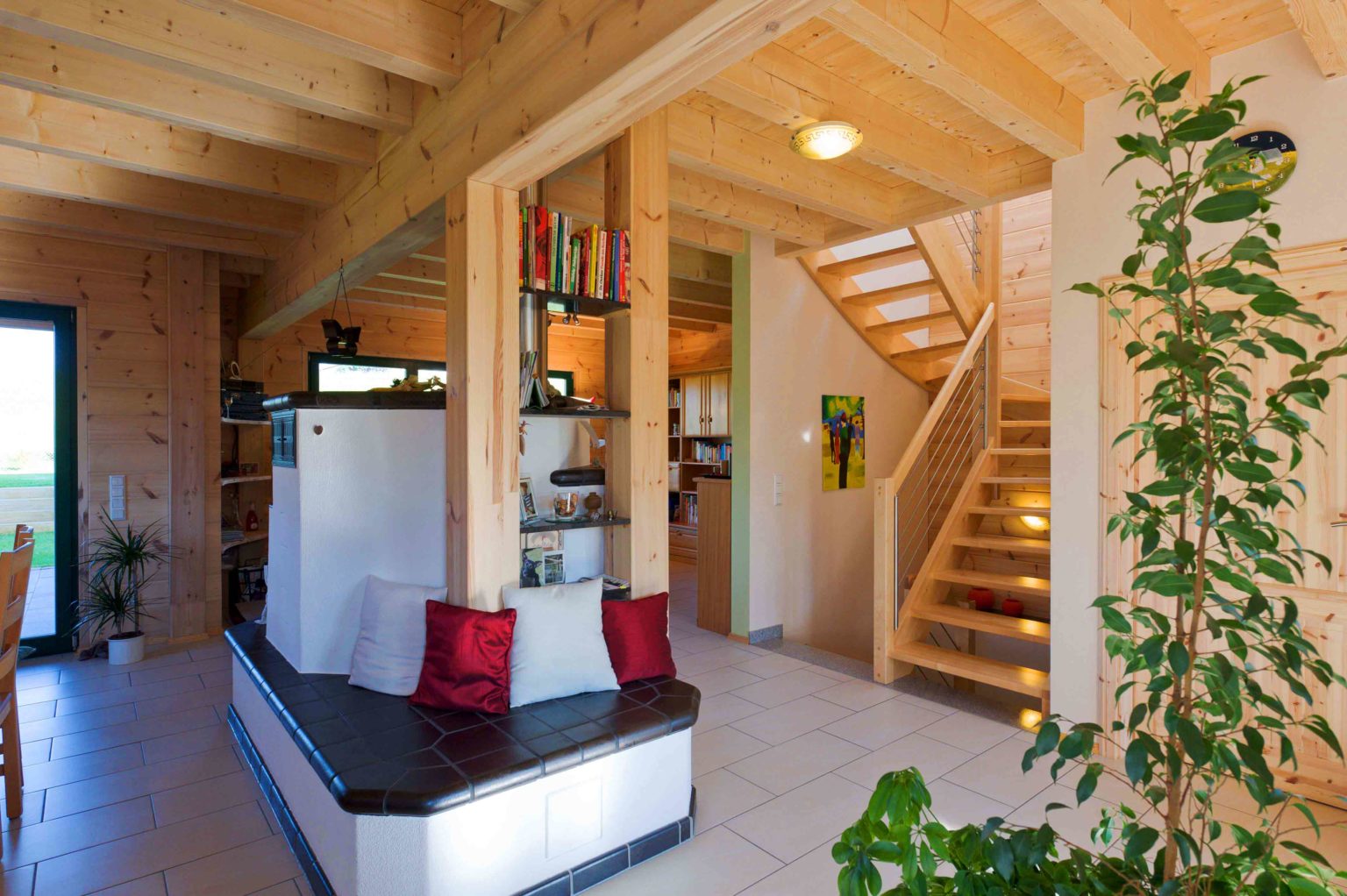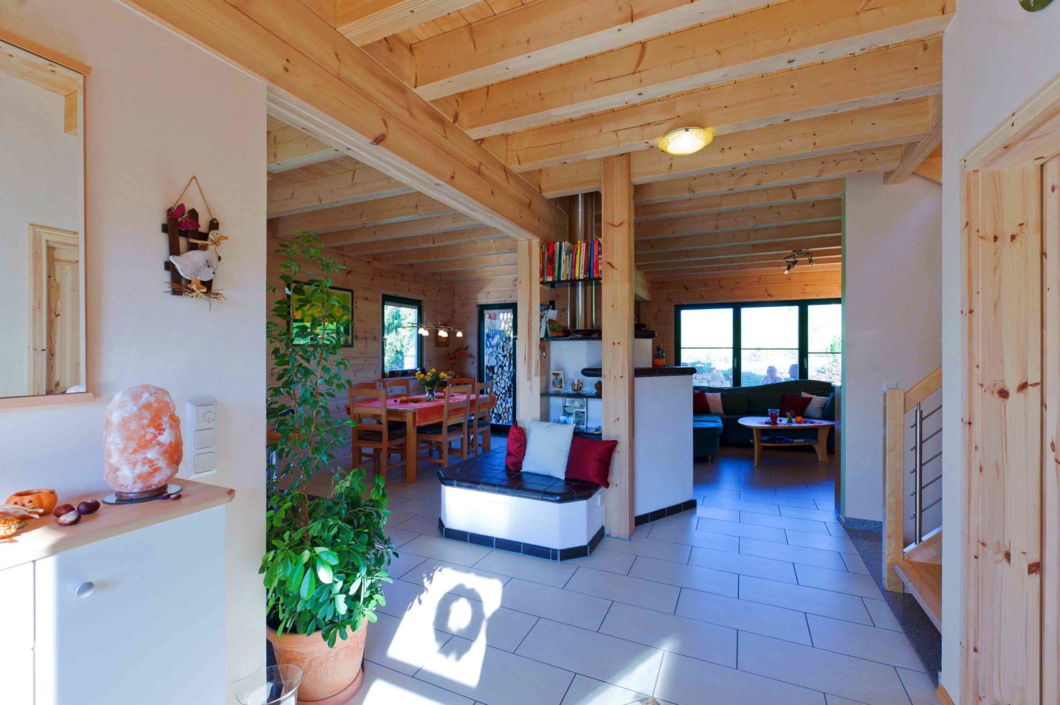 "Im Winter haben wir noch nie gefroren und im Sommer heizt sich das Holzhaus nicht auf.“, stellt der Hausherr fest. Dabei wird hauptsächlich mit dem großen Kaminofen im Wohnbereich geheizt, dessen Strahlungswärme sich im gesamten Wohnbereich verbreitet. Lediglich Bad, Kinderzimmer und Keller haben eine Fußbodenheizung, die von einer Gastherme versorgt werden kann. „Im Winter befeuern wir den Ofen nur einmal täglich, meist am frühen Abend. Das reicht, um das Haus 24 Stunden warm zu halten.“, fährt Frank Tomitz fort.