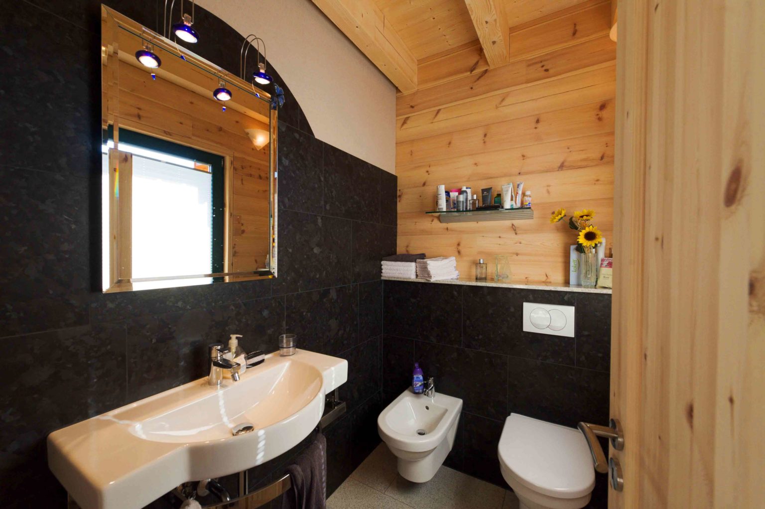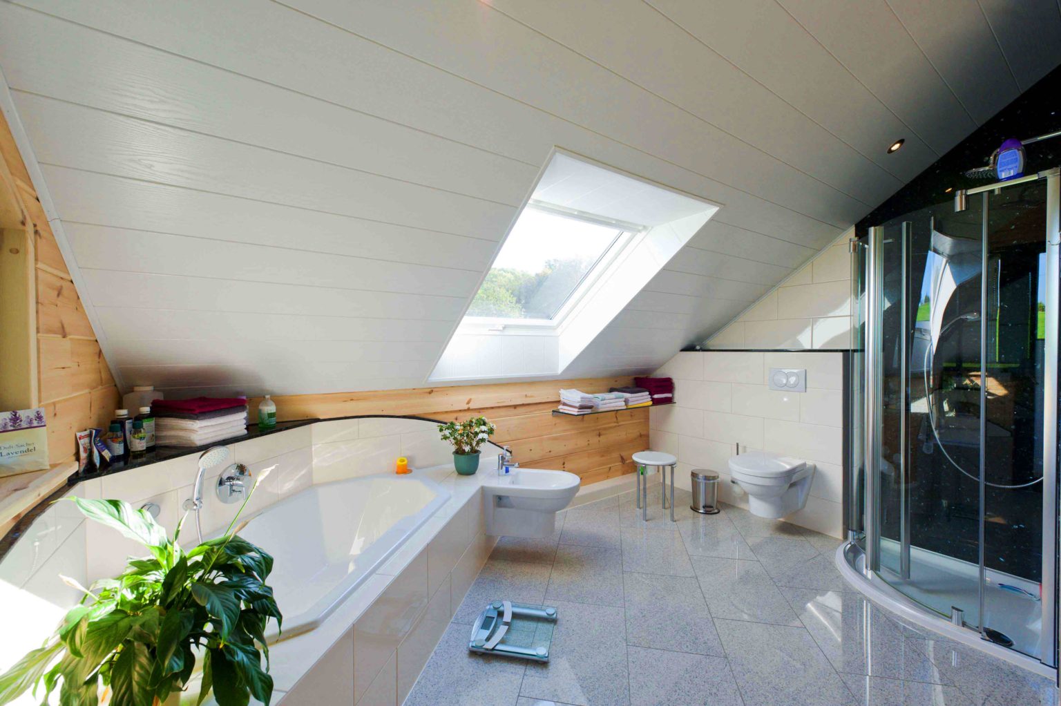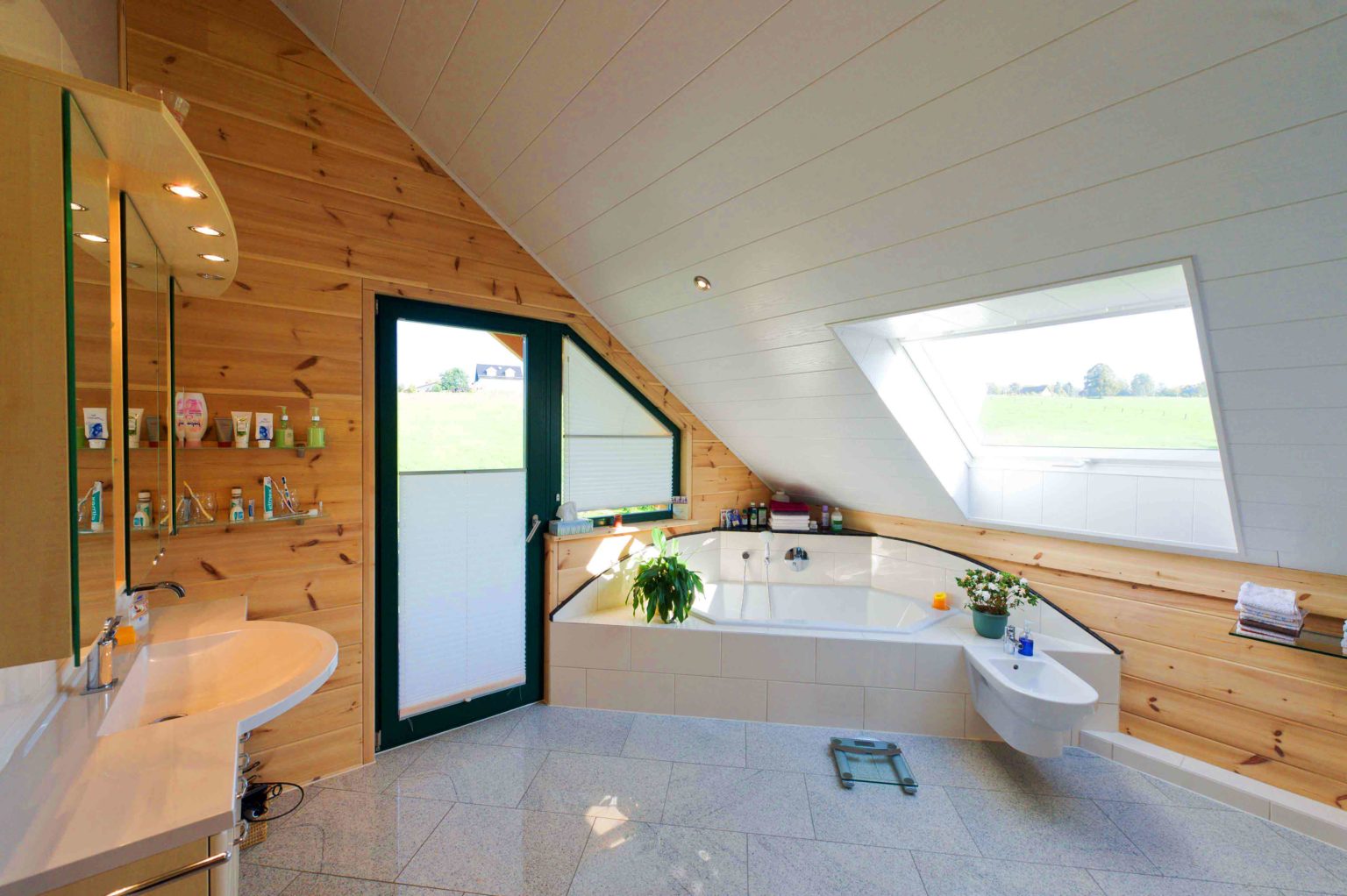 Weiß und hellgrün verputzte Trennwände betonen das helle, moderne Landambiente von Holzhaus „Mücher Sonne“. Geräumig und dennoch gemütlich wirkt es. „Verglichen mit unserem riesigen Steinhaus in der Eifel kam mir dieses Holzhaus zuerst klein vor.“, erzählt Mechtild Tomitz. „Jetzt bin ich aber sehr zufrieden mit allem. Meine Töchter werden ja auch nicht mehr allzu lange hier wohnen, deshalb haben wir die Kinderzimmer nicht überdimensioniert.“ Besonders schick sind Gäste-WC/Dusche und Badezimmer geraten: Das Schwarz und Weiß von Steinfliesen und Sanitäranlagen wirkt dank der Holzwände nicht kalt. Die Dusche erhielt sogar zwei riesige Granitplatten als Spritzschutz, nicht allein wegen der tollen Optik: „Ich wollte keine Fugen putzen.“, gibt die Hausherrin freimütig zu. Dass sie ansonsten keine Arbeit scheut, bewies Mechtild Tomitz beim Hausausbau, wo sie überall mit Spaß an der Freud angepackt hat - besonders die Außenpflasterung und Gartenarbeit sind ihr Werk. Die vielen schönen Pflanzen sind vom alten Haus mit zur „Mücher Sonne“ gezogen, Mechtild hat sie alle eigenhändig ausgebuddelt und wieder eingegraben. Ein riesen Akt!