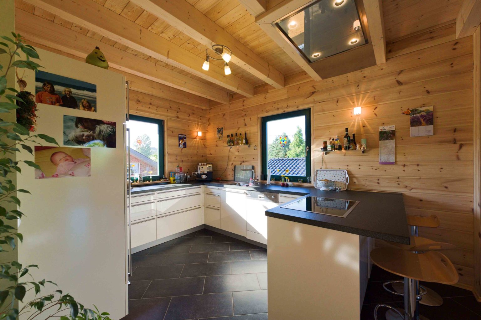 Ganz individuell ging der Hersteller des Holzhauses bei der Planung auf die Wünsche und Vorstellungen der Familie ein. Besonders wichtig: Ein offener, heller Wohn-Ess-Kochbereich, wo die Familie gerne zusammenkommt, und man sich beim Kochen mit Gästen unterhalten kann. Durch eine zusätzliche Balkenlage mehr gewinnen die Geschosse an Höhe. Nach einer Galerie mit offenem Luftraum stand den Tomitz` nicht der Sinn, da diese dem Dachgeschoss viel Wohnfläche geraubt hätte und nach Meinung des Paares auch auf Kosten der Gemütlichkeit gegangen wäre. Jetzt haben oben zwei Kinderzimmer für die (fast) erwachsenen Töchter, ein Schlafzimmer und ein geräumiges Wohn-Bad Platz, alle vom Flur aus erreichbar. Die Mädchen teilen sich einen Balkon, die Eltern haben ihren eigenen. Hinauf gelangt man über eine Holztreppe, die von der zum Wohnraum hin offenen Diele abgeht. Im Erdgeschoss thront der große Kaminofen in der Hausmitte, von wo aus sich seine Wärme auch durchs Treppenhaus nach oben gleichmäßig ausbreitet, und fungiert als Raumteiler. Kochen und Essen bilden einen Bereich. Sie erhalten rund um die Uhr Sonnenlicht von draußen. Ein überdachter Freisitz schließt sich dem Essbereich an und schafft innen eine gemütliche Ecke, in welche sich die Sofalandschaft fügt. Diese profitiert optimal von der späten Nachmittags- und Abendsonne, welche durch die tiefer gelegten Fenster großflächig eindringt. Das helle Kiefernholz wurde mit UV-Schutz behandelt um Nachdunkeln zu verhindern. Die Böden wurden durchgängig mit großen, hellen Fliesen belegt – bis auf die Küche, deren schwarze Fliesen eine räumliche Begrenzung anzeigen und sich farblich auf der Ofenbank und den Arbeitsplatten der weißen Küchenmöbel wiederfinden.