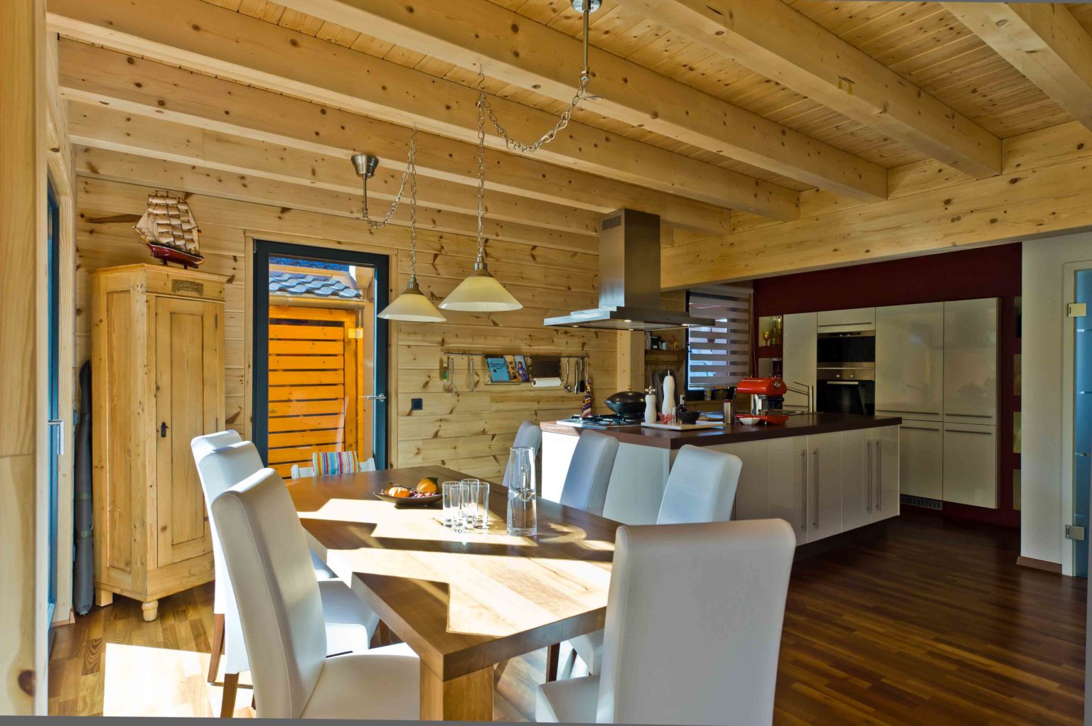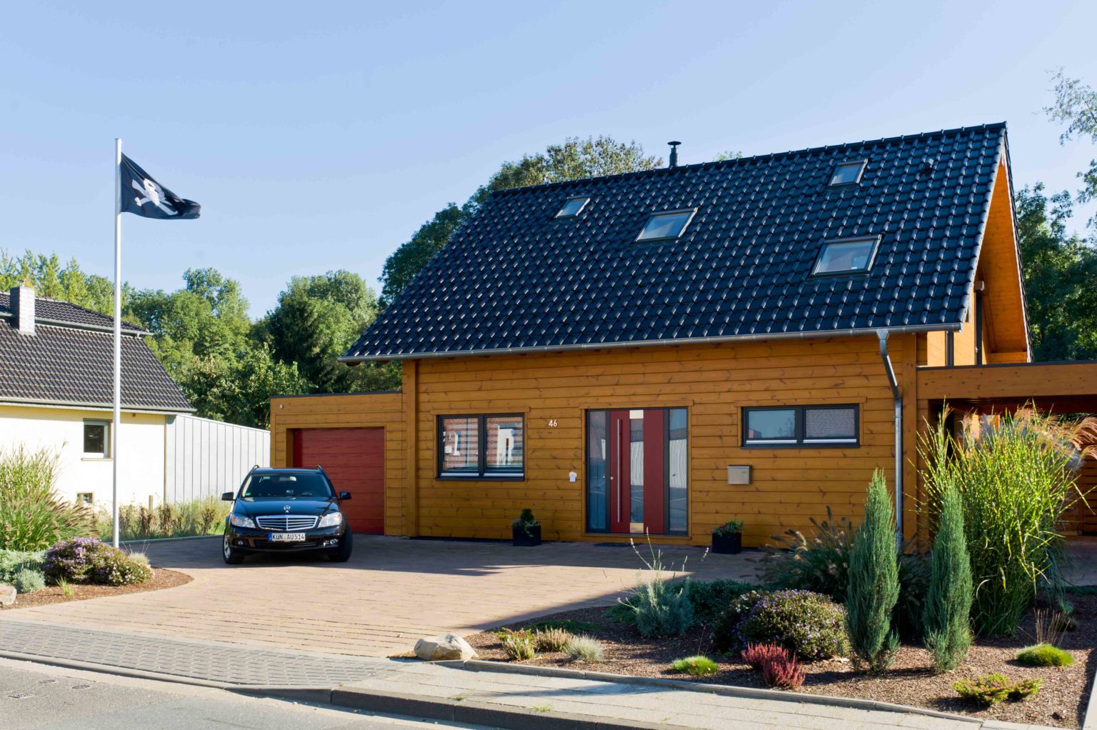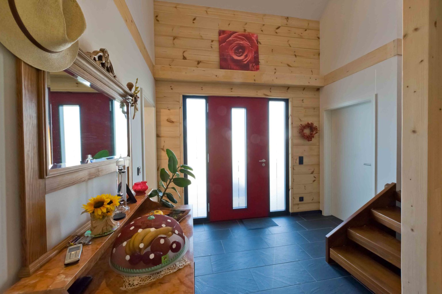 Sogleich sorgte das Blockbohlen Holzhaus „Mühlenbach“ für Aufsehen: Immer wieder hielten vorbeifahrende Passanten an, um sich alles genau zu begucken, und noch heute klingeln ab und zu Neugierige, die selbst bauen möchten. Glück hat, wem Einlass gewährt wird, denn die schlichtere Eingangsseite entwickelt sich auf der Gartenseite zur spektakulären, voll verglasten Front mit rechteckigem, über zwei Etagen verlaufenden Erkervorbau, der ebenfalls bis zum Giebel verglast ist. Alle Fensterrahmen sind aus Holz und, den Ton-Dachziegeln entsprechend, anthrazitfarben. Dieser dunkle, ruhige Farbton ergänzt den hellen warmen Natur-Ton der Kiefernholzwände kontrastreich. Die dazu kombinierte moderne Eingangstüre aus Glas und dunkelrotem Holz passt farblich und stilistisch perfekt zum Holzhaus und wirkt sehr einladend.