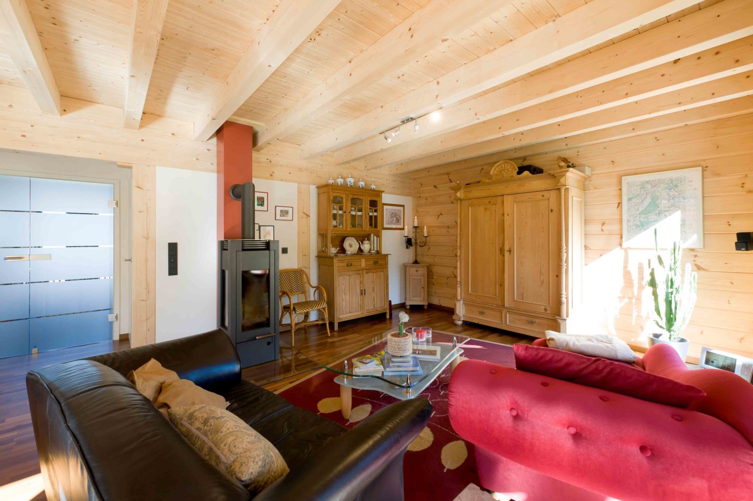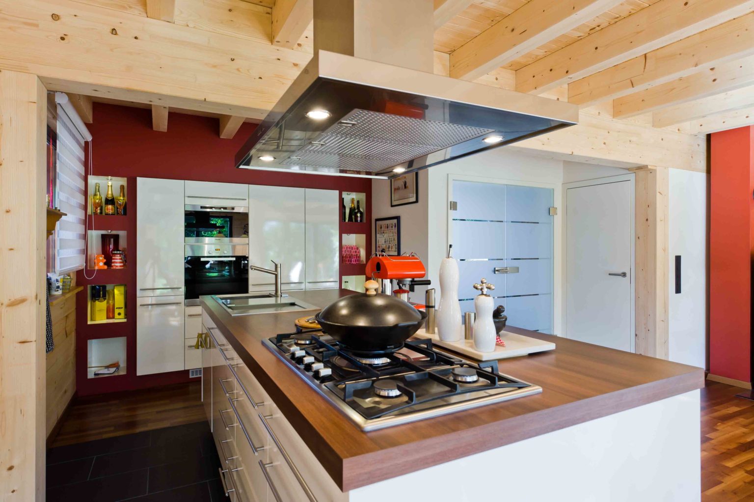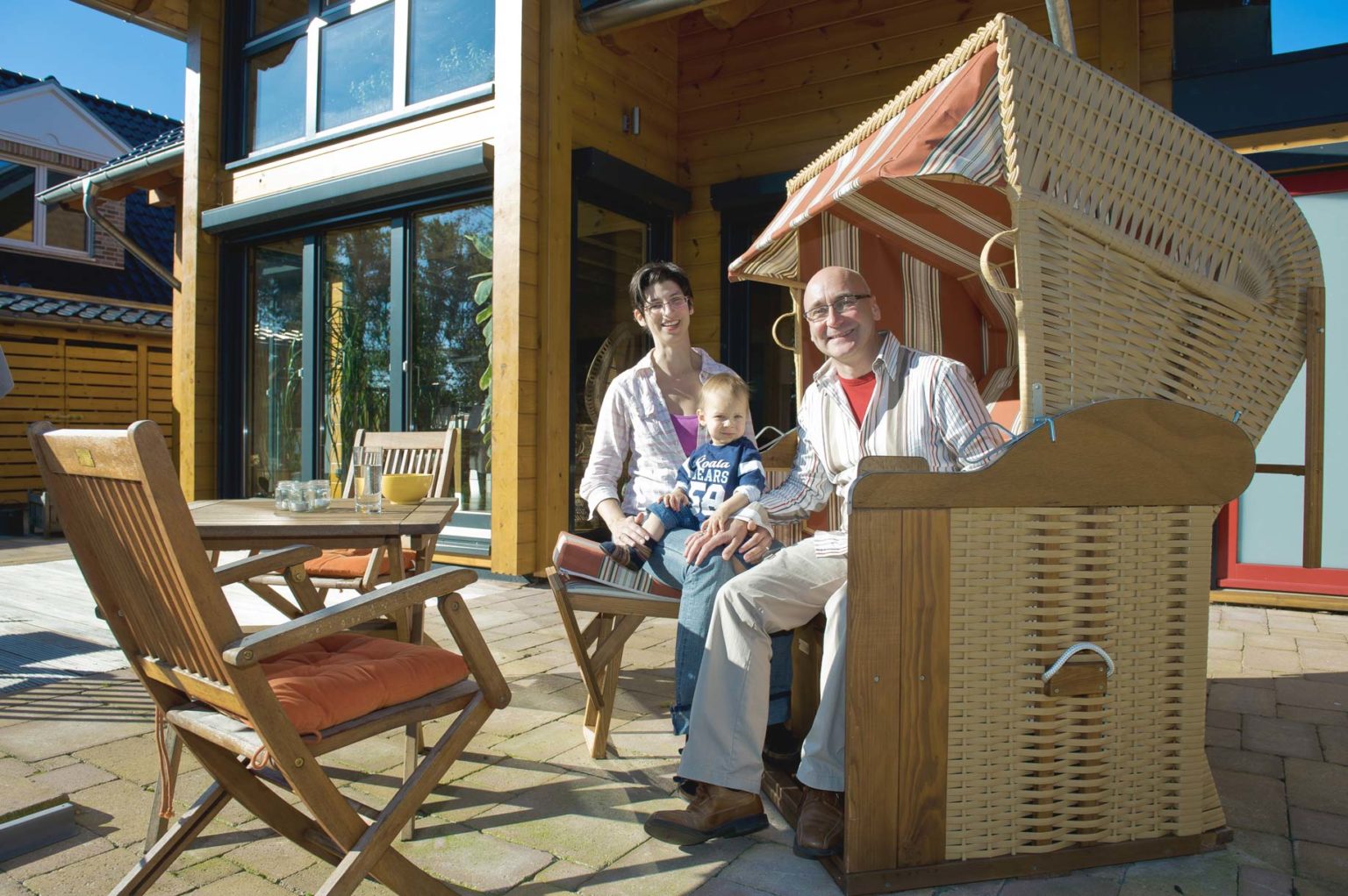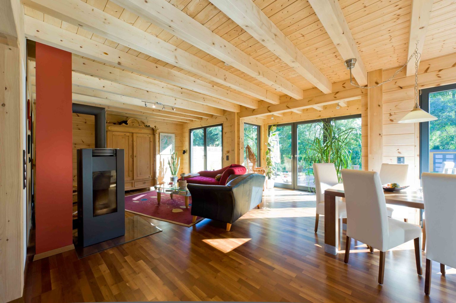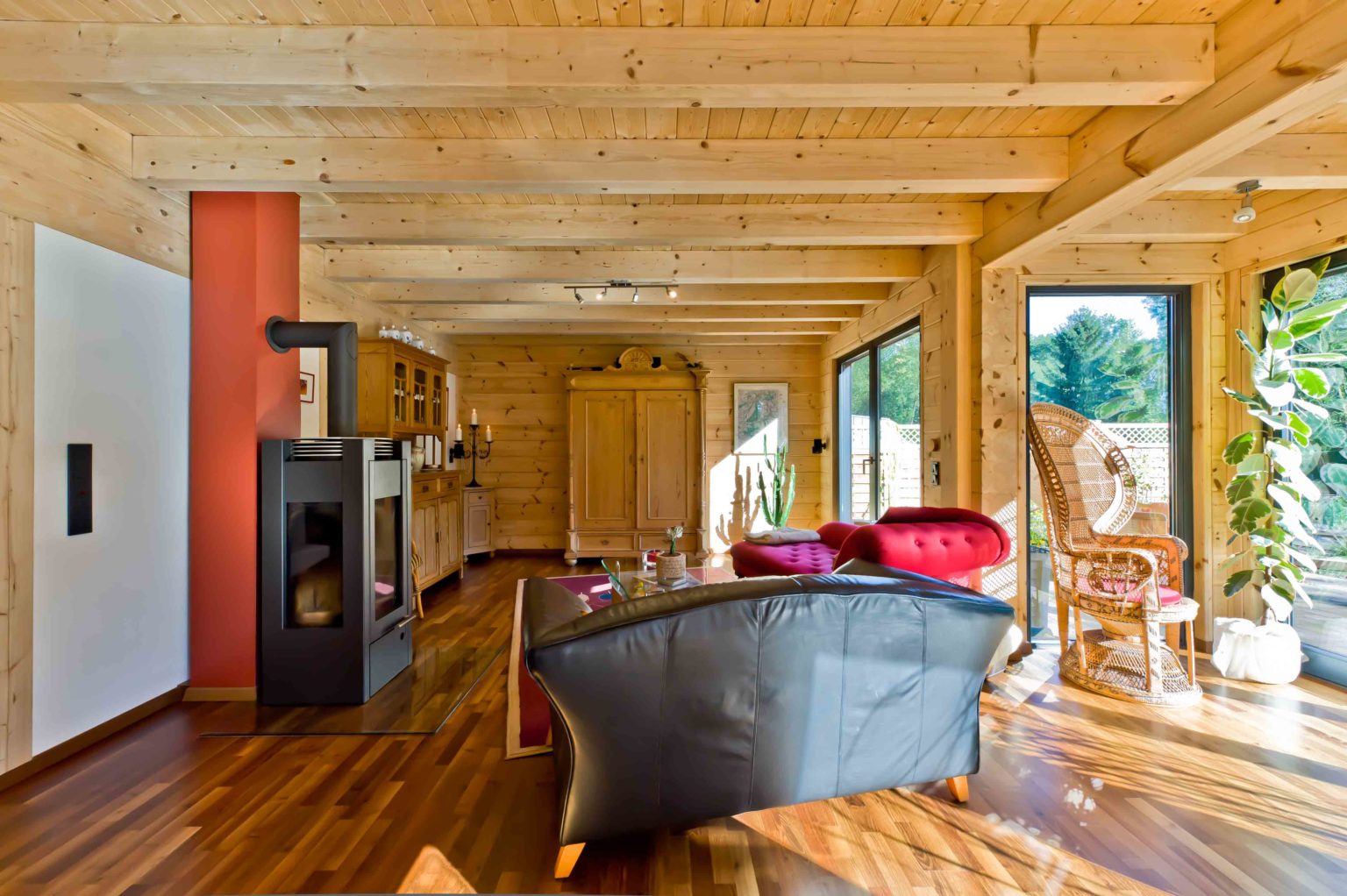 Den neuesten Trends folgend hat die junge Familie Energiefragen in ihrem Holzhaus beantwortet. Das Wasser für Bad, Küche und teilweise Fußbodenheizung wird über die Solaranlage auf dem Dach erwärmt, im Winter leistet die Luft-Wasser-Wärmepumpe gute Dienste, während der mit Holzscheiten befeuerte Kaminofen rasch für knisternde Wärme sorgt. Unterstützt wird dieses System von einer Umluftanlage, deren Wärmetauscher frische Luft von außen ansaugt, gegen die verbrauchte Raumluft austauscht und diese nach außen abgibt. Innerhalb einer Stunde findet ein kompletter Luftaustausch statt – Fenster öffnen entfällt somit fast ganz. Rollladen an den großen Fenstern schützen vor zu viel Sonnenwärme im Sommer, wenn Holzhaus „Mühlenbach“ von mittags bis zum frühen Abend von der Sonne bestrahlt wird. Mit gutem Gewissen und dem Gefühl, alles richtig gemacht zu haben, genießen Jennifer, Peter und das kleine Söhnchen seitdem das Leben in ihrem individuellen Holzhaus.