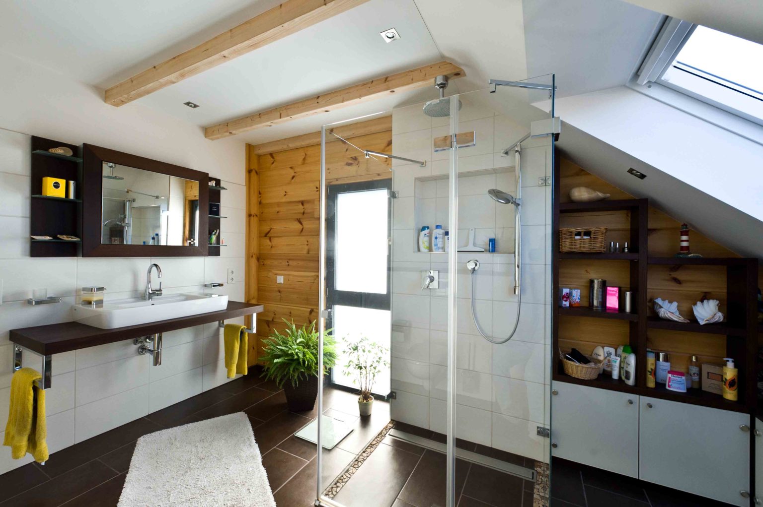 Das bis zum First offene Dachgeschoss dient den Holzhaus-Bewohnern als intimer Rückzugsort. Gästezimmer, Kinderzimmer, Wohnbad und Elternzimmer nebst Ankleide finden dort, unter den weiß verkleideten Dachschrägen, Platz. Abgesehen von den Außenwänden aus massiver Kiefer, finden sich dort oben ausschließlich weiß verputzte Ständerbau-Trennwände um den Eindruck von Helligkeit und Leichtigkeit zu unterstreichen.