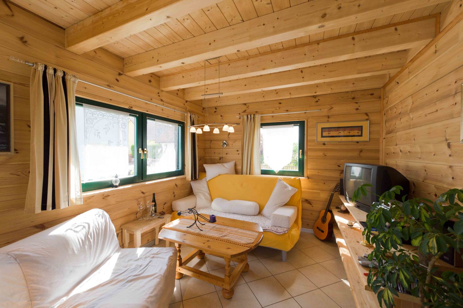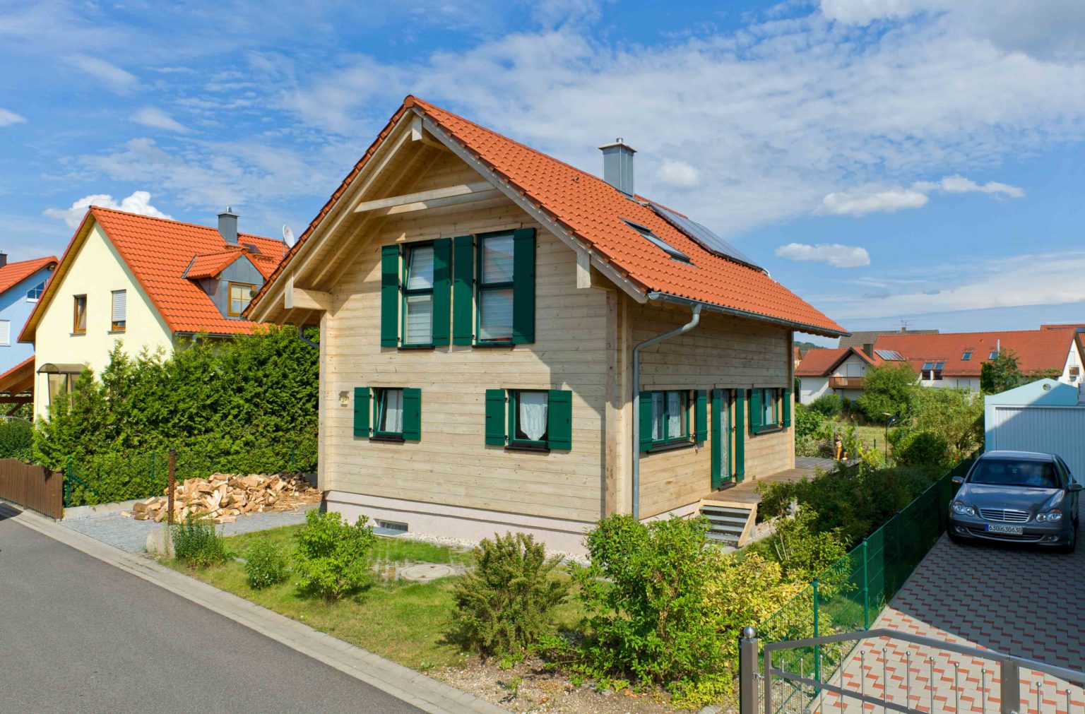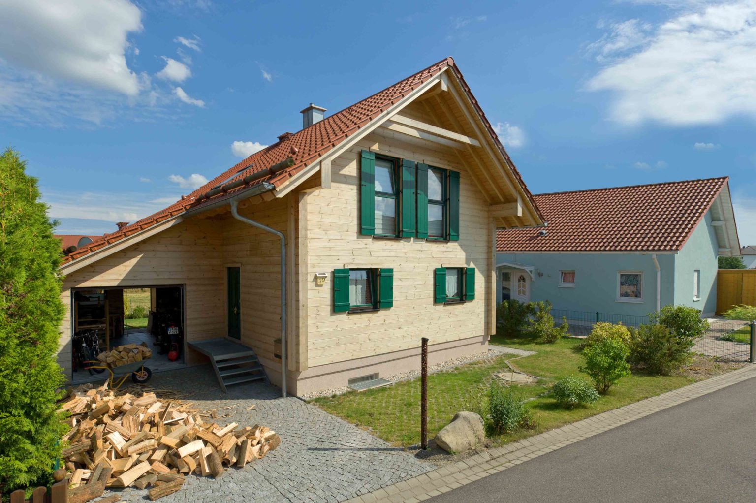 Holzhaus Naabtal in regionaler Bauweise mit grünen Fensterläden