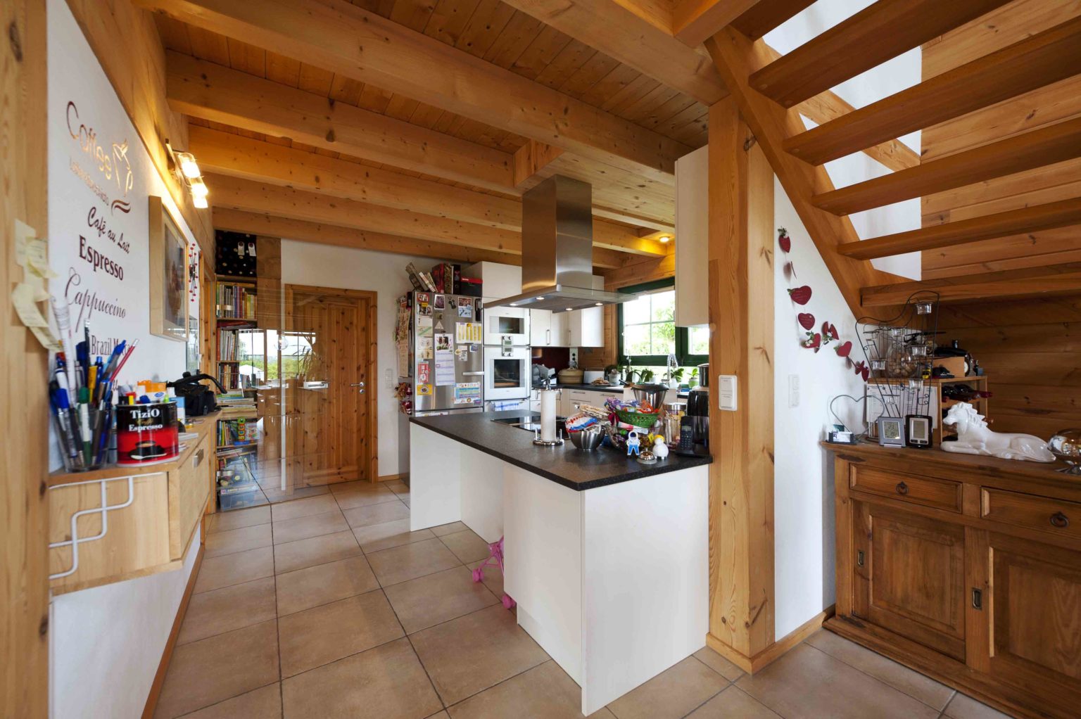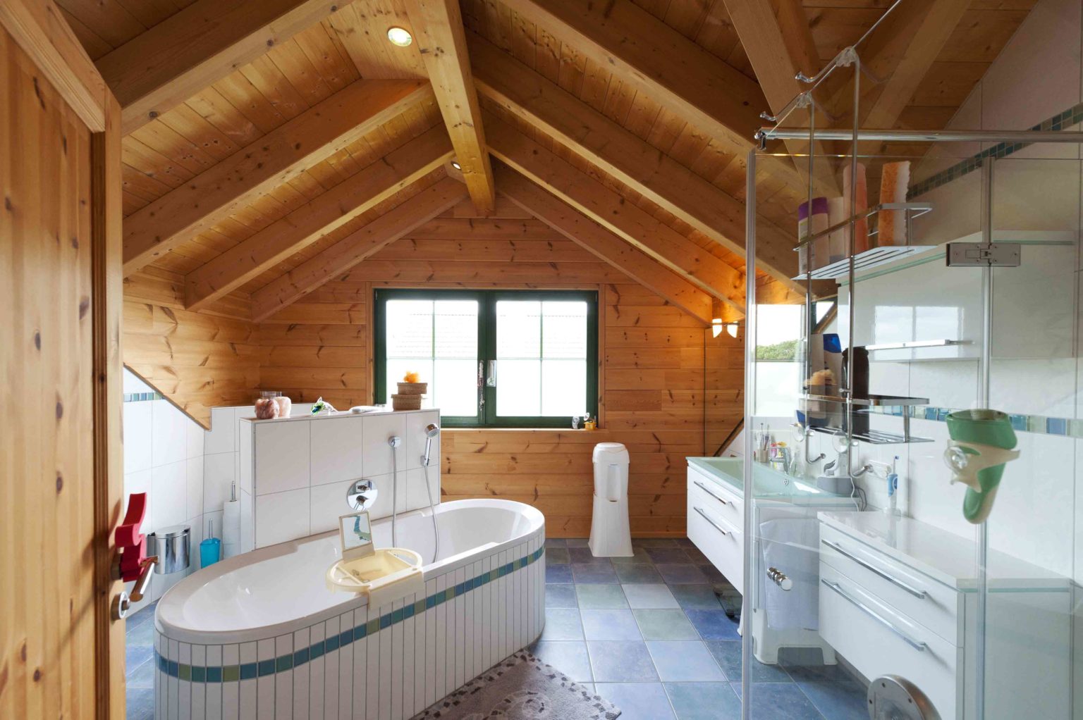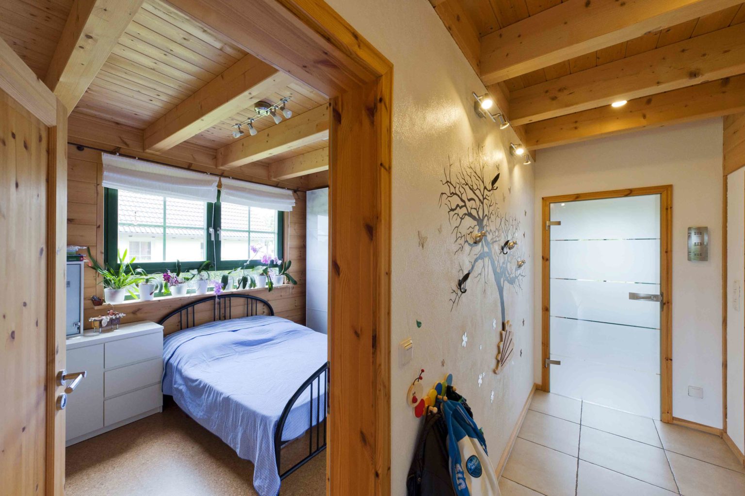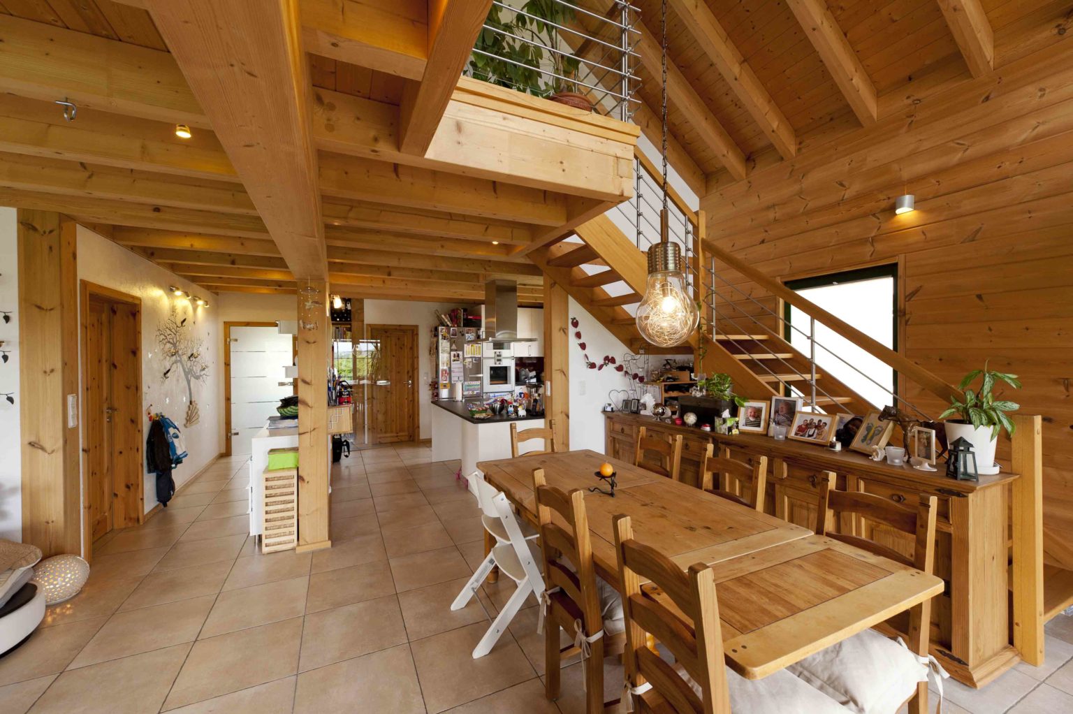 Das Ehepaar zog ein, nachdem die Galerie fertig gebaut war. Die Stromkabel zog der Hausherr selbst durch die nach der ursprünglichen Planung vorgebohrten Kanäle. Ansonsten überließ er die Restarbeiten aber lieber Fachfirmen, zumal er selbst beruflich stark eingespannt war. Er ließ noch Dachfenster einbauen, um mehr Licht ins Dachgeschoss zu bringen, denn das sollte nun voll genutzt werden. Die Trennwände aus Ständerwerk ließ er weiß verputzen, um zusätzliche Helligkeit ins Holzhaus zu bringen. Die hellen Kiefernwände dürfen drinnen leicht nachdunkeln, wurden draußen aber mit Witterungsschutz gestrichen, um die Optik zu erhalten. „Ohne Schutzanstrich würden die Außenwände langsam und unregelmäßig vergrauen, das hätte uns nicht gefallen. Für die Lebensdauer des Gebäudes wäre aber kein Schutzanstrich nötig gewesen.“, sagt Alexander Kolf. Ganz nach ihrem Geschmack wählten die Kolfs fürs gesamte Erdgeschoss und die Galerie einheitliche Bodenfliesen in einem hellen Sand-Ton, der wunderbar mit den Holzwänden harmoniert. Das Bad im Obergeschoss bekamen blaue Bodenfliesen und sämtliche Schlafräume einen fußwarmen Korkboden.