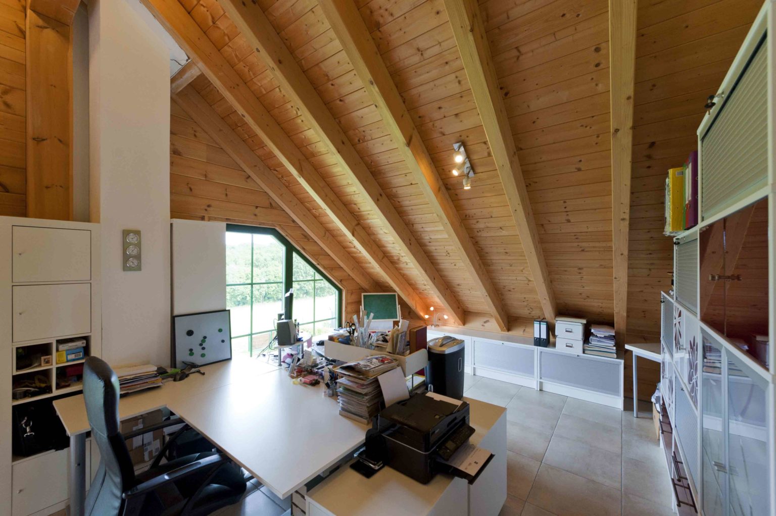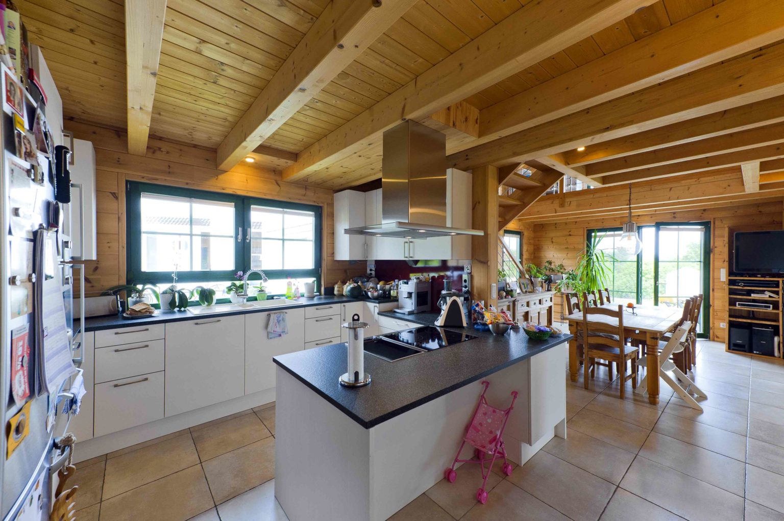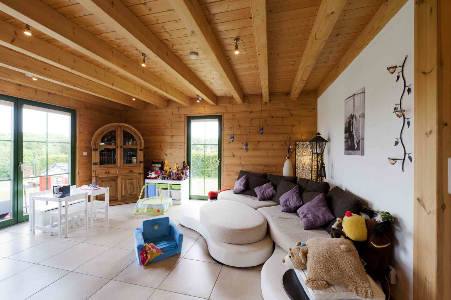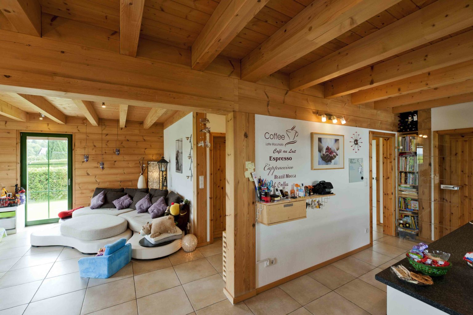Das Ehepaar zog ein, nachdem die Galerie fertig gebaut war. Die Stromkabel zog der Hausherr selbst durch die nach der ursprünglichen Planung vorgebohrten Kanäle. Ansonsten überließ er die Restarbeiten aber lieber Fachfirmen, zumal er selbst beruflich stark eingespannt war. Er ließ noch Dachfenster einbauen, um mehr Licht ins Dachgeschoss zu bringen, denn das sollte nun voll genutzt werden. Die Trennwände aus Ständerwerk ließ er weiß verputzen, um zusätzliche Helligkeit ins Holzhaus zu bringen. Die hellen Kiefernwände dürfen drinnen leicht nachdunkeln, wurden draußen aber mit Witterungsschutz gestrichen, um die Optik zu erhalten. „Ohne Schutzanstrich würden die Außenwände langsam und unregelmäßig vergrauen, das hätte uns nicht gefallen. Für die Lebensdauer des Gebäudes wäre aber kein Schutzanstrich nötig gewesen.“, sagt Alexander Kolf. Ganz nach ihrem Geschmack wählten die Kolfs fürs gesamte Erdgeschoss und die Galerie einheitliche Bodenfliesen in einem hellen Sand-Ton, der wunderbar mit den Holzwänden harmoniert. Das Bad im Obergeschoss bekamen blaue Bodenfliesen und sämtliche Schlafräume einen fußwarmen Korkboden.