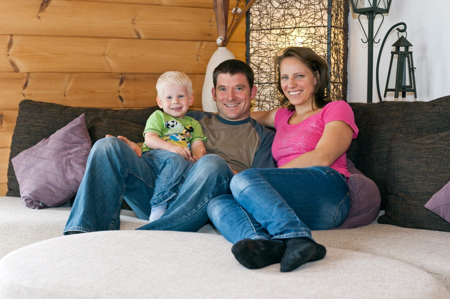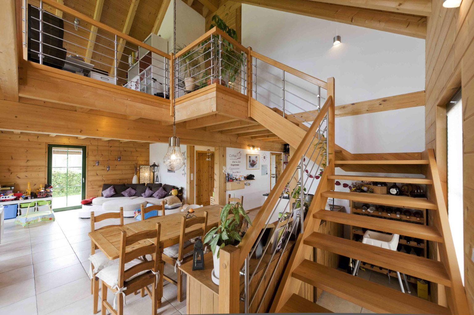 Zunächst war das Holzhaus noch nicht bezugsfertig, das heißt Küche, Bad und Innentüren fehlten, die Außenanlage war noch ein einziger Erdhaufen und eine Galerie im Dachgeschoss war gar nicht eingeplant. „Uns gefiel, dass es ein Neubau war und die technische Ausstattung modernsten Anforderungen entsprach. Die Fußbodenheizung wird mit einer Luft-Wärmepumpe betrieben und das Brauchwasser sowie in den Übergangszeiten auch die Fußbodenheizung werden solar erwärmt.“, argumentiert Alexander Kolf. „Aber wir brauchten mehr Wohnfläche, als vorhanden war und wollten keinen wertvollen Platz verschwenden. Schließlich waren wir gerade mit der Familienplanung beschäftig. So kamen wir auf die Idee, den großen Luftraum über dem Erdgeschoss zu verkleinern und eine Galerie einzubauen.“, fährt Hausherrin Peggy fort.