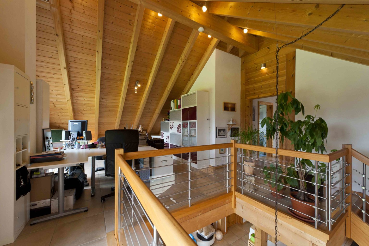 „Das tolle an unserem Holzhaus ist, dass man bei späterem Bedarf ohne großen Aufwand neue Innenwände einziehen oder bestehende Trennwände entfernen kann - unsere Familienplanung ist nämlich noch nicht abgeschlossen. Außerdem wollen wir hier uralt werden und man weiß nie, wie beweglich man später ist.“, findet Peggy Kolf. Das jetzige, sehr geräumige Duschbad/WC für Gäste im Erdgeschoss, direkt neben dem Gästezimmer, könnte später ohne Veränderung als Bad mit benachbartem Schlafzimmer dienen. Jetzt befinden sich im Erdgeschoss ganz klassisch ein Windfang mit Zugang zur Gästedusche/WC und Hauswirtschaftsraum, ein Flur der im offenen Wohn-Essbereich mündet, sowie eine zum Essbereich offene Küche. Die Geschosstreppe befindet sich ebenfalls im Wohnbereich und führt direkt auf die Galerie, wo hauptsächlich gearbeitet wird – wenn die herrliche Aussicht durch die großen, bodentiefen Fenster nicht zu sehr ablenkt. Von der Galerie geht es in den separaten Privattrakt mit kleinem Flur, geräumigem Wellnessbad in der großen Gaube, Schlafzimmer, Kinderzimmer und Bügel- bzw. Schrankraum. „Eigentlich war eine Sauna im Bad eingeplant, aber dann hätten wir nicht genug Platz für eine schöne, große Wanne gehabt. Die war uns aber wichtiger. Unser Schlafzimmer befindet sich im ehemaligen Arbeitszimmer und das große Schlafzimmer haben wir in Kinderzimmer und Schrankbereich unterteilt.“, erklärt Alexander Kolf die Abweichungen von der ursprünglichen Raumeinteilung.