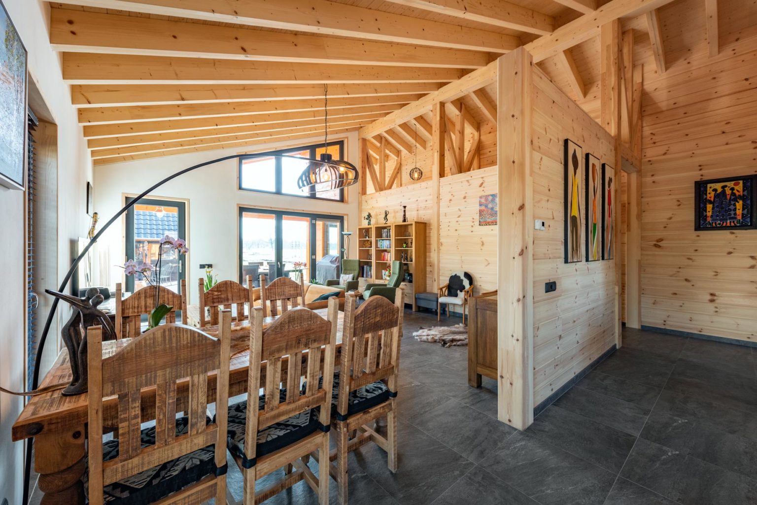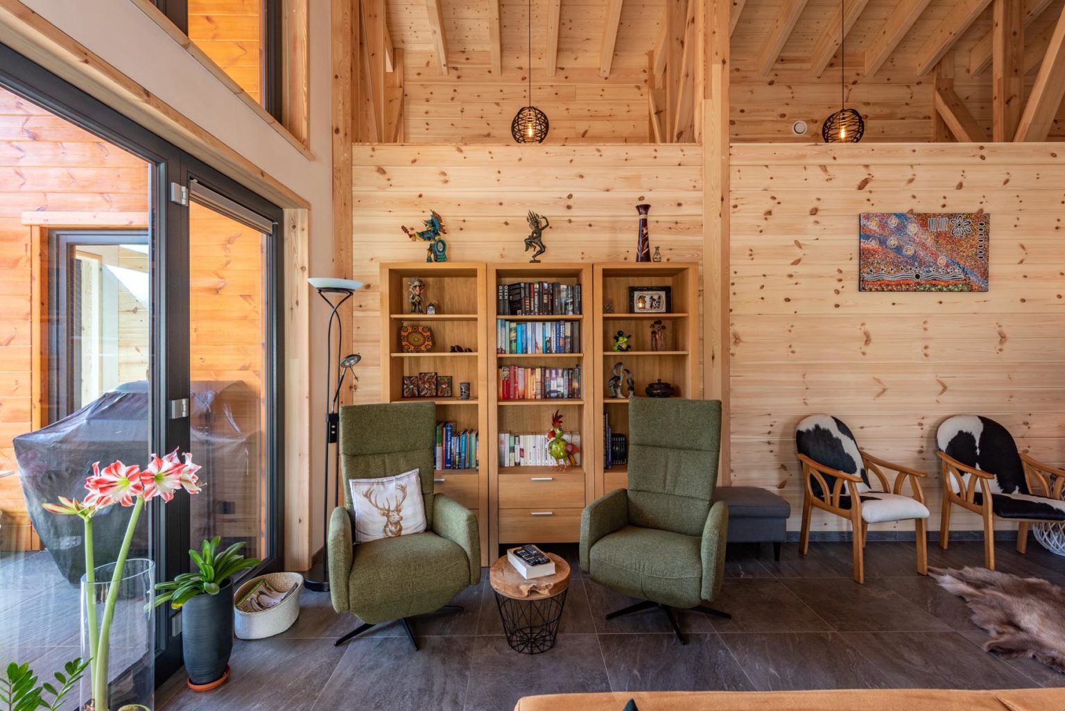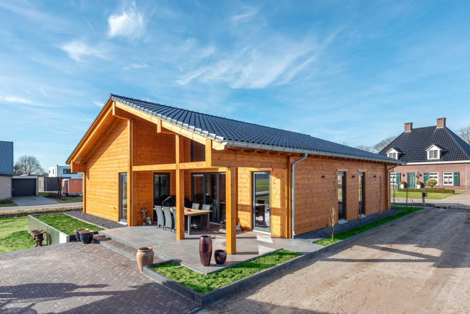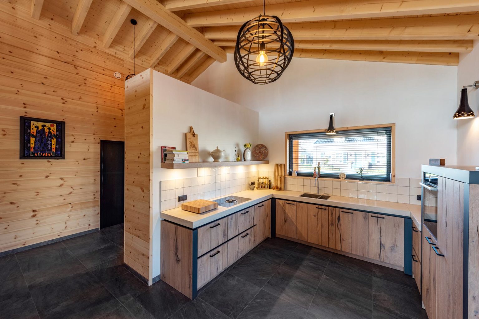 Besonders schätzt die Hausherrin, Martha Lucassen, die angenehme, warme Wohnumgebung in ihrem Holzhaus. „Auch wenn ich allein zu Hause bin, fühle ich mich nicht allein.“, sagt sie und führt das auf die Behaglichkeit zurück, die ihr Holzhaus ausstrahlt. Außerdem zaubern die Holzhäuser von Fullwood ein gesundes Raumklima, das Laib und Seele wohltut, das spüren sogar Besucher. Die nehmen auch den zarten Kiefernduft der Wände und offenen Holzbalkendecken noch bewusst war. Martha Lucassen selbst bemerkt diesen nur noch nach längerer Abwesenheit. Auch die nachhaltige und ökologische Bauweise ihres Hauses freut die Eigentümerin sowie die sehr guten Dämmeigenschaften der Wände. „Ich brauche nicht so viel Heizen, wie die offenen, sehr hohen Räume vermuten ließen. Nicht nur die Wände dämmen hervorragend, ich habe auch eine gute Dachdämmung und moderne Wärmeschutzfenster, so spare ich im Winter Heizenergie, und das tut sowohl dem Geldbeutel als auch den Atemwegen gut!“. Beheizt wird Holzhaus „Nederland“ mit einer modernen Luftwärmepumpe über die Fußbodenheizung. Diese Fußbodenheizung kann im Sommer auch als Kühlsystem verwendet werden.