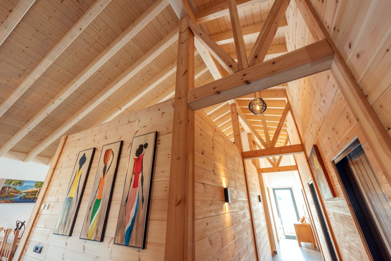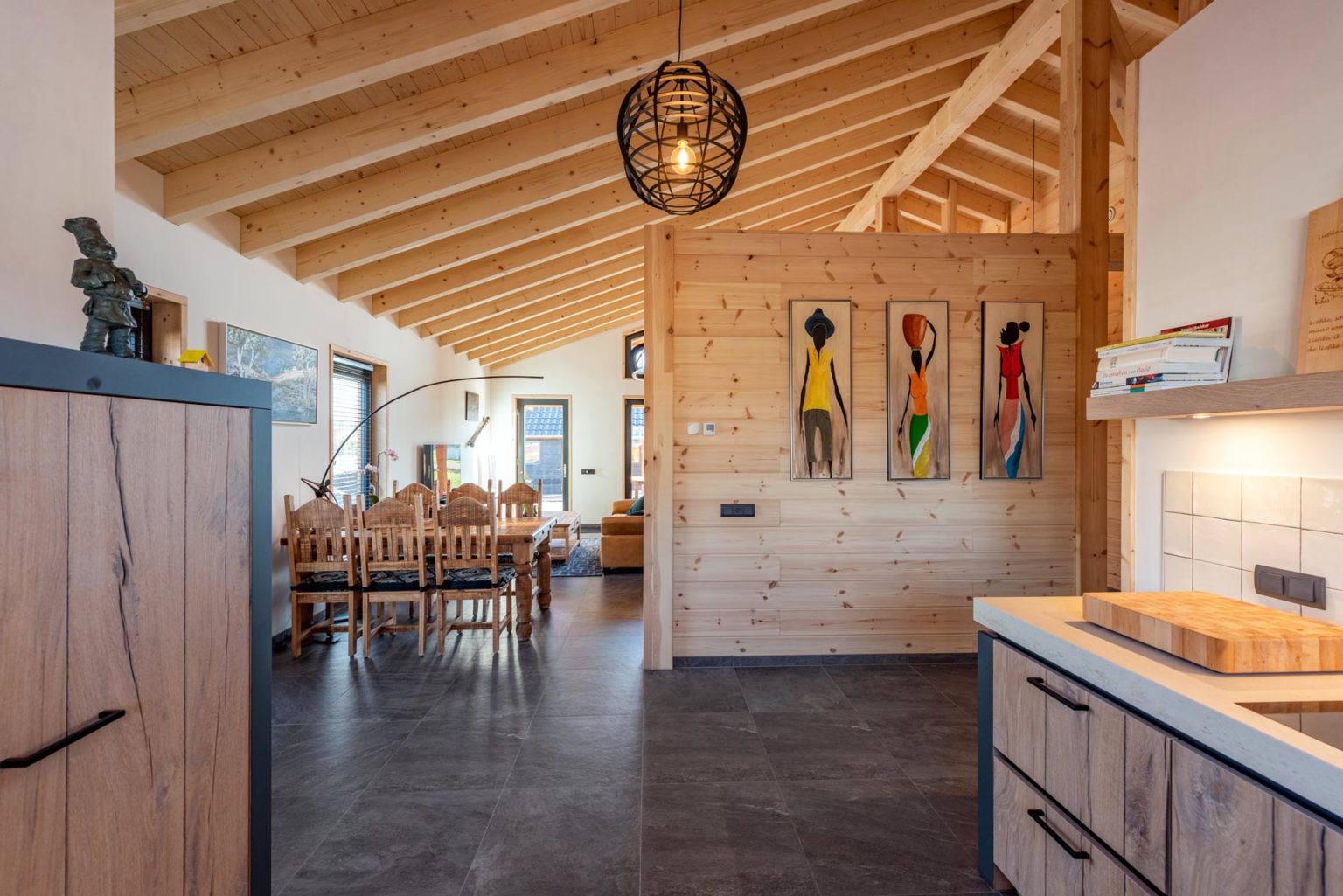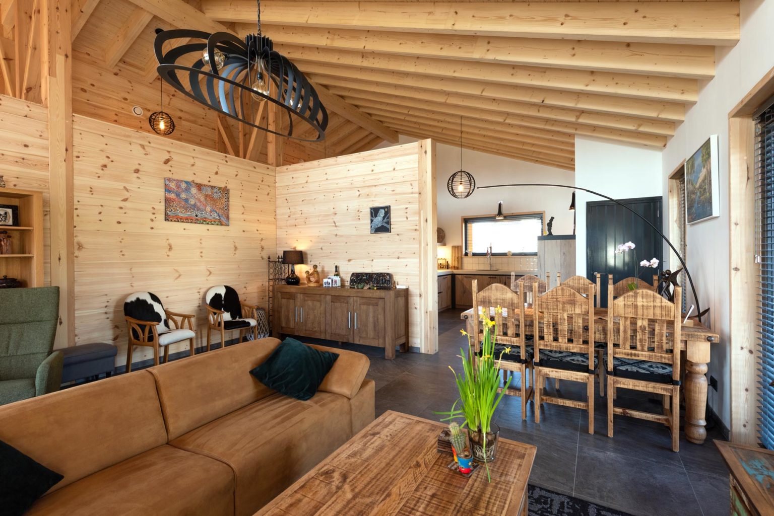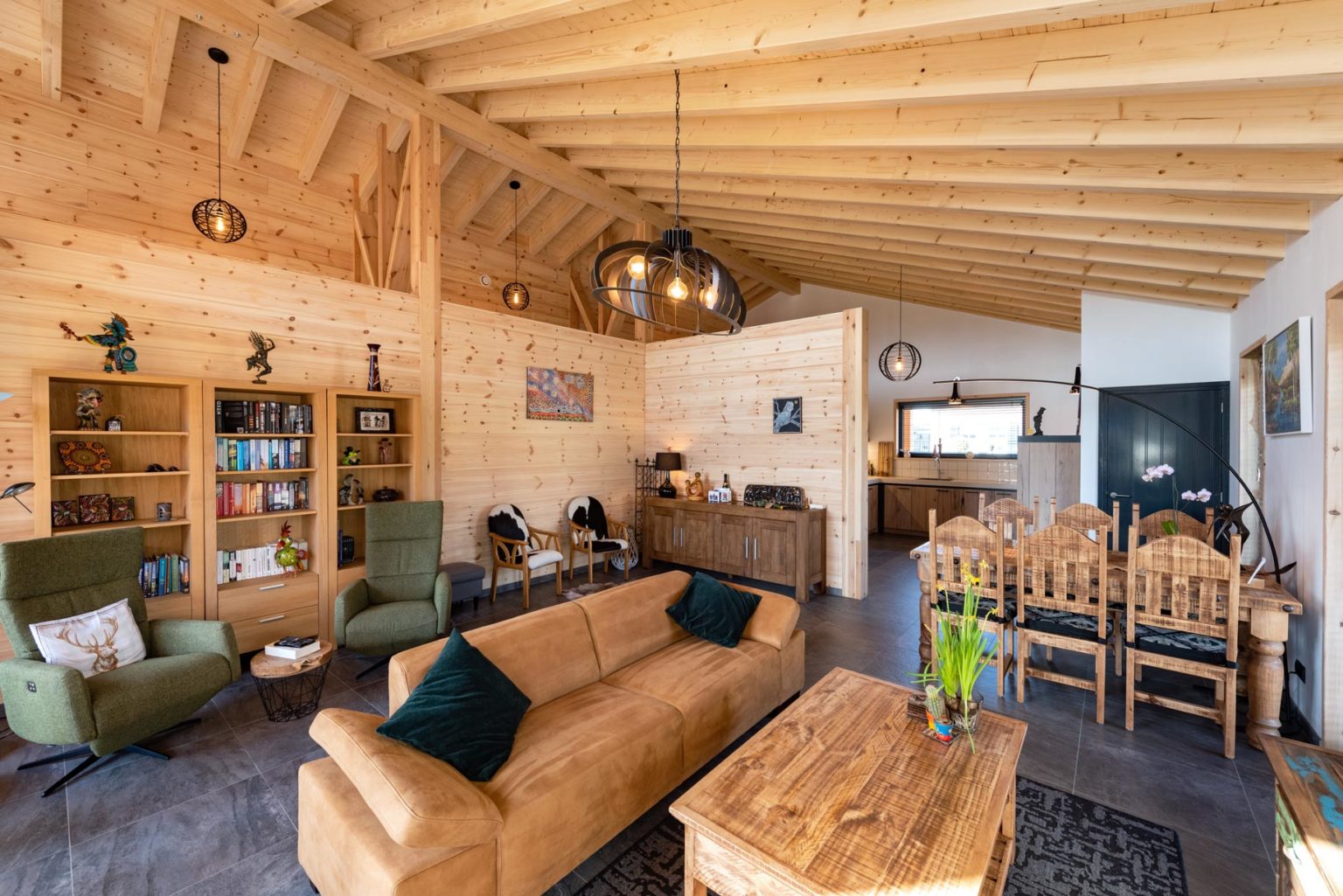Besonders schätzt die Hausherrin, Martha Lucassen, die angenehme, warme Wohnumgebung in ihrem Holzhaus. „Auch wenn ich allein zu Hause bin, fühle ich mich nicht allein.“, sagt sie und führt das auf die Behaglichkeit zurück, die ihr Holzhaus ausstrahlt. Außerdem zaubern die Holzhäuser von Fullwood ein gesundes Raumklima, das Laib und Seele wohltut, das spüren sogar Besucher. Die nehmen auch den zarten Kiefernduft der Wände und offenen Holzbalkendecken noch bewusst war. Martha Lucassen selbst bemerkt diesen nur noch nach längerer Abwesenheit. Auch die nachhaltige und ökologische Bauweise ihres Hauses freut die Eigentümerin sowie die sehr guten Dämmeigenschaften der Wände. „Ich brauche nicht so viel Heizen, wie die offenen, sehr hohen Räume vermuten ließen. Nicht nur die Wände dämmen hervorragend, ich habe auch eine gute Dachdämmung und moderne Wärmeschutzfenster, so spare ich im Winter Heizenergie, und das tut sowohl dem Geldbeutel als auch den Atemwegen gut!“. Beheizt wird Holzhaus „Nederland“ mit einer modernen Luftwärmepumpe über die Fußbodenheizung. Diese Fußbodenheizung kann im Sommer auch als Kühlsystem verwendet werden.