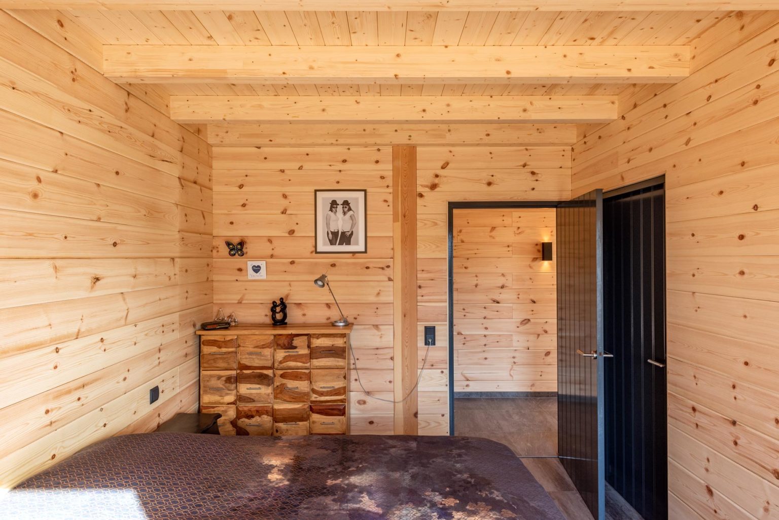 Holzhaus „Nederland“ besitzt ein barrierefreies Geschoss, dessen Grundriss einem breiten Rechteck mit Rücksprung an beiden Giebelseiten entspricht. Ein sattelförmiges Dach bedeckt den naturhellen Holzbau und zieht sich auch über den rechteckigen Rücksprung, so dass sich an dieser Stelle ein überdachter, windgeschützter Freisitz ergibt. Drinnen ist das eingeschossige Holzhaus in großen Teilen offengehalten und verfügt über eine luxuriöse Raumhöhe bis zum imposanten Sichtdachstuhl hinauf. Die Weitläufigkeit und immense Lichte schenkt ein sehr großzügiges Raumgefühl. Während Wohn-/Ess- und Kochbereich inklusive Flur offen ineinander übergehen, sind Vorrats-/Heizungsraum, Arbeitszimmer, Schlafzimmer, begehbarer Kleiderschrank, Badezimmer und Gäste-WC einzeln abgetrennt. Bis auf den begehbaren Kleiderschrank sind alle Räume von dem langgezogenen Flur aus erreichbar, der sich als trennendes Element zwischen dem offenen Wohnbereich und den geschlossenen Räumen befindet. Nur über diesen Räumen gibt es eine Decke. Die Trennwände vom Wohn-Ess-Kochbereich zum Flur ziehen sich nicht bis zum Dachstuhl hinauf, sondern enden in knapp 3 Meter Höhe. Das Schlafzimmer ist außerdem mit dem Bad verbunden, dazwischen liegt nur der begehbare Kleiderschrank.