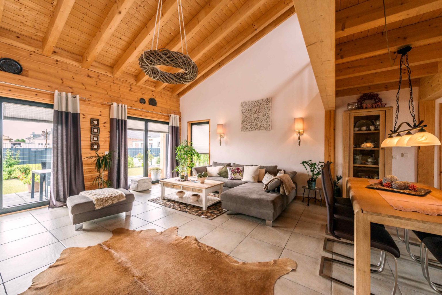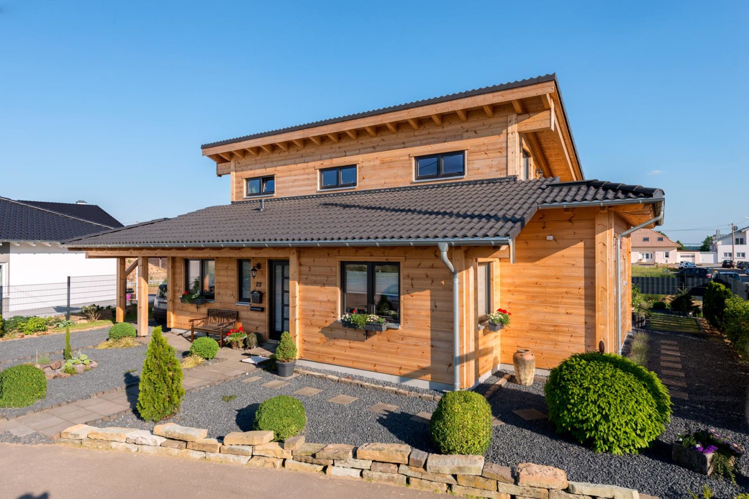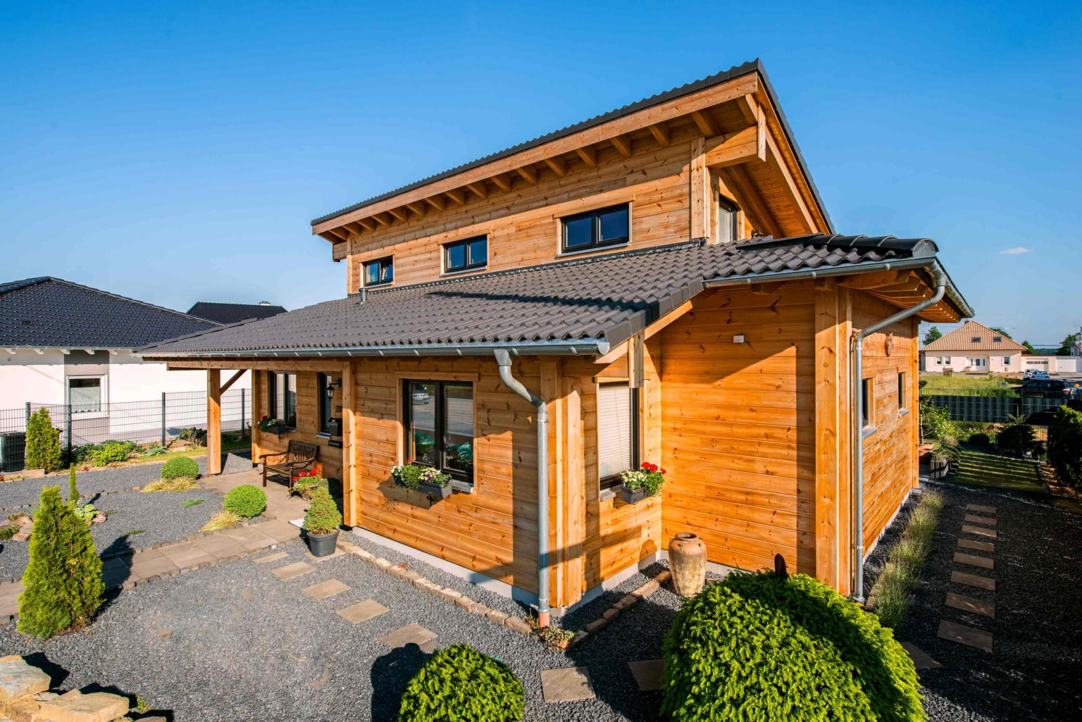 Wenn man so will, wurden Ludwig und Hildegard Krauß zu ihrem Glück gezwungen: Den Heimatort des Ehepaares gibt es nämlich heute nicht mehr, da er dem Braunkohleabbau zum Opfer fiel. Nicht aus „Protest“, sondern aus Überzeugung entschieden sich die Kraußes dann zum Bau eines umweltfreundlichen, nachhaltig gebauten, klimafreundlichen Holzhauses. „Uns hat immer schon die Gemütlichkeit angesprochen, die nur in einem Holzhaus herrscht. Außerdem hat unser Neffe schon lange ein Holzhaus, das uns auch gut gefiel.“, berichtet der Hausherr. Rustikal und ländlich wollten er und seine Frau aber nicht bauen, zumal der architektonische Tenor ihres Neubaugebietes überwiegend zeitgemäß bis modern ist.