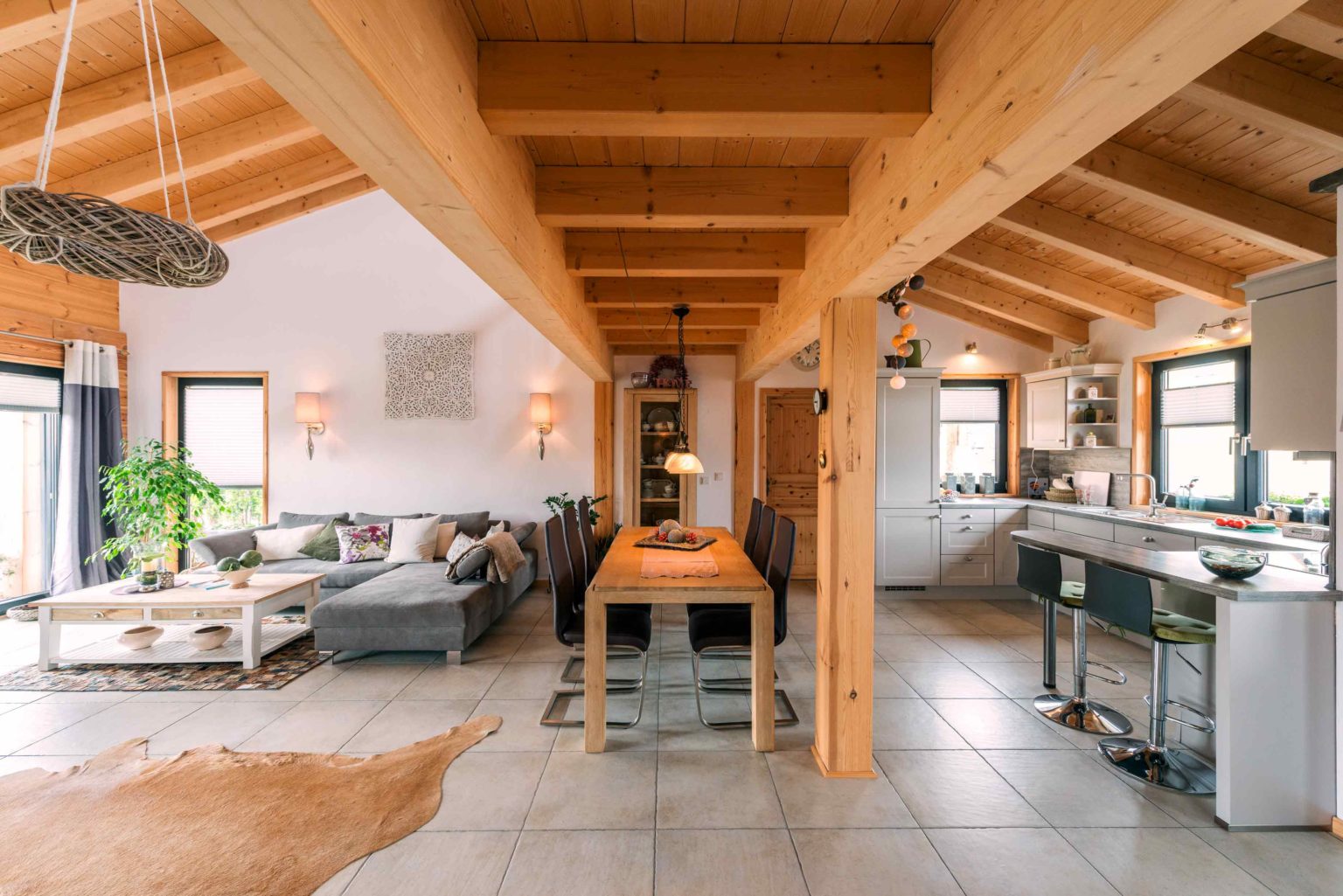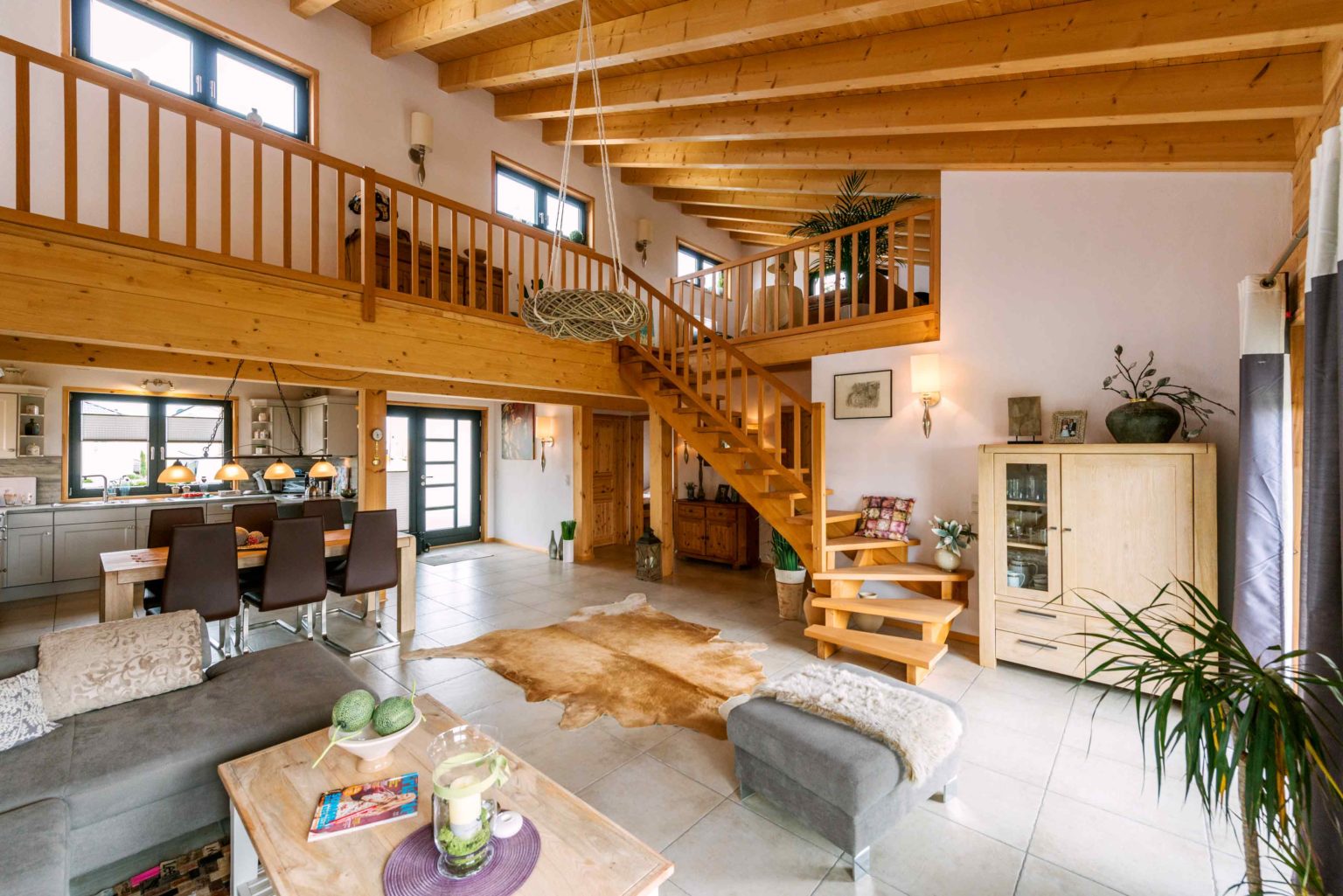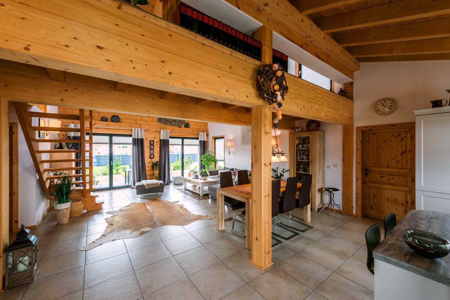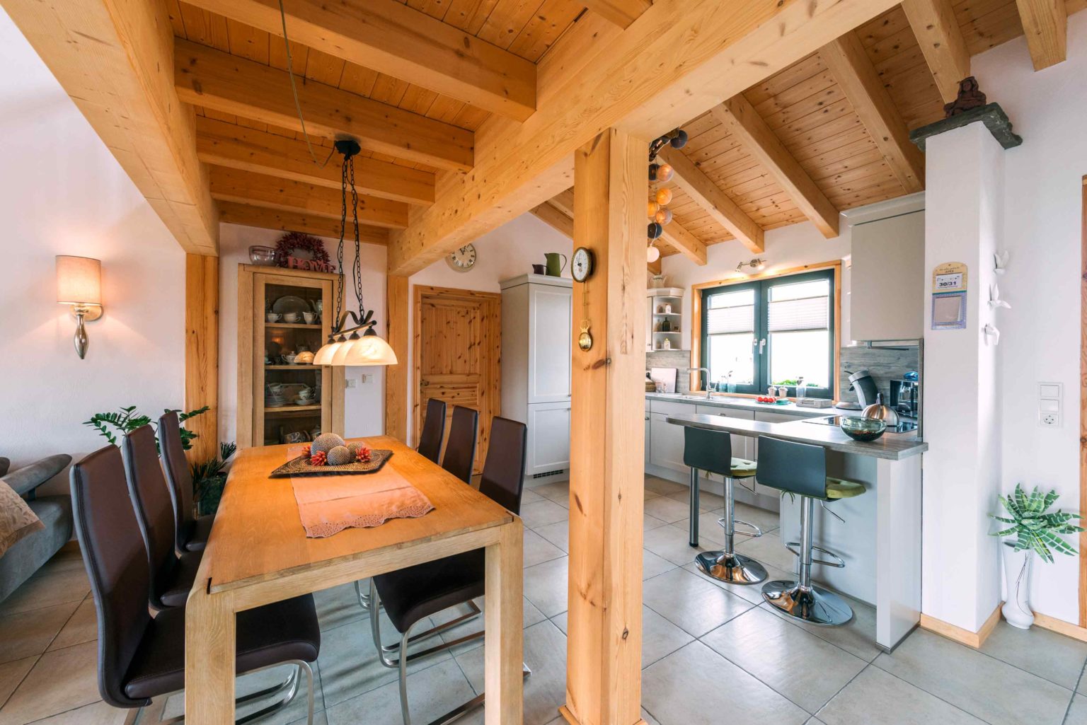 Nicht nur Wohnort und Holzhaus sind neu, auch vom ehemaligen Mobiliar hat sich das lang verheiratete Paar zum allergrößten Teil getrennt, um sich komplett neu einzurichten. „Die Möbel müssen ja auch zum Haus passen!“, mein der Hausherr. Bei der gelungenen Auswahl und Kombination der neuen Möbel stand die älteste Tochter mit ihrem guten Geschmack beratend zur Seite. Der Gesamteindruck ist auch innen hell, modern und sehr freundlich. Die Grundlage hierfür liefert der großflächige, offene Wohn-Ess-Kochbereich – in den man von außen direkt gelangt -, welcher dank der vielen, teils bodentiefen Fenster reichlich natürliches Licht erhält und sich auch vertikal offen bis zum First präsentiert. Das luftige, großzügige Wohngefühl wird von hellen Kiefernwänden (Vollholzwand), offenen Holzbalkendecken und weiß rauverputzten Ständerwänden (Kombiblockwand bzw. Leichtbau-Trennwänden) eingefasst. Während die Holzwände innen etwas nachdunkeln dürfen, sorgt außen ein optischer Vergrauungs-, Wetter- und UV-Schutzanstrich für den Erhalt der hellen Kiefernoptik. Pflegeleichte, sandfarbene Bodenfliesen bedecken die Böden einheitlich und sorgen für noch mehr uneingeschränkten Bewegungsfluss und Helligkeit im Erdgeschoss. Dazu strahlt die massive Buchenholztreppe und ihr Geländer, das sich auch entlang der Galerie im Dachgeschoss fortsetzt, Wärme und Sinnlichkeit aus. Auch die Zimmertüren sind aus hellem Holz (Kiefer).