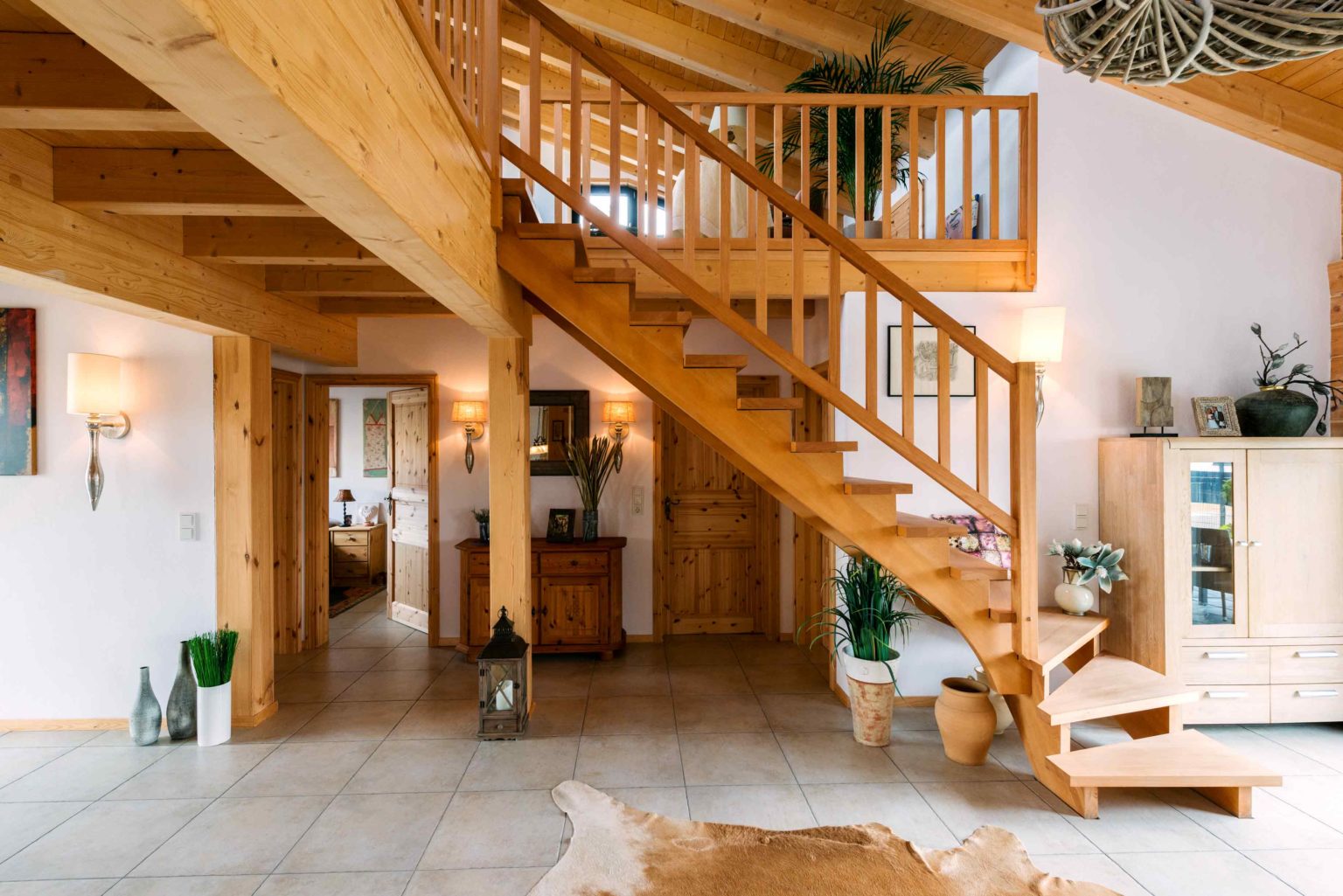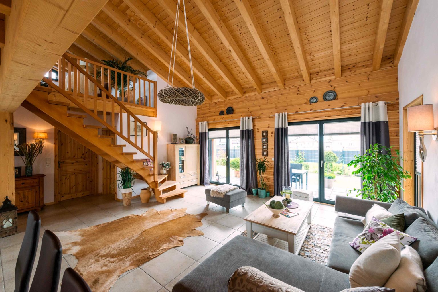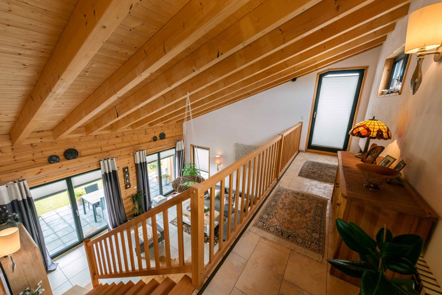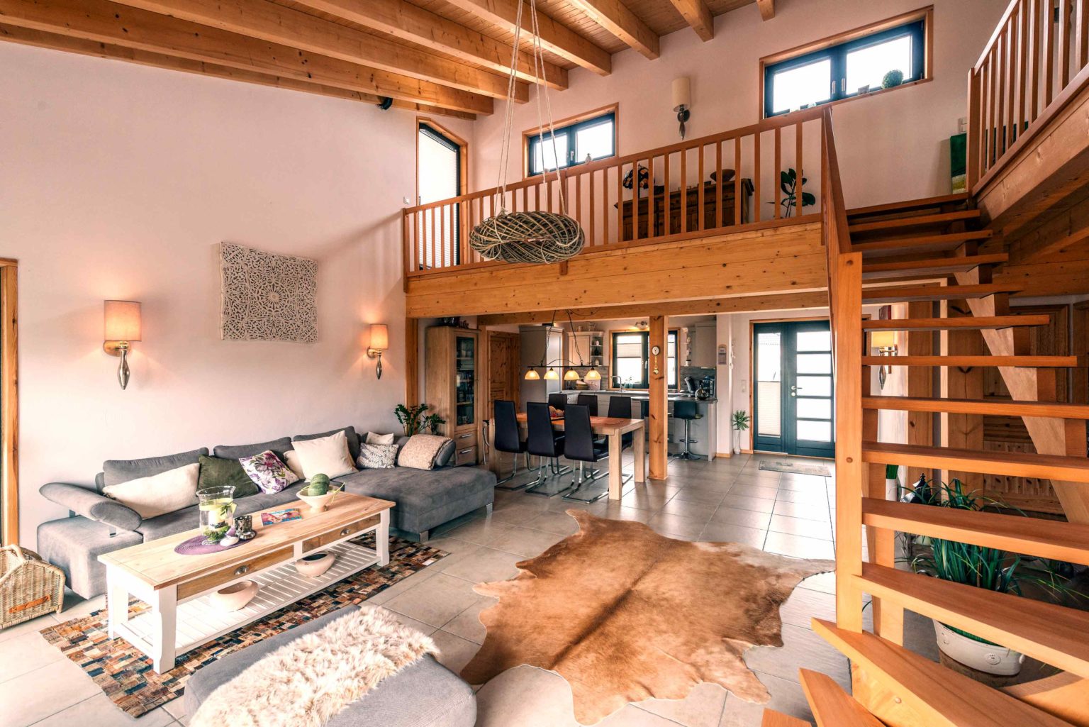 Nicht nur Wohnort und Holzhaus sind neu, auch vom ehemaligen Mobiliar hat sich das lang verheiratete Paar zum allergrößten Teil getrennt, um sich komplett neu einzurichten. „Die Möbel müssen ja auch zum Haus passen!“, mein der Hausherr. Bei der gelungenen Auswahl und Kombination der neuen Möbel stand die älteste Tochter mit ihrem guten Geschmack beratend zur Seite. Der Gesamteindruck ist auch innen hell, modern und sehr freundlich. Die Grundlage hierfür liefert der großflächige, offene Wohn-Ess-Kochbereich – in den man von außen direkt gelangt -, welcher dank der vielen, teils bodentiefen Fenster reichlich natürliches Licht erhält und sich auch vertikal offen bis zum First präsentiert. Das luftige, großzügige Wohngefühl wird von hellen Kiefernwänden (Vollholzwand), offenen Holzbalkendecken und weiß rauverputzten Ständerwänden (Kombiblockwand bzw. Leichtbau-Trennwänden) eingefasst. Während die Holzwände innen etwas nachdunkeln dürfen, sorgt außen ein optischer Vergrauungs-, Wetter- und UV-Schutzanstrich für den Erhalt der hellen Kiefernoptik. Pflegeleichte, sandfarbene Bodenfliesen bedecken die Böden einheitlich und sorgen für noch mehr uneingeschränkten Bewegungsfluss und Helligkeit im Erdgeschoss. Dazu strahlt die massive Buchenholztreppe und ihr Geländer, das sich auch entlang der Galerie im Dachgeschoss fortsetzt, Wärme und Sinnlichkeit aus. Auch die Zimmertüren sind aus hellem Holz (Kiefer).