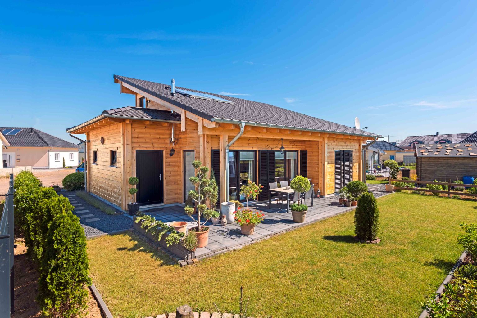 Zwischen all den Stein-, Beton- und Leichtbauhäusern in dem neu erschlossenen Baugebiet sticht Holzhaus „Neffelbach“ dank seines sinnlichen Baumaterials hervor. Andererseits fügt es sich gut zwischen die anderen Neubauten ein, da seine Massivholzwände hell und glatt sind und seine Optik insgesamt klar, schnörkellos und modern ist. „Um den zeitgemäßen Charakter zu unterstreichen, wählten wir zu den anthrazitfarbenen Ziegeln der Pultdächer schwarze Fenster und Türen. Das passt wunderbar zu den hellen Kiefernwänden und betont diese noch.“, beschreibt Hildegard Krauß den hell-dunkel Effekt ihres Hauses. „Außerdem wollten wir ein südliches Urlaubsflair kreieren, wozu bodentiefe Fenster und Fensterläden (ebenfalls in schwarz) hervorragend passen.“, fährt sie fort. Da das Holzhaus nach Süden ausgerichtet ist, machen die Fensterläden besonders an der Gartenseite als Sonnenschutz Sinn. „Bei hohen Außentemperaturen bleibt es im Hausinnern angenehm kühl, trotz der großen nach Süden ausgerichteten Fenster. Im Winter wiederum profitieren wir von der tiefer stehenden Sonne.“, berichtet Ludwig Krauß, der – dank gutem räumlichen Vorstellungsvermögen – sein Heim größtenteils selbst entworfen hat. Über die Erfahrung, Tipps und Hilfestellungen von Fullwood Wohnblockhaus freute er sich dennoch und nahm den kostenlosen, individuellen Planungsservice gerne in Anspruch.