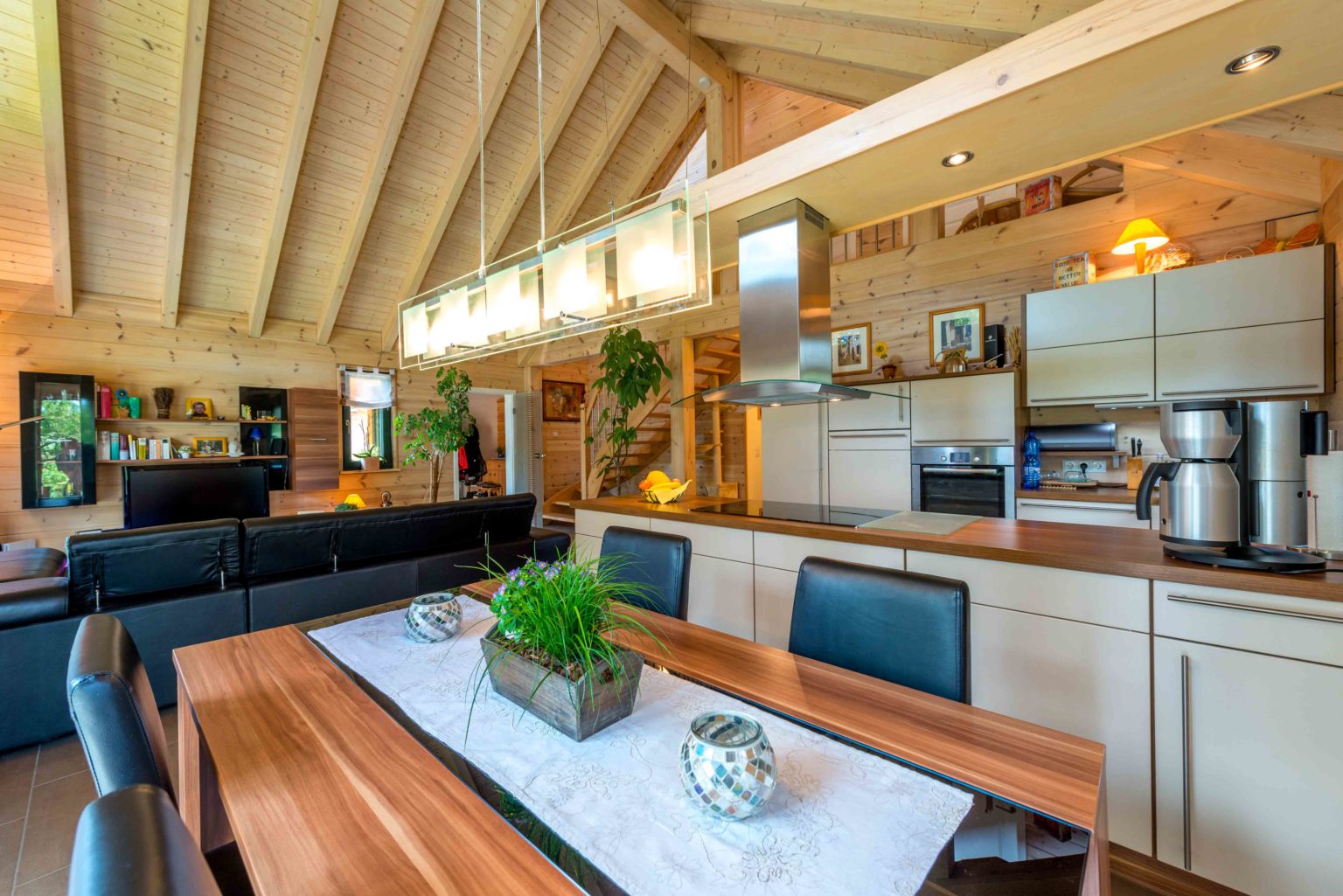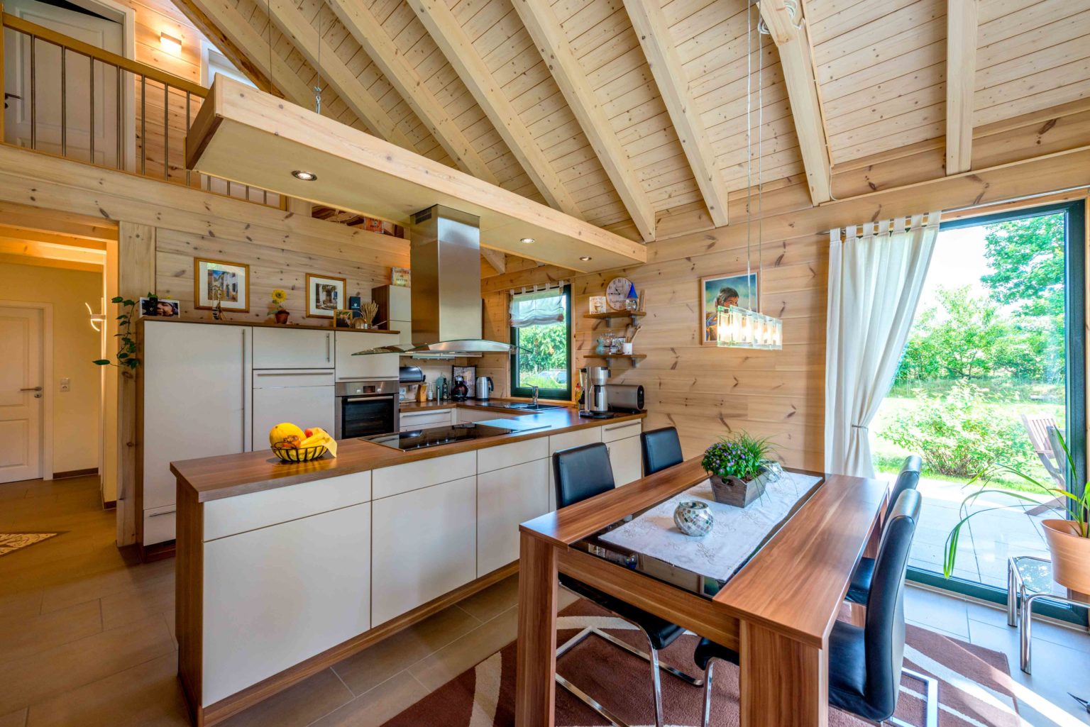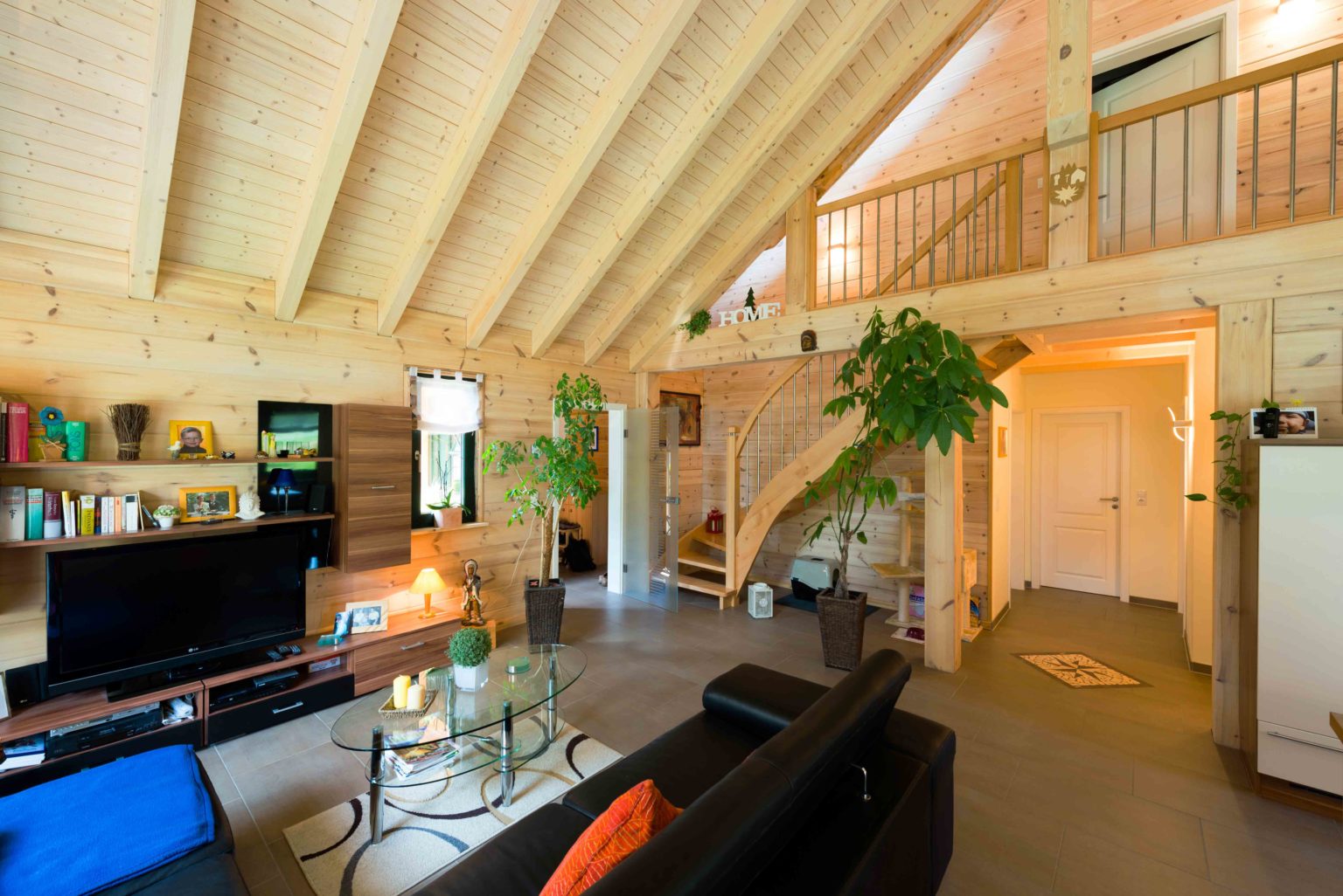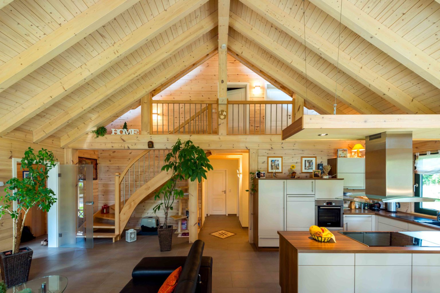 Holzhaus „Niedersachsen“ scheint aus zwei aneinander gefügten Teilen zu bestehen, von denen der vordere (Ostgiebel) etwas niedriger ist als der hintere (Westgiebel). Man betritt das Gebäude an der Südseite, gelangt in einen Windfang, von dem aus es auch in einen Hauswirtschaftsraum geht, und von dort in den offenen Wohnbereich, der sich im vorderen Hausteil befindet. Dieser großzügige öffentliche Bereich verfügt über einen gut fünfeinhalb Meter hohen Luftraum und garantiert durch den fließenden Übergang von Wohnzimmer, Esszimmer und Küche ungehindertes kommunizieren und viel familiäres Miteinander. Draußen verläuft entlang der gesamten Giebelseite eine überdachte Terrasse, die viel genutzt wird. „Wir sind froh, dass wir bei jedem Wetter draußen sitzen können. Hierzulande regnet es ja oft, auch wenn`s warm ist.“, freut sich die Hausherrin. Vom Wohnbereich gelangt man in den hinteren Teil des Hauses mit normal hoher, offener Holzbalkendecke, wo ein Flur zu den Privaträumen führt, also zum Schlafzimmer, einem Arbeitszimmer und ins Bad. Direkt hinter der Küche befindet sich außerdem noch ein Gäste-WC, so dass Gäste nicht in den privaten Bereich gehen müssen. An der Rückwand des Wohnbereichs, also der dem Ostgiebel gegenüber liegenden Wand, schwingt sich eine Holztreppe hinauf zum Dachgeschoss. Dort gelangt man auf eine zum Wohnbereich hin offene Galerie, die zum Kinderzimmer und einem zweiten Arbeitszimmer führt. Die Privaträume befinden sich somit alle im hinteren, höheren Hausteil (Westgiebel). „Der Wohnbereich wirkt wie ein Haus im Haus. Das gefällt uns ganz besonders. Übrigens haben wir hier trotz offener Küche nie unangenehme Küchengerüche. Das Holz nimmt offensichtlich nicht nur feuchte Dämpfe auf, sondern gleicht auch Gerüche aus. Zu unserer großen Freude nehmen wir hier hauptsächlich den feinen Kiefernduft der Wände war.“, schwärmt der Hausherr.