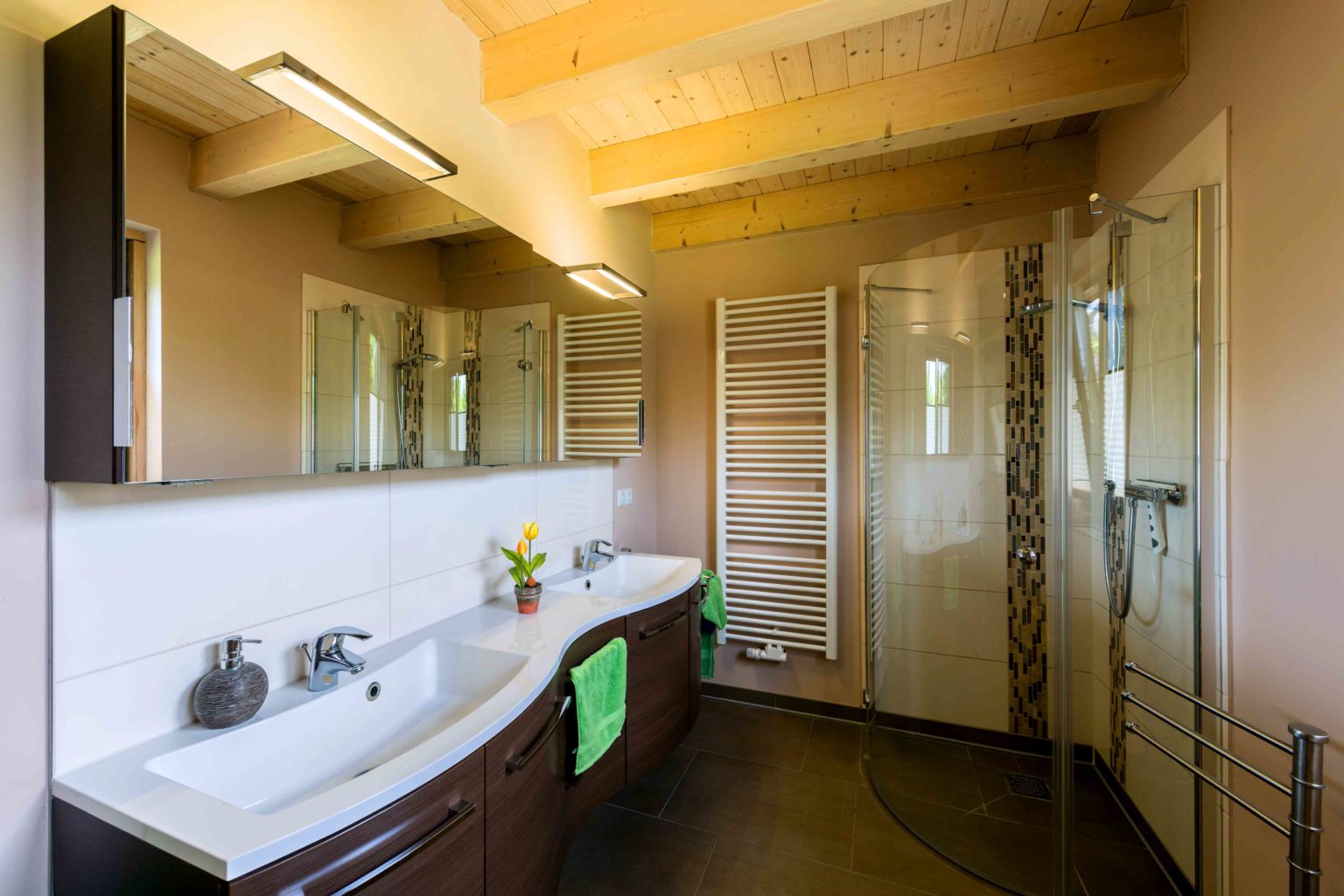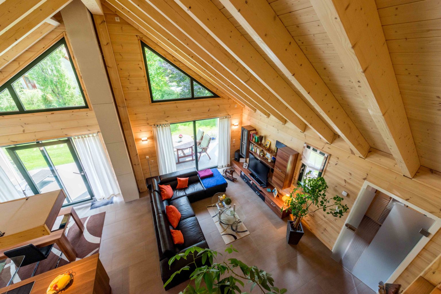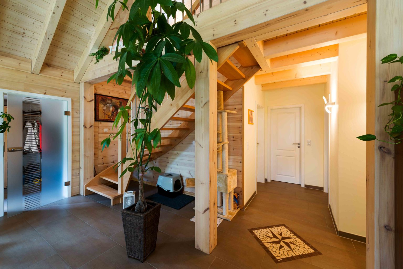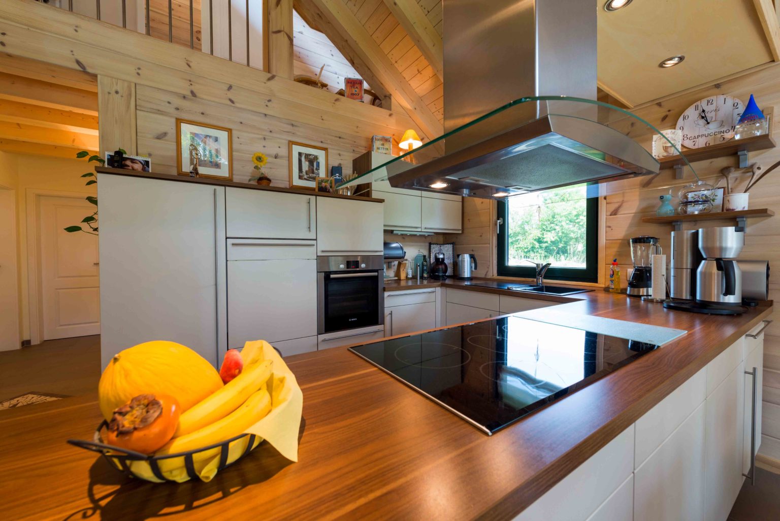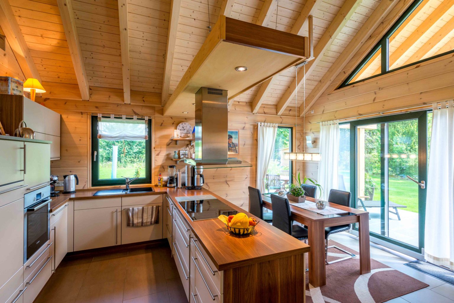 Holzhaus „Niedersachsen“ scheint aus zwei aneinander gefügten Teilen zu bestehen, von denen der vordere (Ostgiebel) etwas niedriger ist als der hintere (Westgiebel). Man betritt das Gebäude an der Südseite, gelangt in einen Windfang, von dem aus es auch in einen Hauswirtschaftsraum geht, und von dort in den offenen Wohnbereich, der sich im vorderen Hausteil befindet. Dieser großzügige öffentliche Bereich verfügt über einen gut fünfeinhalb Meter hohen Luftraum und garantiert durch den fließenden Übergang von Wohnzimmer, Esszimmer und Küche ungehindertes kommunizieren und viel familiäres Miteinander. Draußen verläuft entlang der gesamten Giebelseite eine überdachte Terrasse, die viel genutzt wird. „Wir sind froh, dass wir bei jedem Wetter draußen sitzen können. Hierzulande regnet es ja oft, auch wenn`s warm ist.“, freut sich die Hausherrin. Vom Wohnbereich gelangt man in den hinteren Teil des Hauses mit normal hoher, offener Holzbalkendecke, wo ein Flur zu den Privaträumen führt, also zum Schlafzimmer, einem Arbeitszimmer und ins Bad. Direkt hinter der Küche befindet sich außerdem noch ein Gäste-WC, so dass Gäste nicht in den privaten Bereich gehen müssen. An der Rückwand des Wohnbereichs, also der dem Ostgiebel gegenüber liegenden Wand, schwingt sich eine Holztreppe hinauf zum Dachgeschoss. Dort gelangt man auf eine zum Wohnbereich hin offene Galerie, die zum Kinderzimmer und einem zweiten Arbeitszimmer führt. Die Privaträume befinden sich somit alle im hinteren, höheren Hausteil (Westgiebel). „Der Wohnbereich wirkt wie ein Haus im Haus. Das gefällt uns ganz besonders. Übrigens haben wir hier trotz offener Küche nie unangenehme Küchengerüche. Das Holz nimmt offensichtlich nicht nur feuchte Dämpfe auf, sondern gleicht auch Gerüche aus. Zu unserer großen Freude nehmen wir hier hauptsächlich den feinen Kiefernduft der Wände war.“, schwärmt der Hausherr.