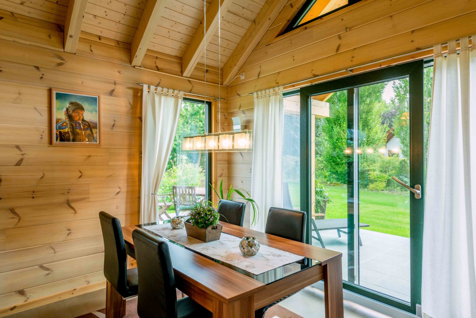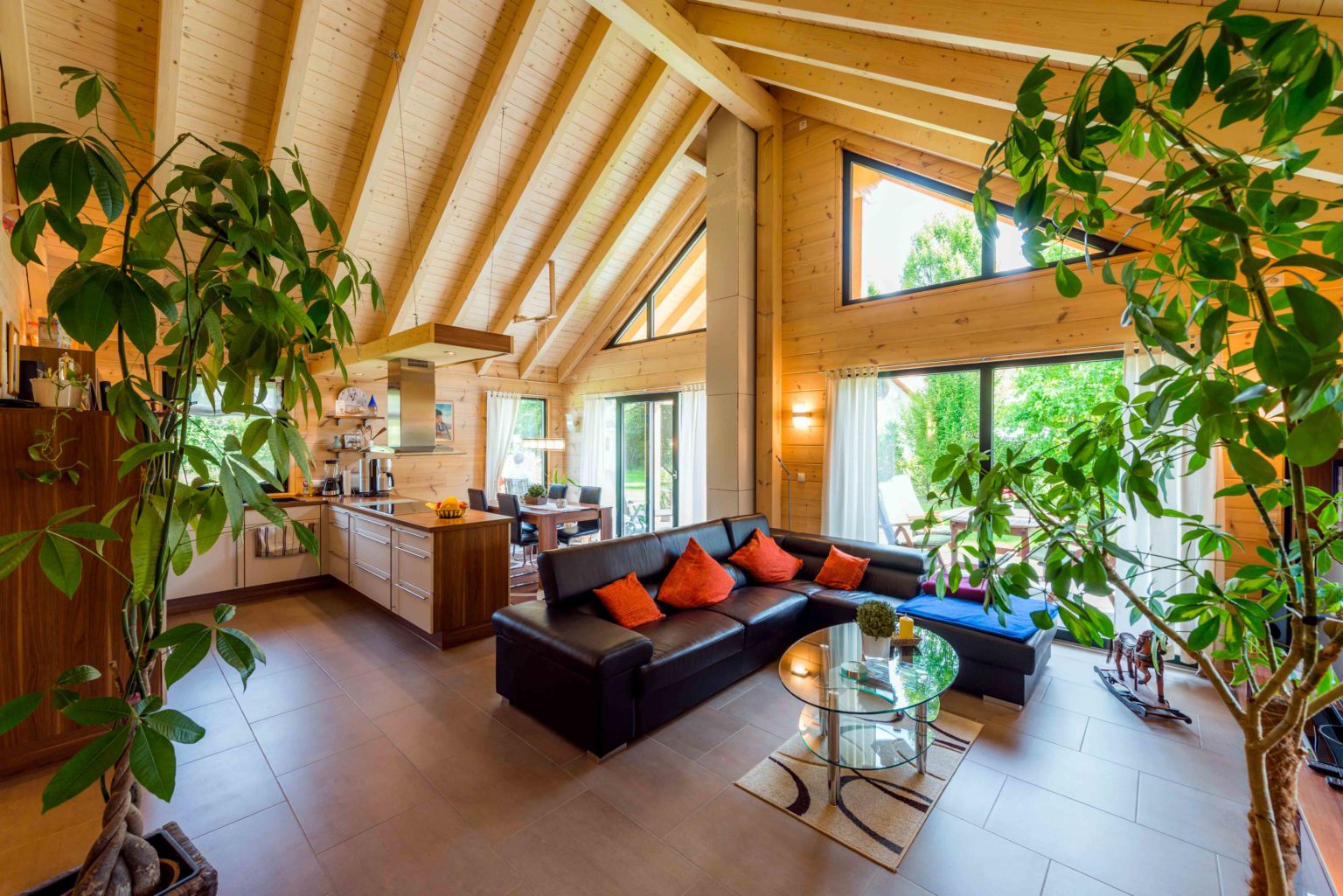 Mit Weitblick aufs Alter plante das junge Ehepaar sein Holzhaus im Erdgeschoss komplett barrierefrei und legte lediglich das Kinderzimmer von Sohn Marlon und ein Arbeitszimmer ins Dachgeschoss. „Wir wussten bei der Planung ganz genau, was ein Haus haben muss, damit wir uns darin wohl fühlen. Meinem Mann war ein sichtbarer Dachstuhl mit hohem Luftraum und viel Platz nach oben wichtig. Wenn schon Holz, dann soll man auch viel davon sehen. Ich legte viel Wert auf ungehinderte Kommunikation und große Flächen im Wohnbereich. Und natürlich wollten wir es beide möglichst hell drinnen haben.“, beschreibt Britta Jürgens die Prioritäten. Durch den hohen Luftraum über dem großflächigen, offenen Wohn-Ess-Koch-Bereich wirkt alles besonders großzügig und luftig, während die bodentiefen Fenstertüren reichlich Tageslicht hereinlassen. Das naturhelle Kiefernholz behandelten die Hauseigentümer mit UV-Schutz gegen unerwünschtes Nachdunkeln. Die Trennwände (Ständerbau) wurden dort, wo sie nicht mit Kiefernholz beplankt sind, hell verputzt (in Weiß sowie Zartgrün und „Latte Macchiato“) und die erdfarbenen Bodenfliesen in mittlerer Helligkeit gewählt. Als Kontrast zum hellen Holz – außen wurde es im Farbton „Kiefer“ geölt, um optische Vergrauung zu verhindern – wählten die Jürgens tannengrüne Fensterrahmen, die perfekt zum Tonziegeldach in anthrazit passen.
