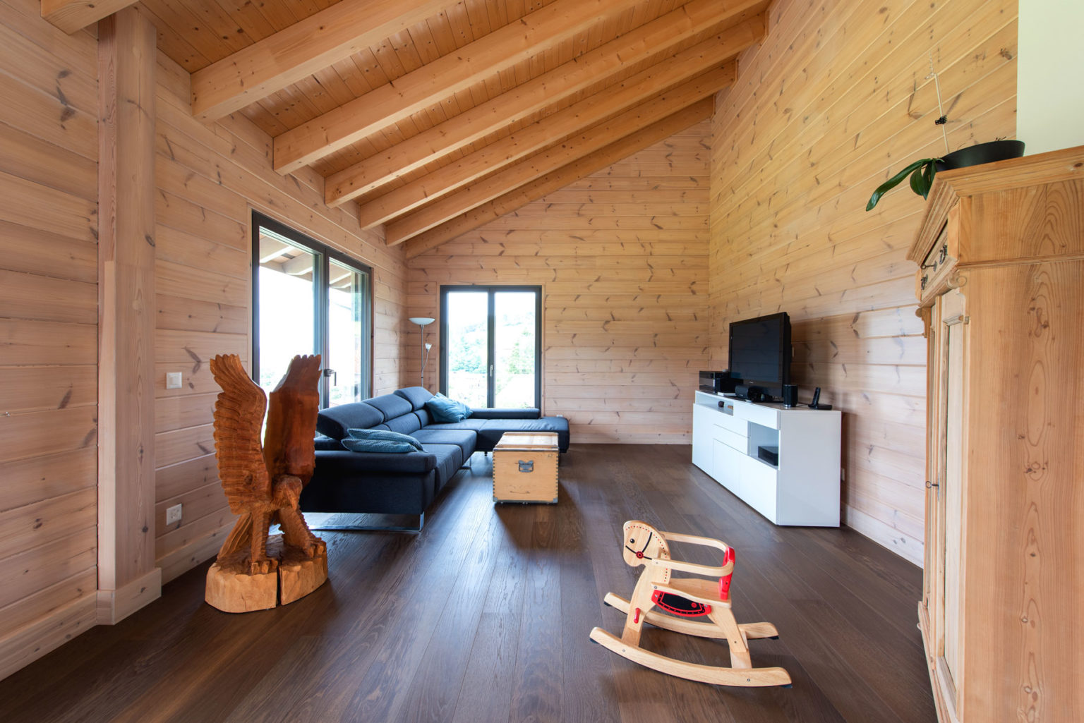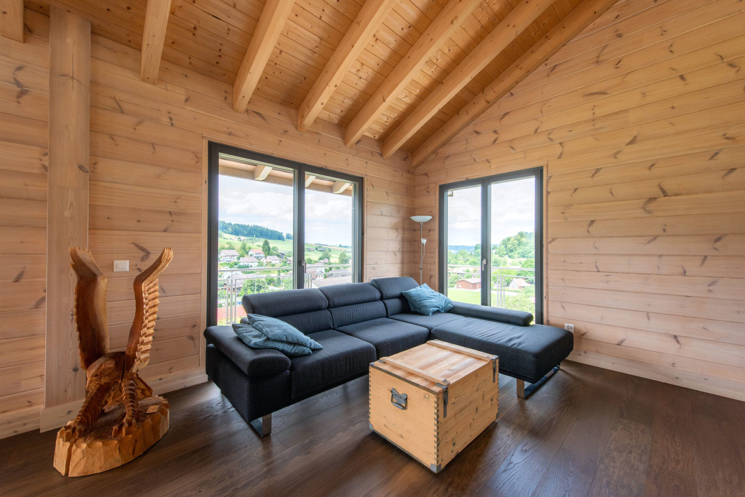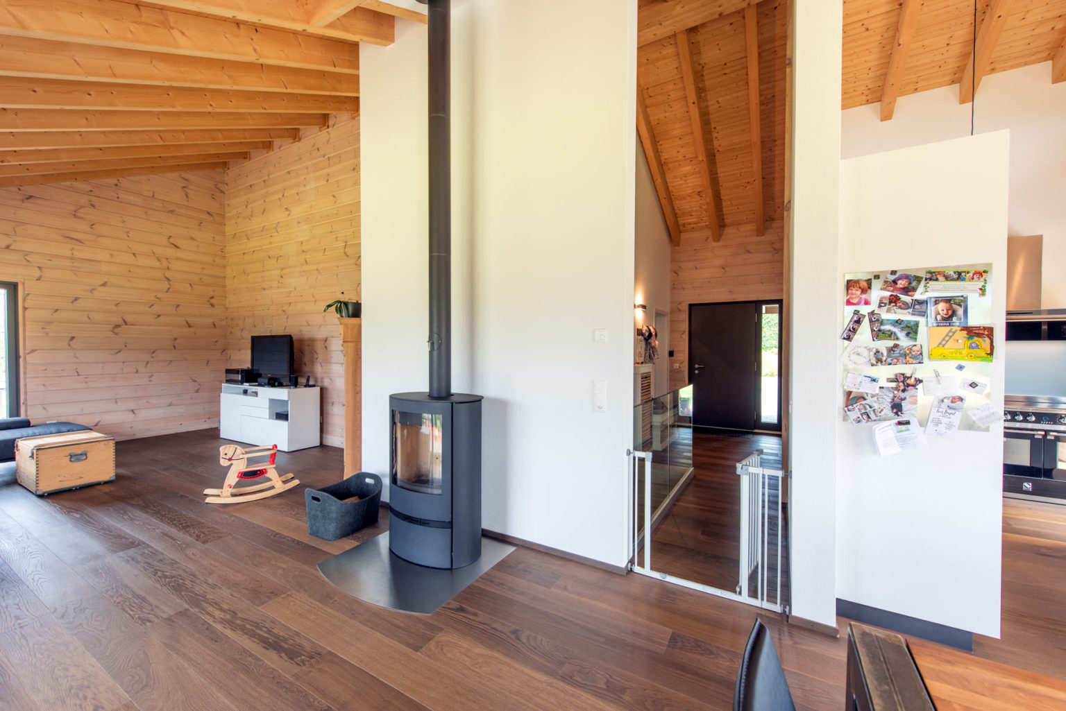Dass Massivholz und einschalige (ungedämmte) Blockwände kein Widerspruch zu hellem und offenem Wohnen sind, beweist Holzhaus „Oberaargau“. Seine Eigentümer haben es zusammen mit Fullwood individuell nach den eigenen Vorstellungen und Wohnbedürfnissen geplant und in kurzer Zeit errichten lassen. Keine sechs Monate nach Hauslieferung konnte die junge Familie bereits in ihr fertiges Eigenheim einziehen und fühlt sich seitdem sehr wohl in dem modernen und gemütlichen Holzhaus.