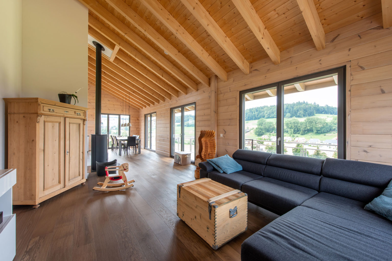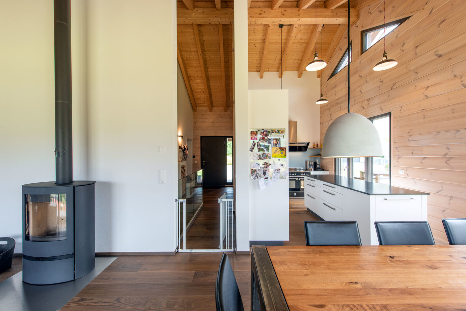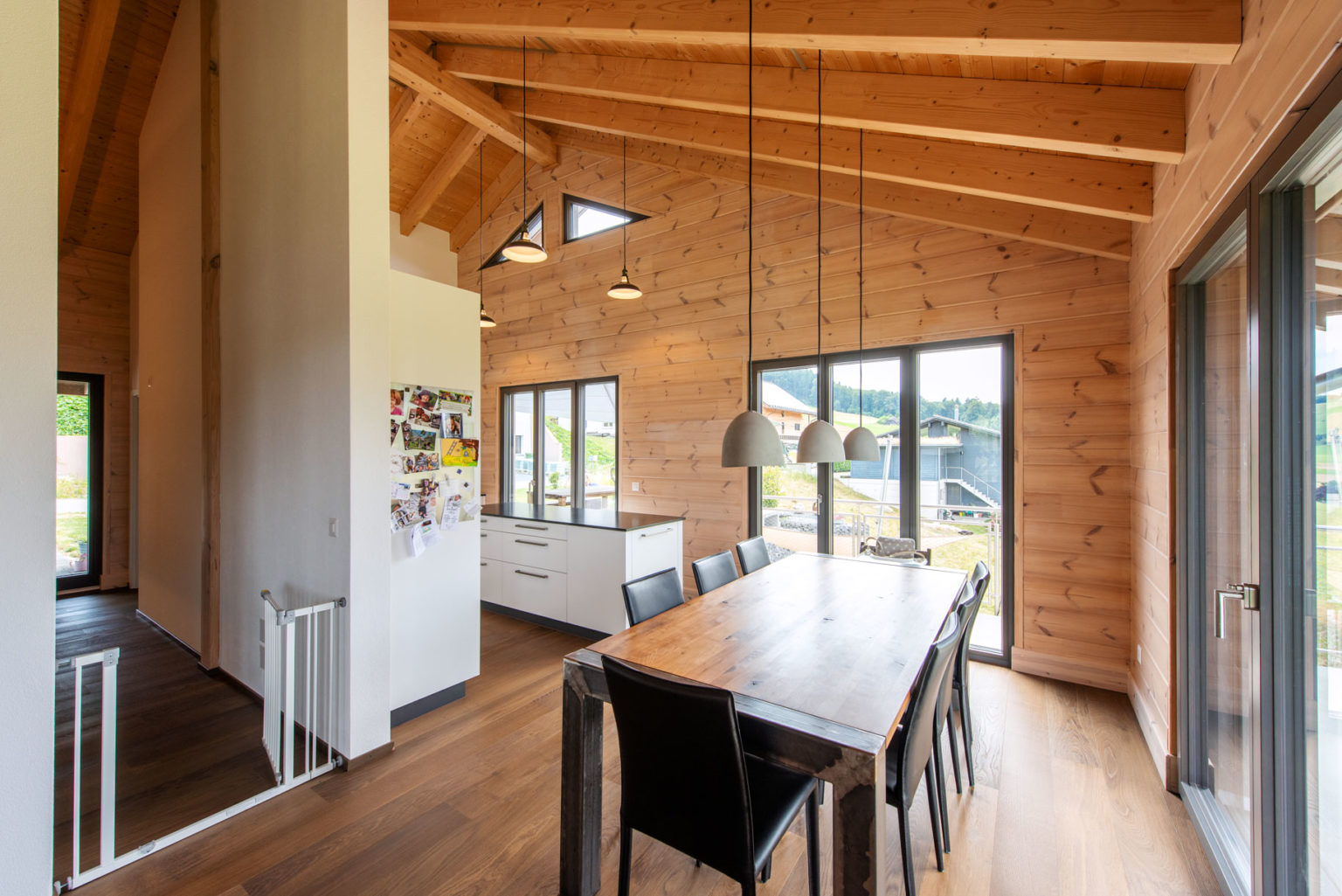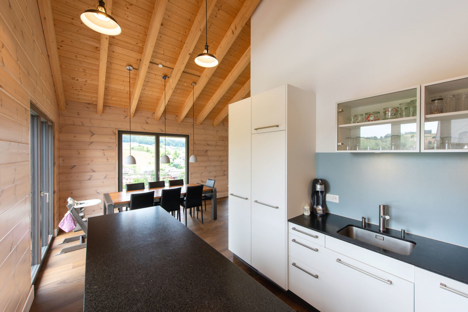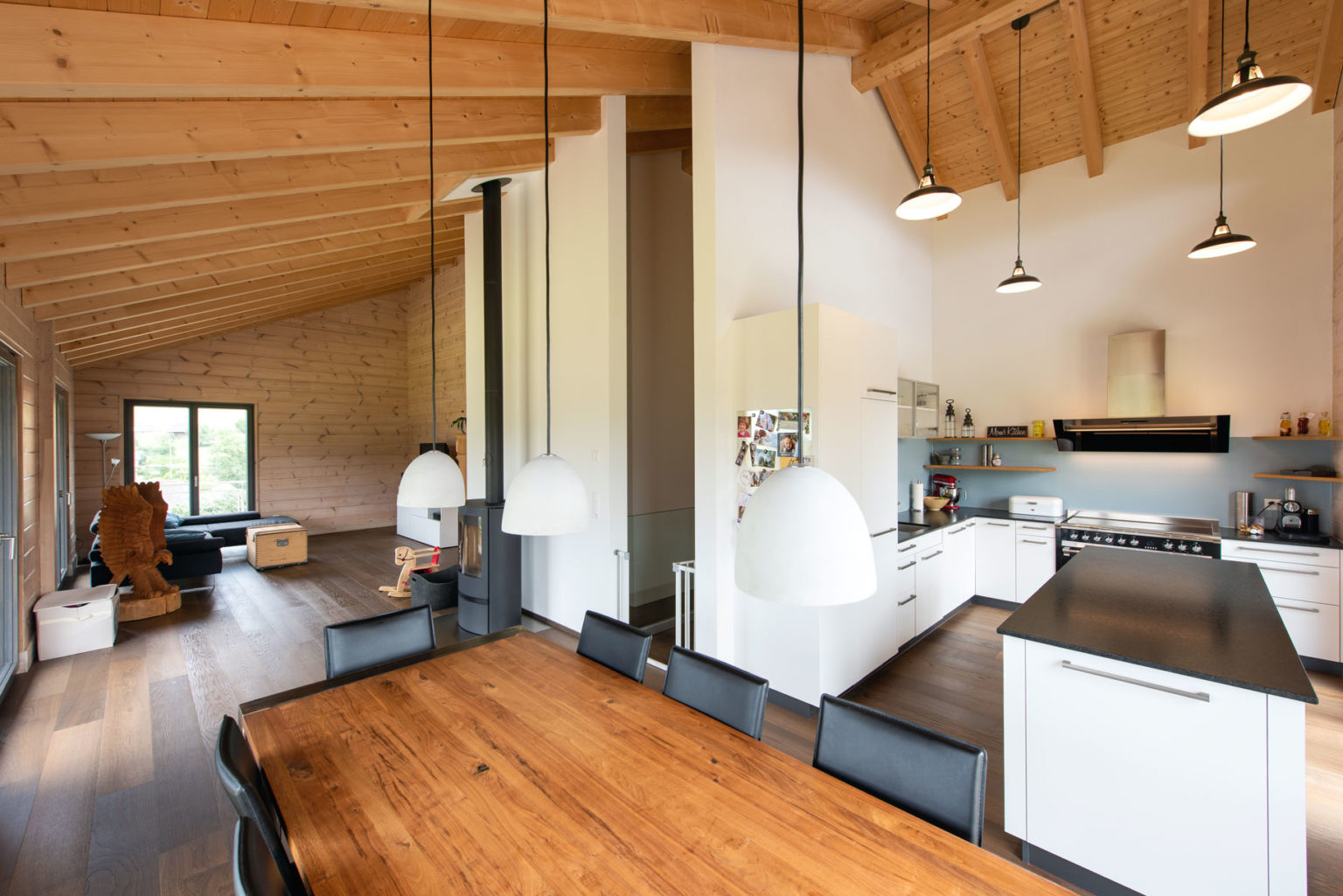 Da das Erdgeschoss des Holzhauses teils in den Hang gebaut wurde, bestehen nicht alle Außenwände aus Holz: Die ans Erdreich des Hanges grenzenden sind aus Beton, genau wie die glasierten Zimmerdecken zwischen Erdgeschoss und Obergeschoss. Oben gibt es dafür einen imposanten Sichtdachstuhl in etwa 5 Metern Raumhöhe. Ergänzt wird das Ganze mit zahlreichen großflächigen, zum Tal bodentiefen Fenstern, die reichlich natürlichen Lichteinfall gewährleisten. Um die klassische und geradlinige Architektur des Gebäudes zu betonen und dem einfallenden Tageslicht viel Fläche zur Reflektion zu bieten, wählten die Hauseigentümer drinnen leichte Ständerwände zur Raumtrennung, die sie weiß verputzen ließen. So kreierten sie ein besonders luftiges und helles Raumgefühl, das von der gemütlichen und wohngesunden Eigenschaft des Naturholzes profitiert. Außerdem entschied man sich ganz zeitgemäß für einen weitläufigen Wohn-/Ess-/Kochbereich im Obergeschoss, dessen L-Form die Küche optisch vom Wohnzimmer separiert.