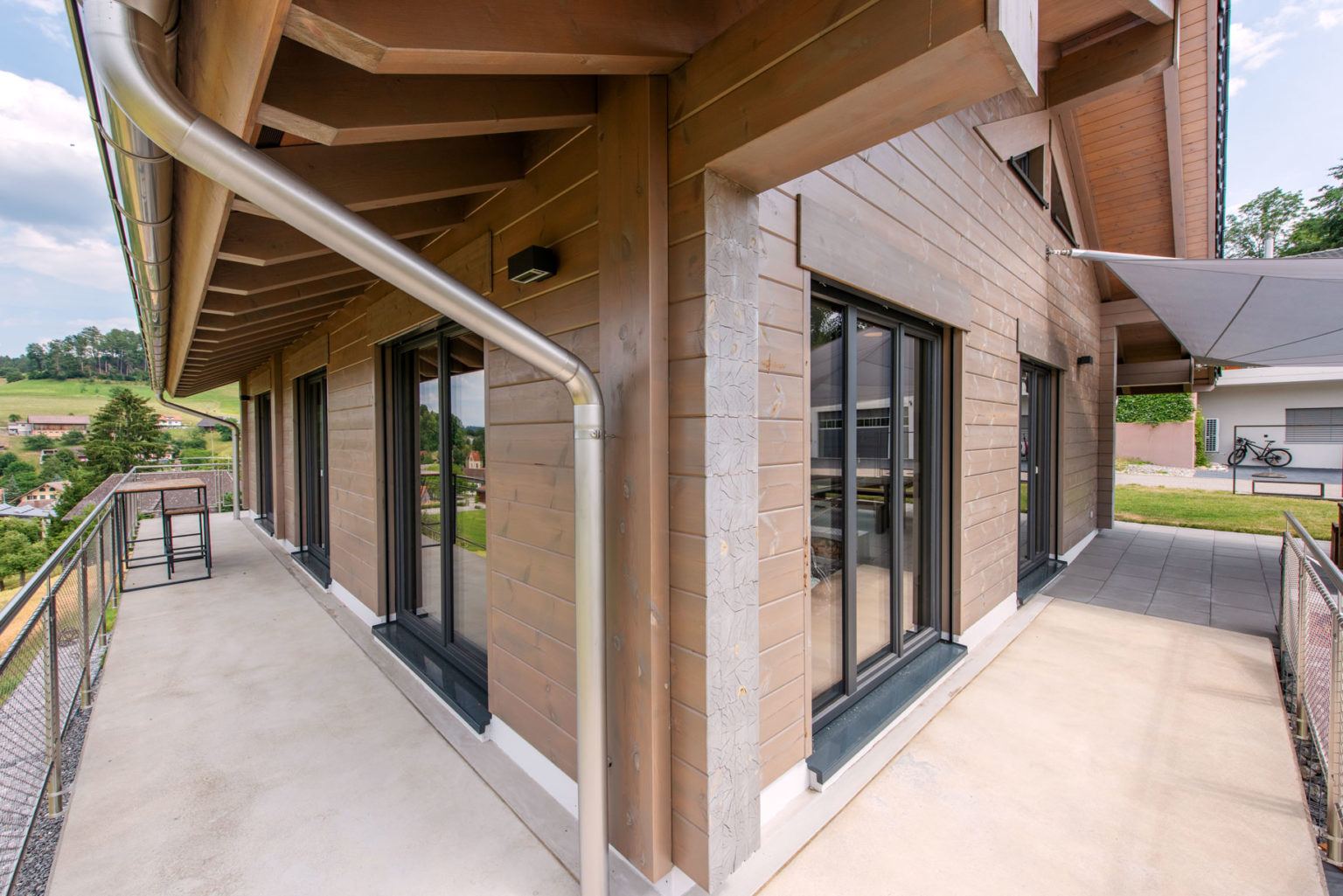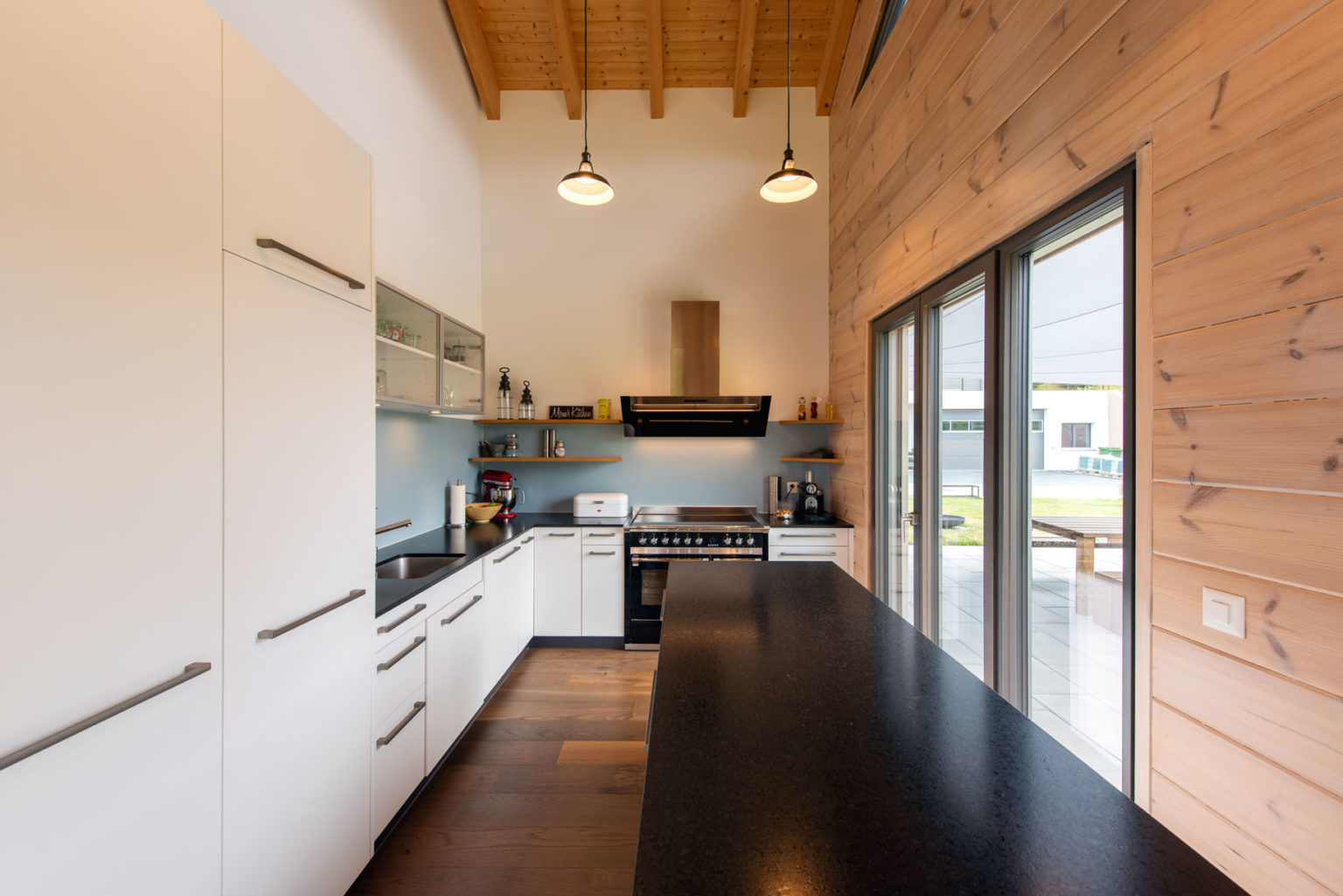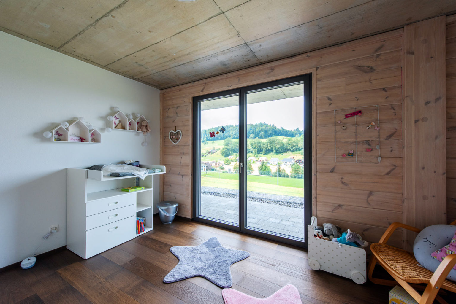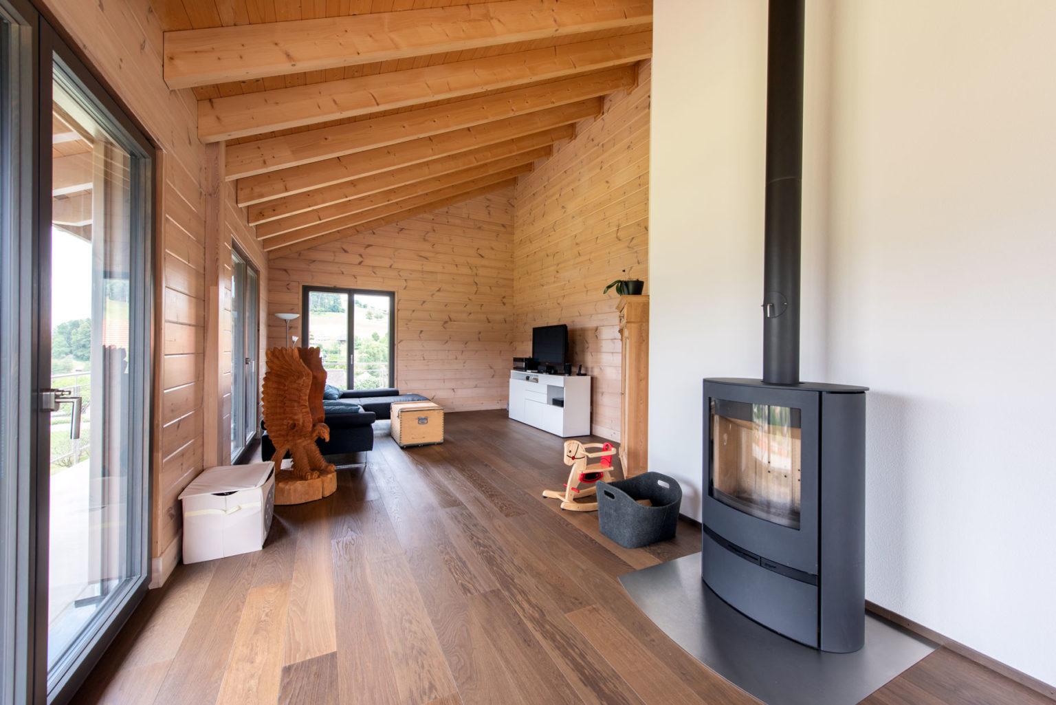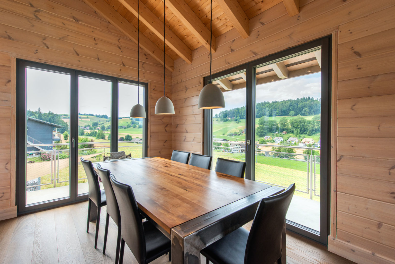 Da das Erdgeschoss des Holzhauses teils in den Hang gebaut wurde, bestehen nicht alle Außenwände aus Holz: Die ans Erdreich des Hanges grenzenden sind aus Beton, genau wie die glasierten Zimmerdecken zwischen Erdgeschoss und Obergeschoss. Oben gibt es dafür einen imposanten Sichtdachstuhl in etwa 5 Metern Raumhöhe. Ergänzt wird das Ganze mit zahlreichen großflächigen, zum Tal bodentiefen Fenstern, die reichlich natürlichen Lichteinfall gewährleisten. Um die klassische und geradlinige Architektur des Gebäudes zu betonen und dem einfallenden Tageslicht viel Fläche zur Reflektion zu bieten, wählten die Hauseigentümer drinnen leichte Ständerwände zur Raumtrennung, die sie weiß verputzen ließen. So kreierten sie ein besonders luftiges und helles Raumgefühl, das von der gemütlichen und wohngesunden Eigenschaft des Naturholzes profitiert. Außerdem entschied man sich ganz zeitgemäß für einen weitläufigen Wohn-/Ess-/Kochbereich im Obergeschoss, dessen L-Form die Küche optisch vom Wohnzimmer separiert.