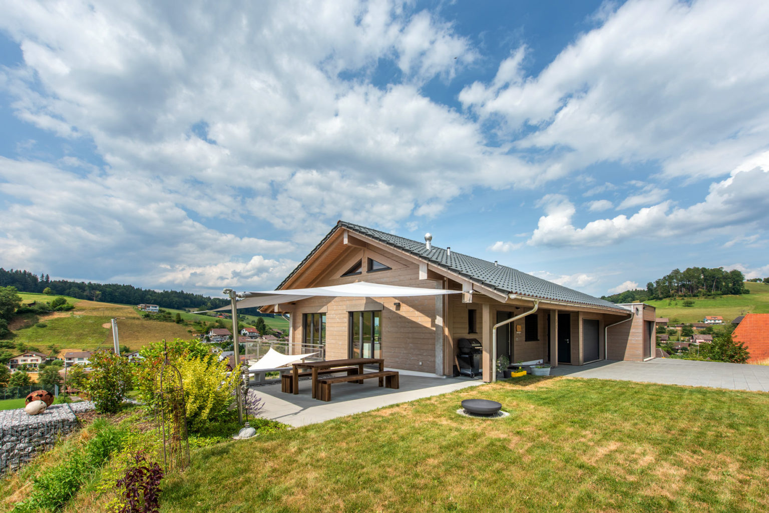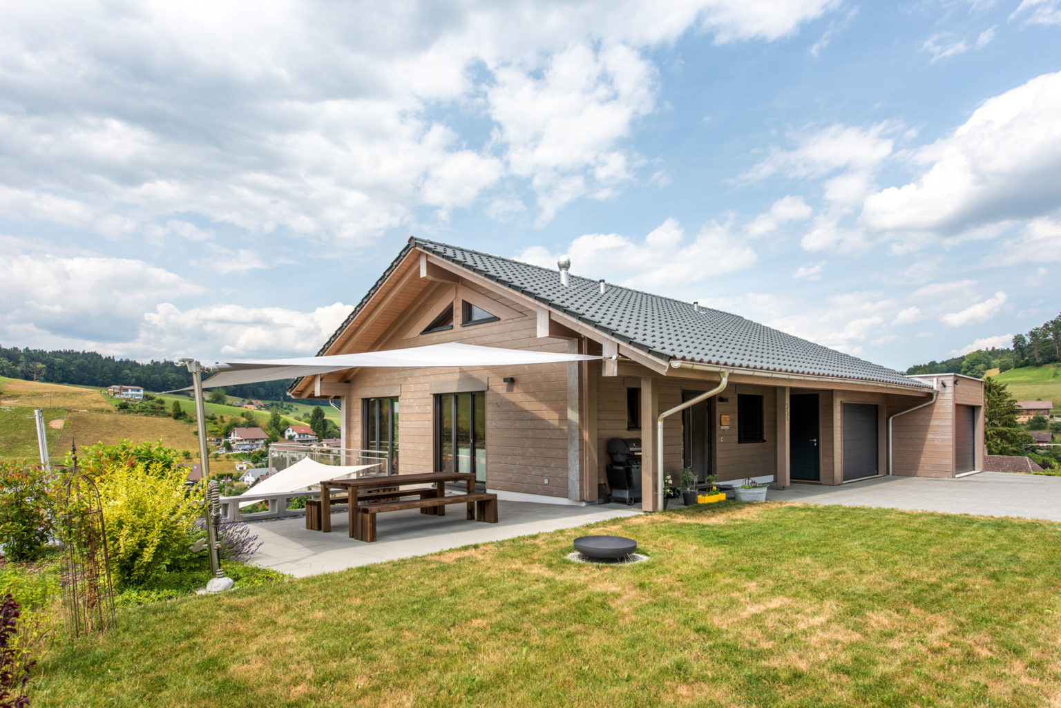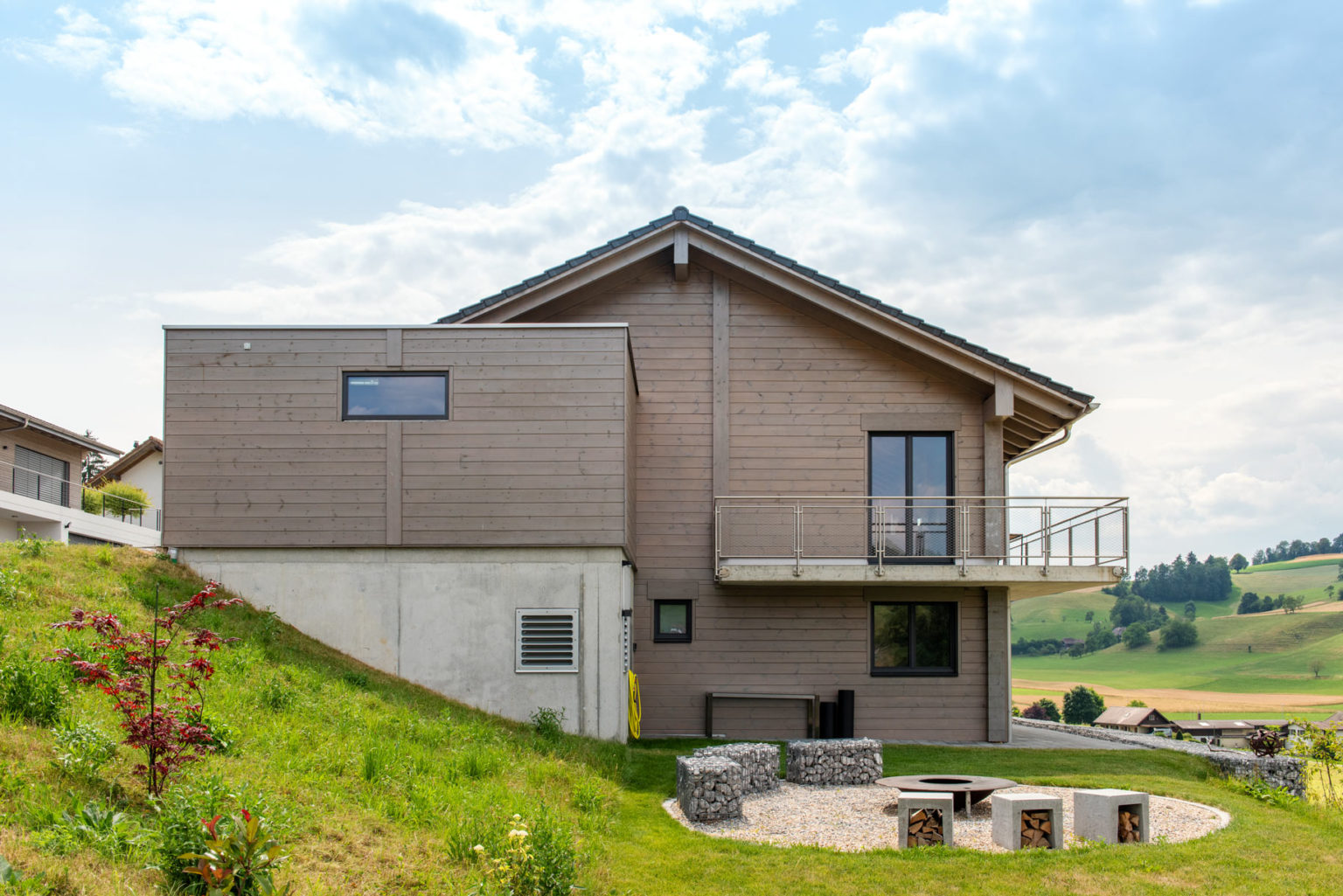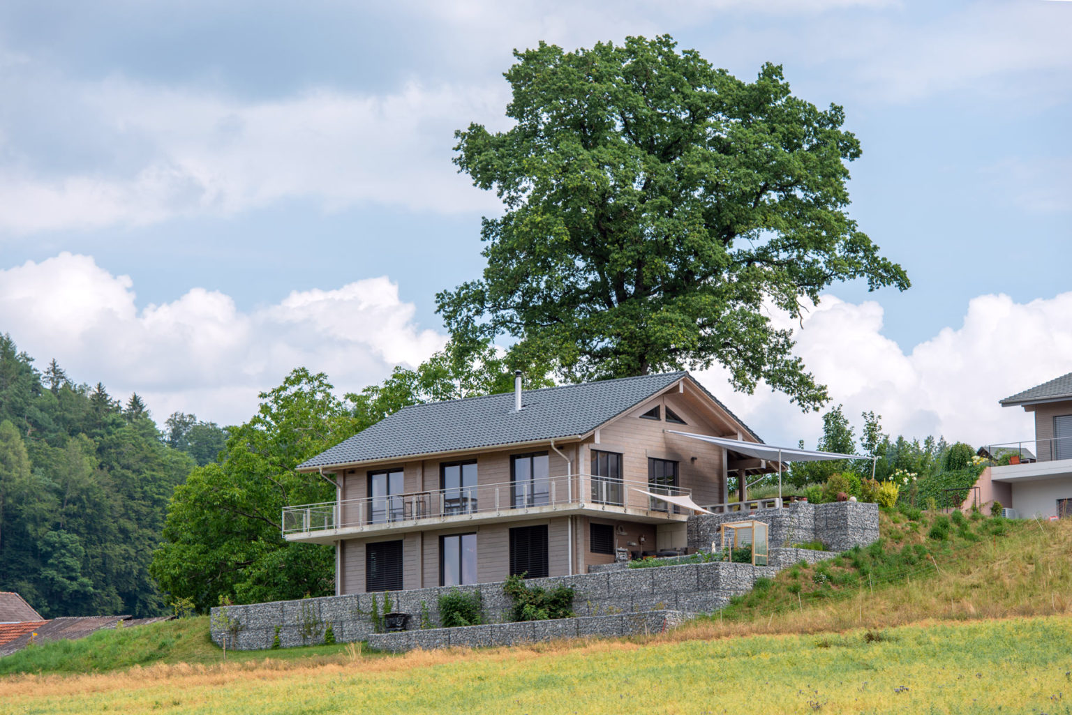 Das nachhaltig und ökologisch gebaute Holzhaus ermöglicht der Eigentümerfamilie einen kleinen ökologischen Fußabdruck, auch weil seine siebenundzwanzig Zentimeter dicken, einschaligen Wände hervorragend dämmen und sämtliche Wärme für Wasser und Fußbodenheizung mittels einer Luft/Wasser-Wärmepumpe erzeugt wird.